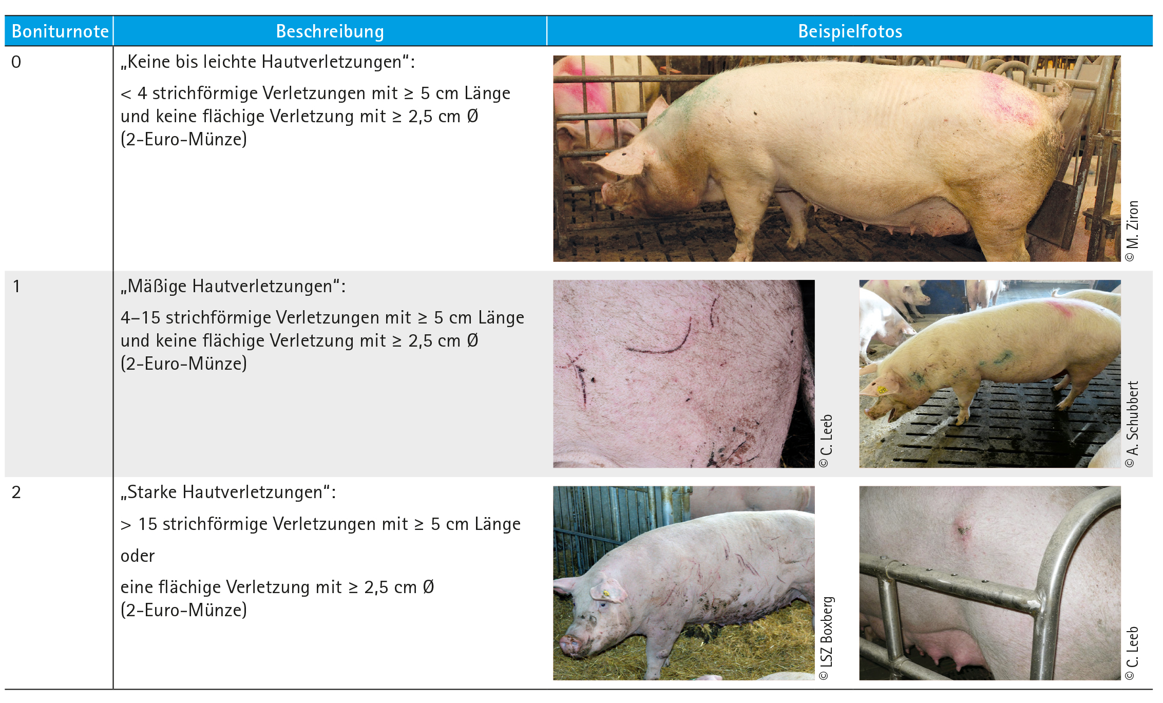 Hautverletzungen (ohne Vulva, Gesäuge und Schulterläsionen) werden mit drei Boniturnoten erfasst. Die Vergabe einer Boniturnote ist davon abhängig, wie viele strichförmige Verletzungen mit einer Länge ≥ 5 cm vorhanden sind. Flächige Verletzungen mit einem Durchmesser von ≥ 2,5 cm (2-Euro-Münze) bekommen immer die Boniturnote 2.