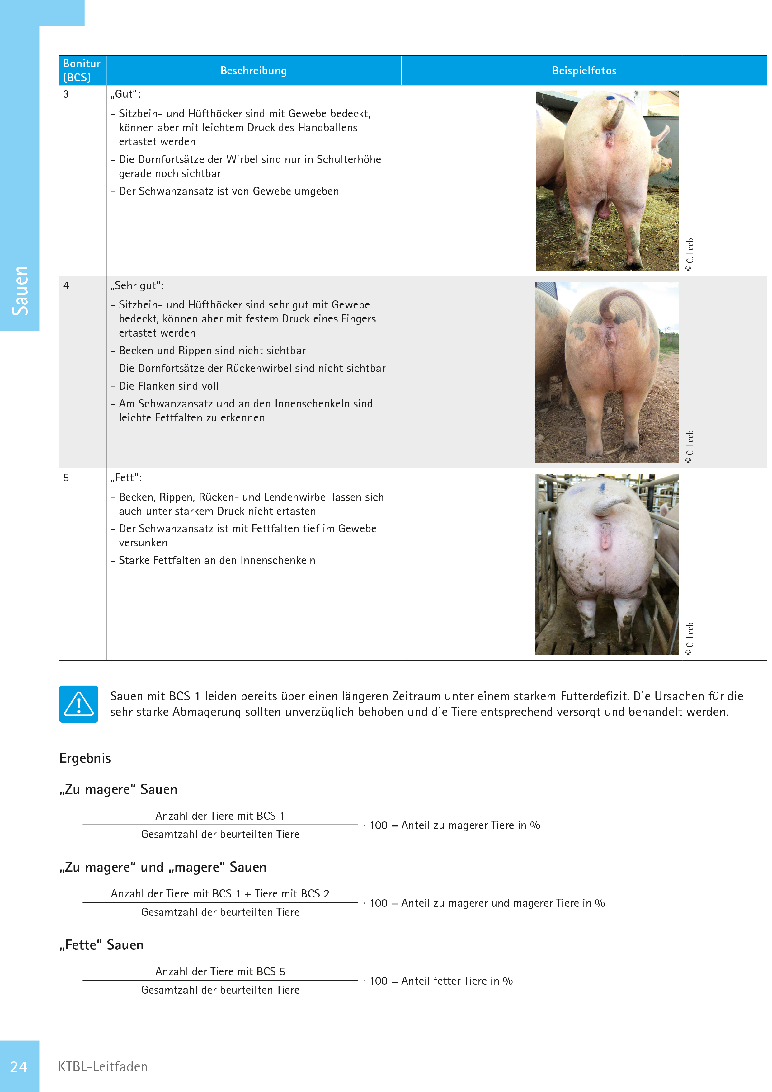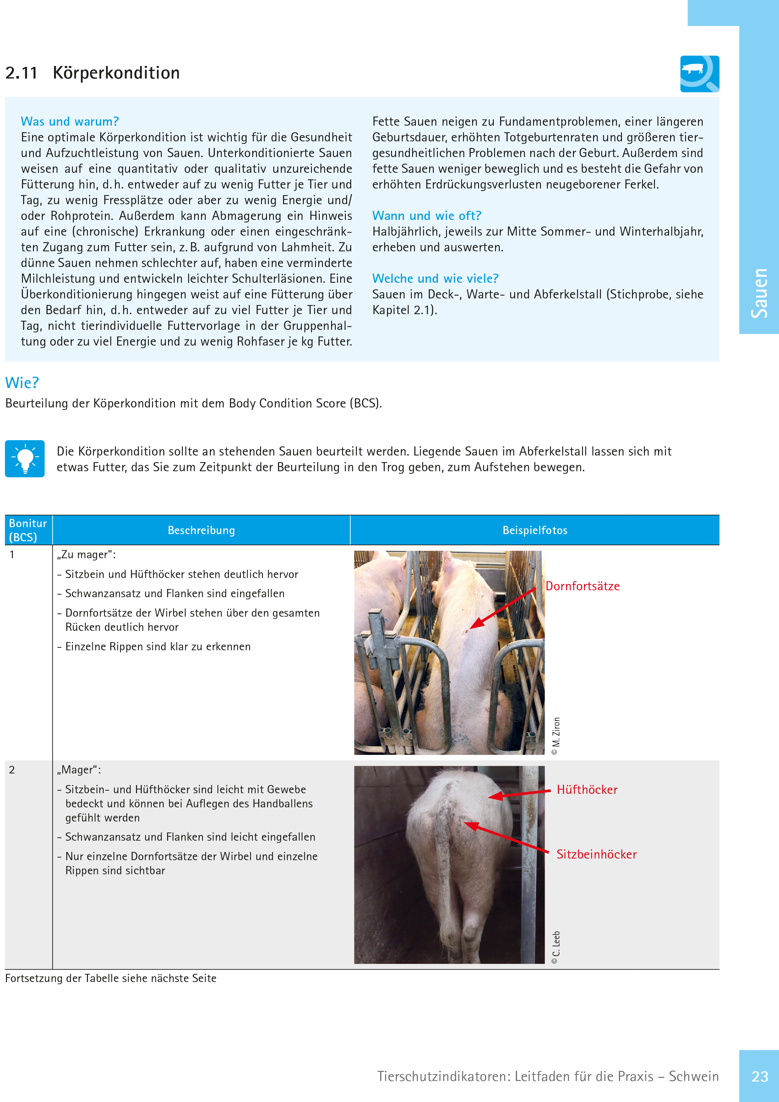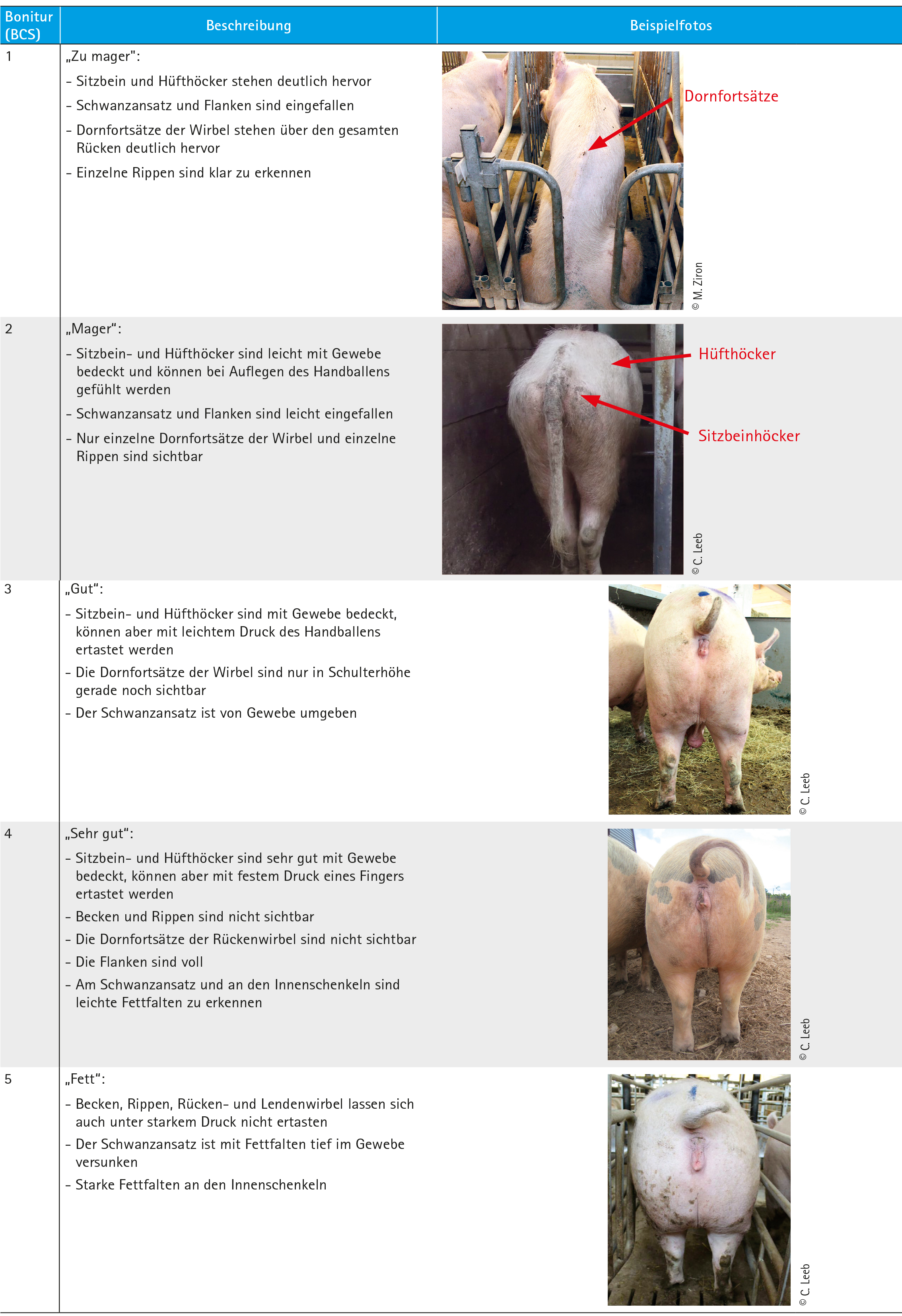 Die Körperkondition von Sauen wird mit dem Body Condition Score (BCS) erfasst. Der Body Condition Score beinhaltet fünf Boniturnoten, die verschiedene Körperzustände von Sauen beschreiben.