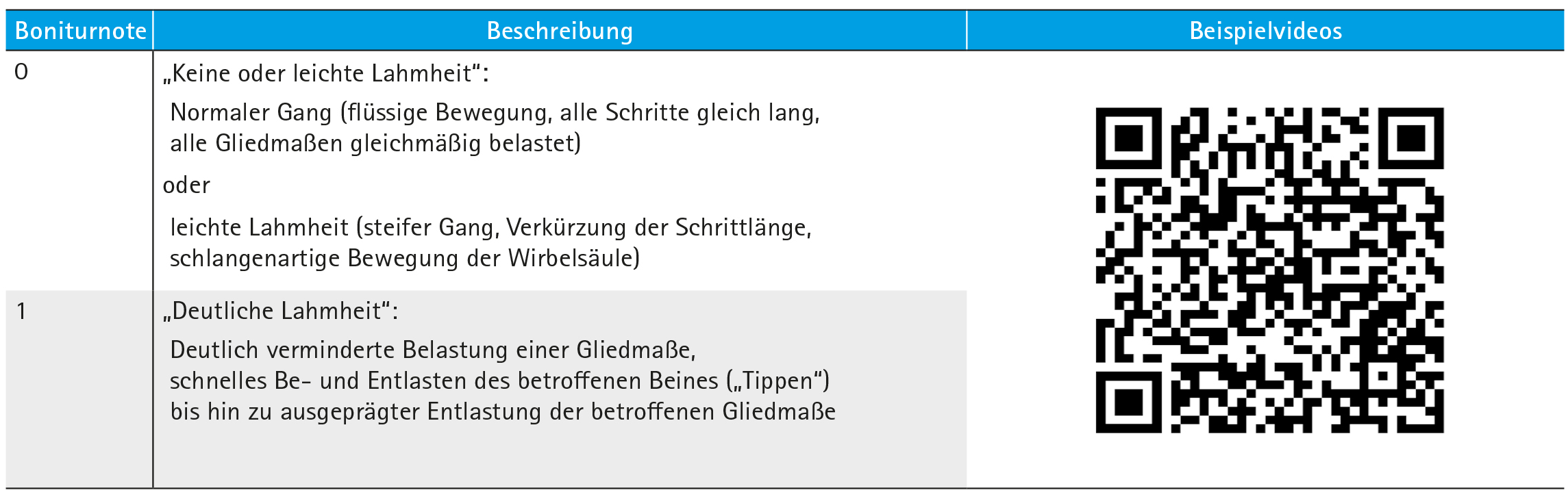 Lahmheiten werden mit Hilfe von zwei Boniturnoten beurteilt. Welche Bonitur vergeben wird, ist davon abhängig ob eine Lahmheit vorhanden ist und ob die Tiere leicht oder deutlich lahmen.
