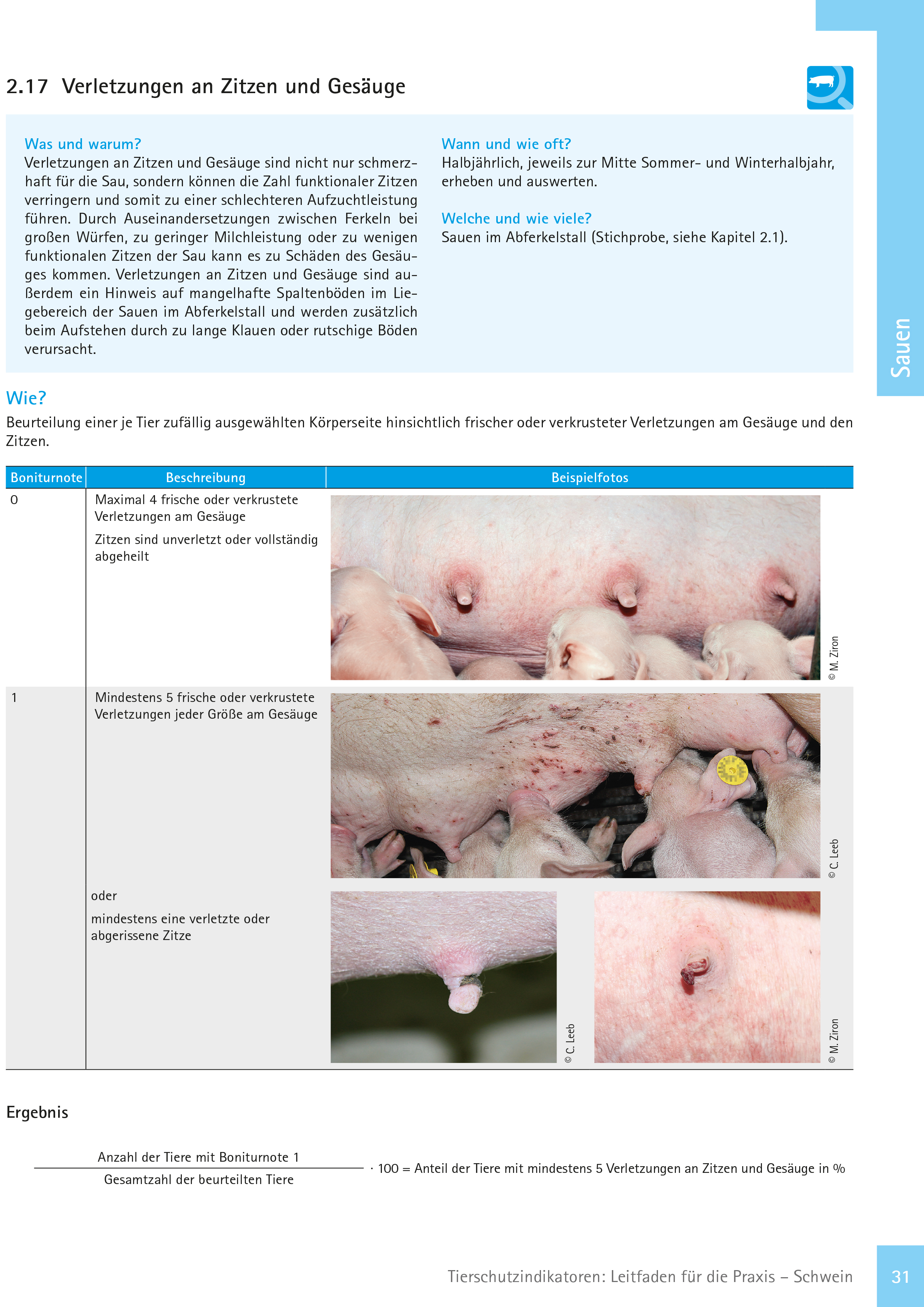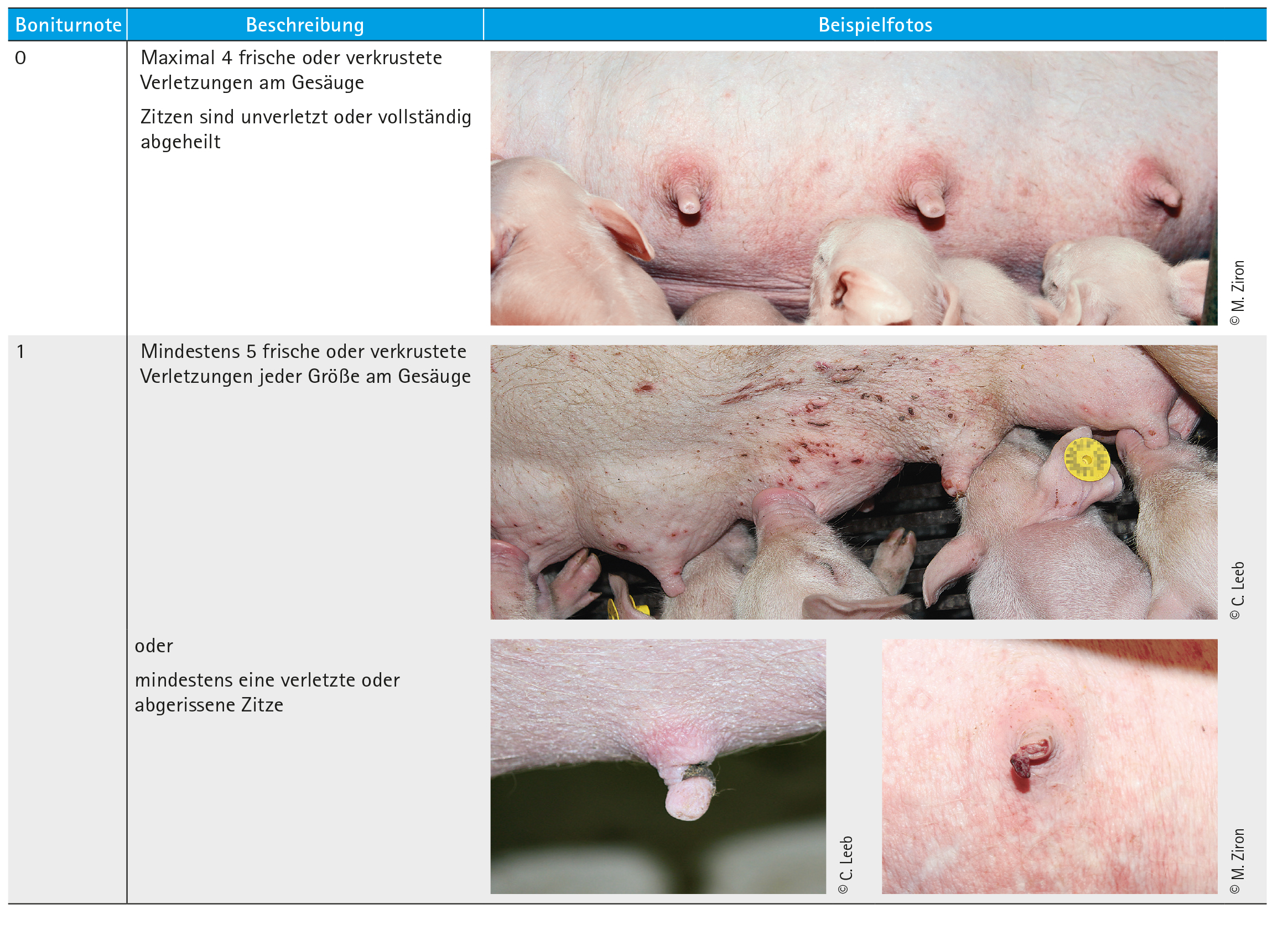 Verletzungen an Zitzen und Gesäuge werden mit zwei Boniturnoten erfasst. Welche Bonitur vergeben wird, ist davon abhängig, wie viel frische oder verkrustete Verletzungen am Gesäuge sind bzw. ob die Zitzen verletzt sind.