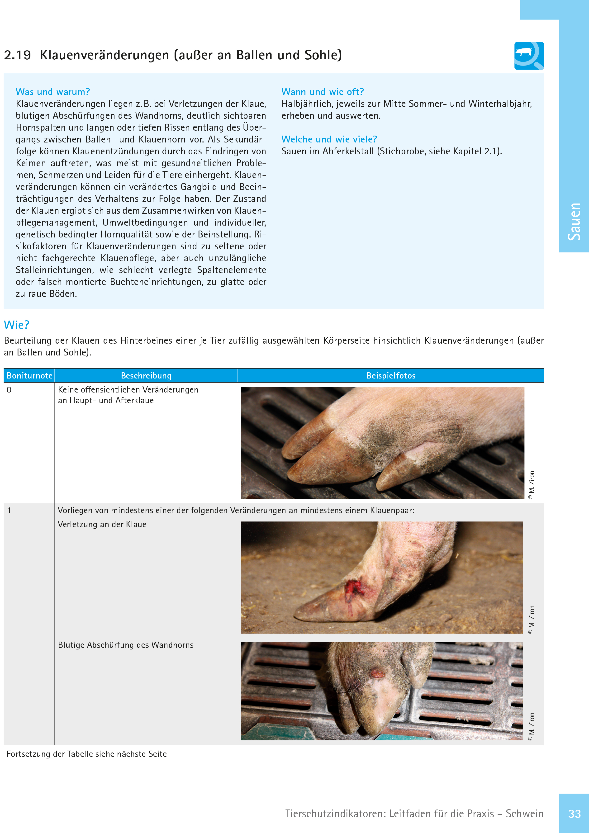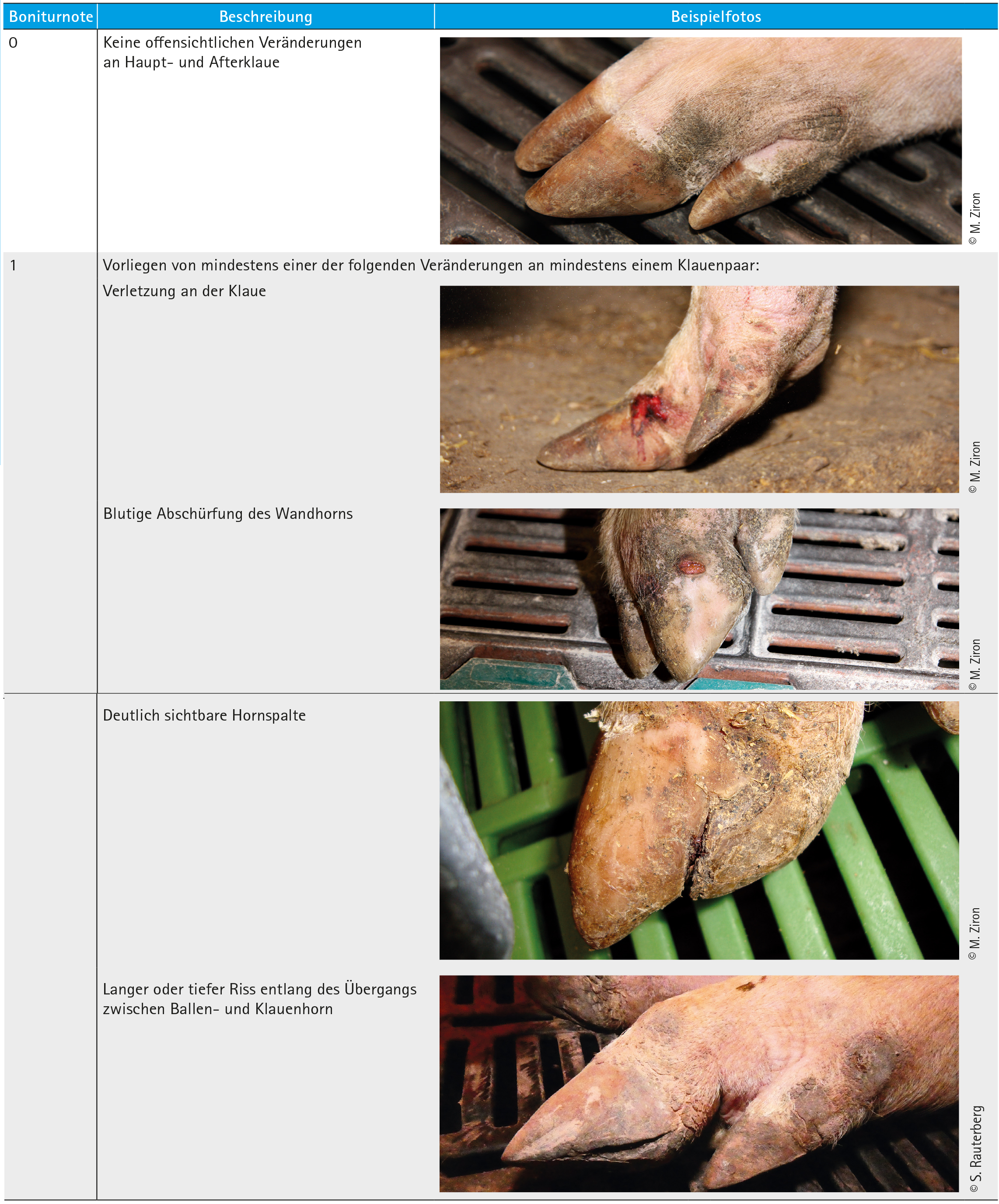Klauenveränderungen werden danach beurteilt, ob die Klauenpaare intakt sind oder nicht. Verschiedenste Klauenveränderungen erfordern die Vergabe der Boniturnote 1 und sind im Boniturschema gelistet.