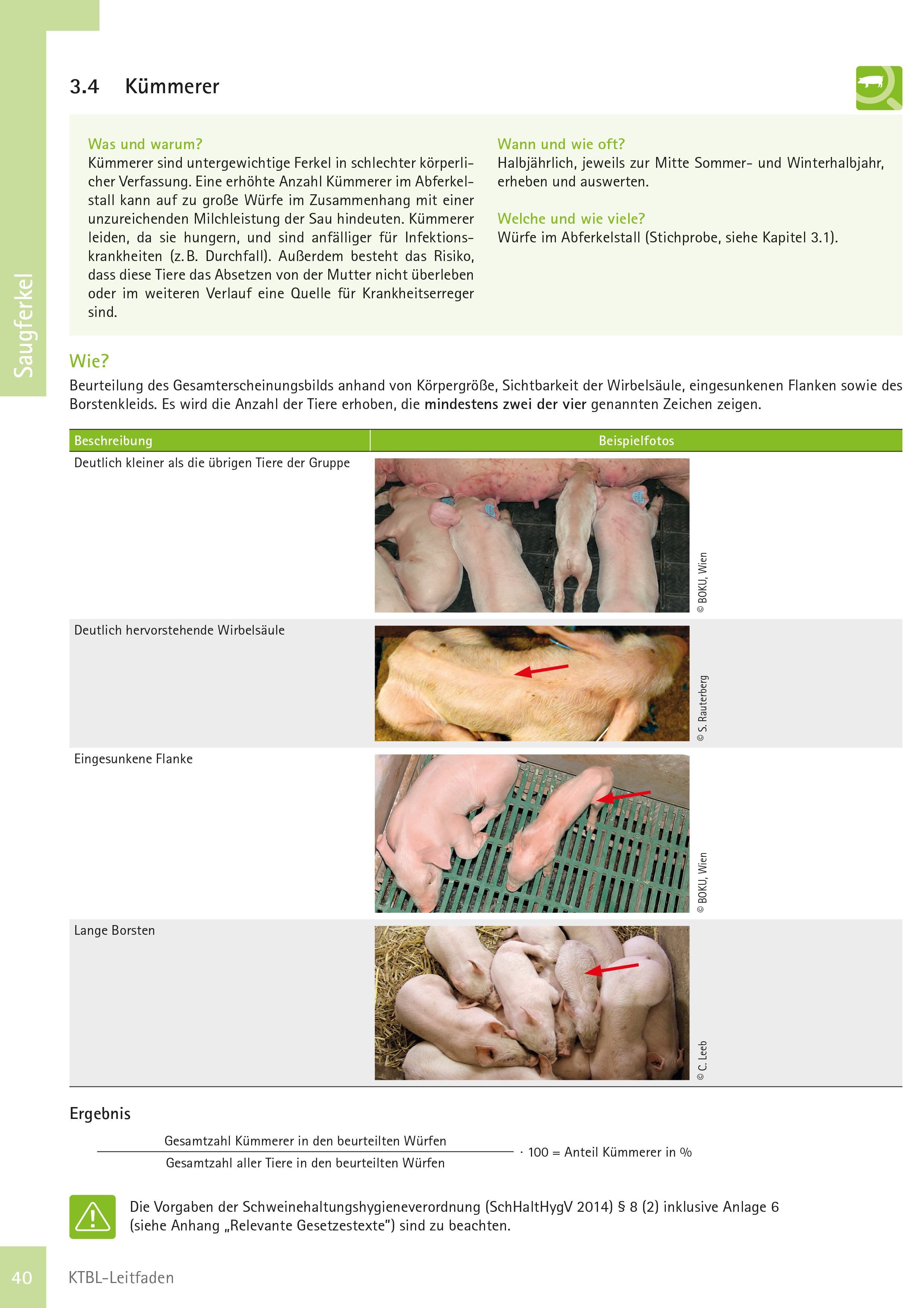 Kümmerer sind an ihrem Gesamterscheinungsbild anhand Körpergröße, Sichtbarkeit der Wirbelsäule, eingesunkener Flanken sowie des Borstenkleids identifizierbar. Als Kümmerer gilt ein Ferkel, das mindestens zwei der vier genannten Zeichen zeigt.