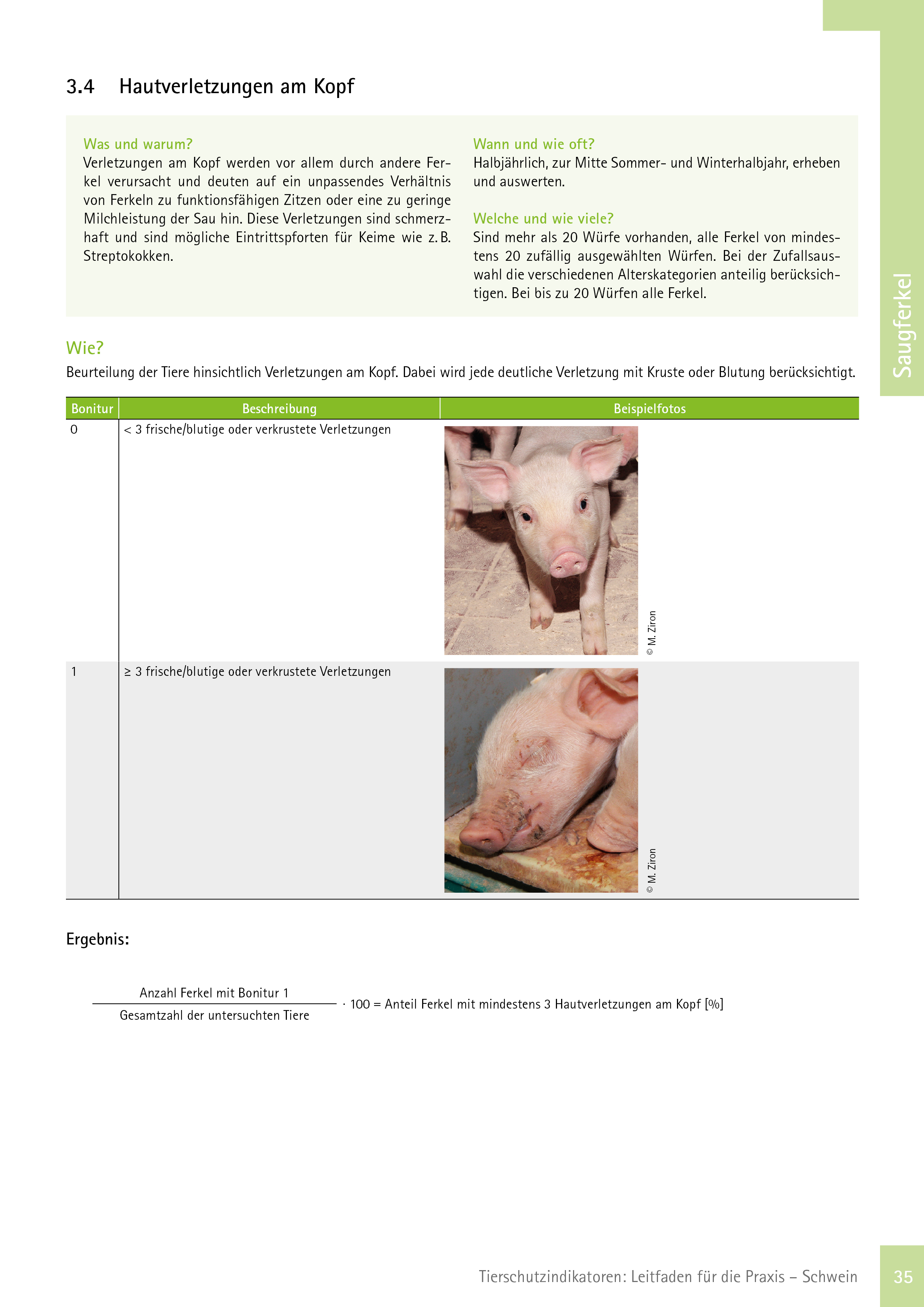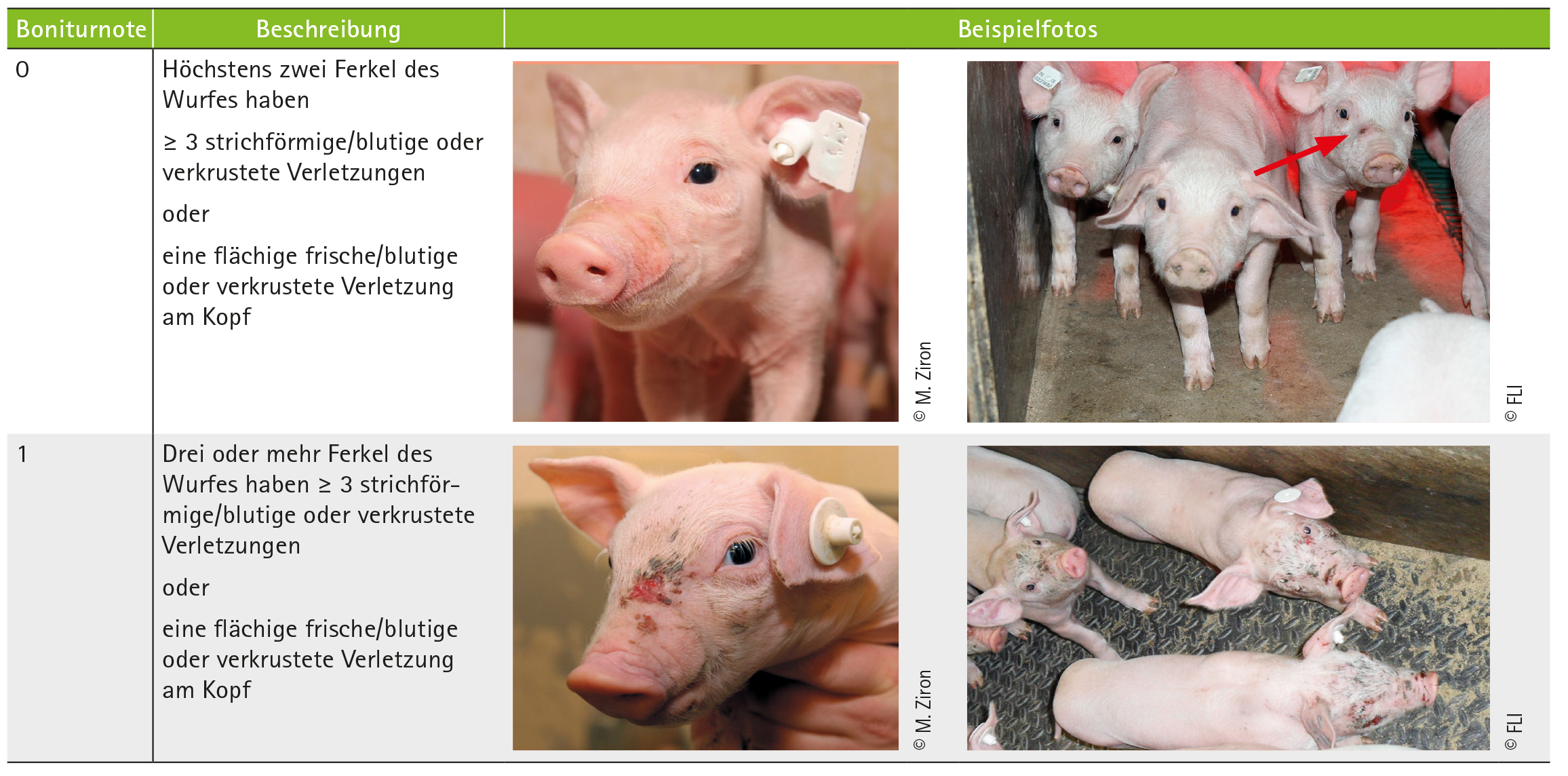 Hautverletzungen am Kopf der Saugferkel werden danach beurteilt, wie viele Ferkel eines Wurfes drei oder mehr strichförmige Hautverletzungen oder eine flächige Hautverletzung am Kopf aufweisen. Dabei wird jede frische/blutige oder verkrustete Verletzung berücksichtigt.