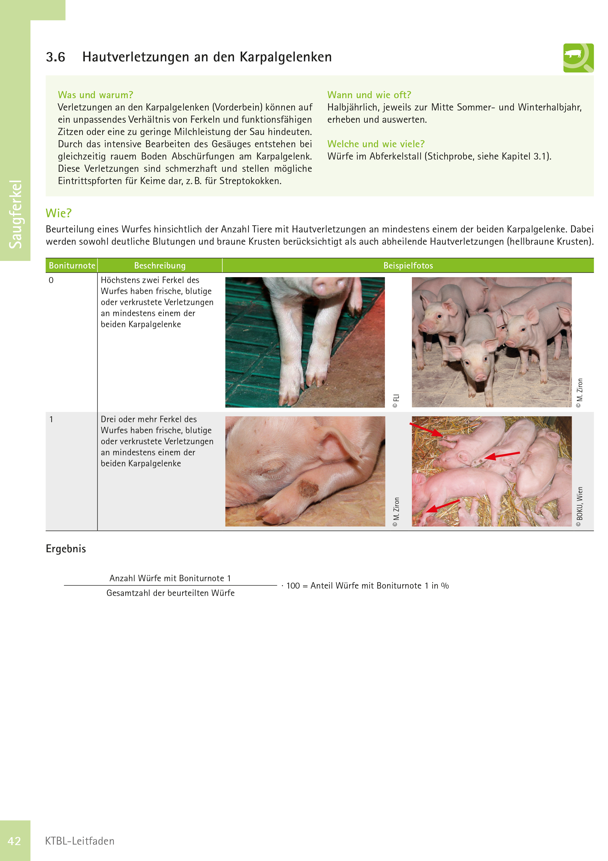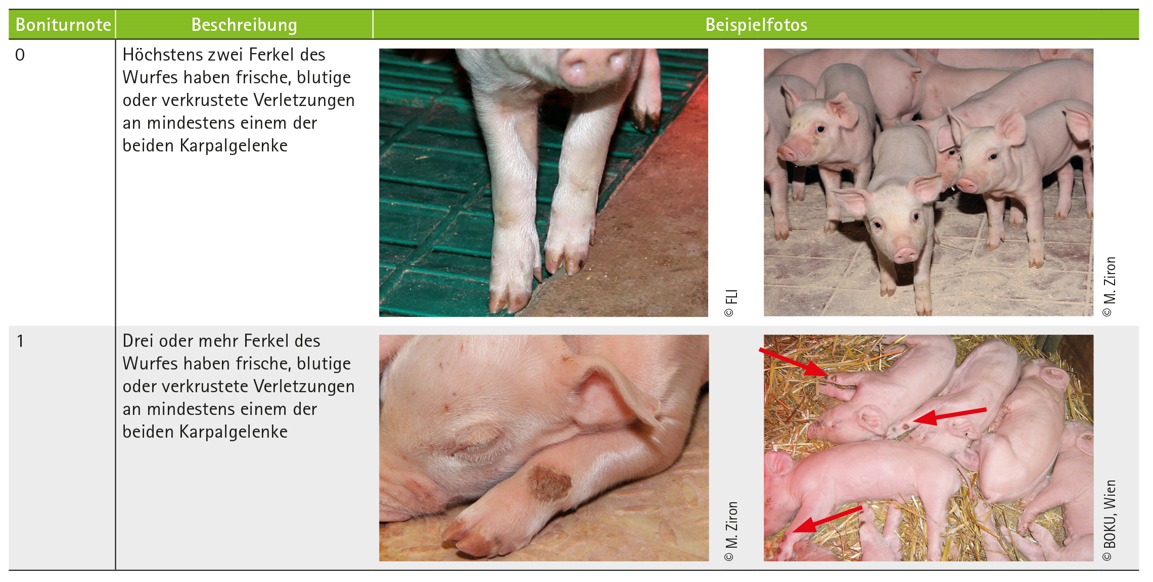 Verletzungen an den Karpalgelenken werden danach beurteilt, wie viele Ferkel eines Wurfes Hautverletzungen an mindestens einem Karpalgelenk aufweisen. Dabei wird jede frische/blutige oder verkrustete Verletzung berücksichtigt