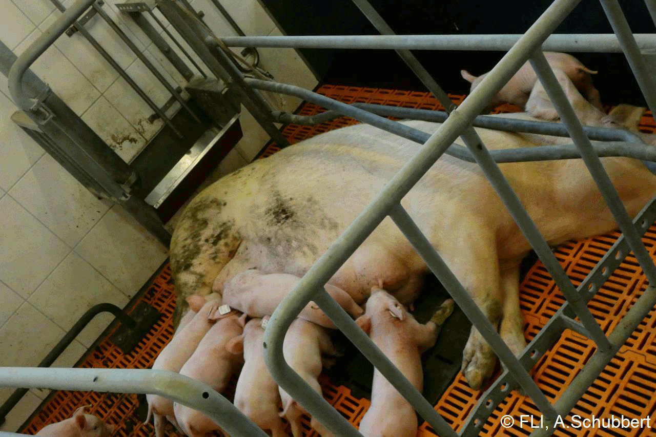 Kotauflagerungen (rot) erkennen Sie daran, das frischer bzw. getrockneter Kot an der Körperoberfläche der Sau haftet. Im Gegensatz dazu werden Verfärbungen (grün) nur durch Urin, Staub und/oder Futterresten verursacht.