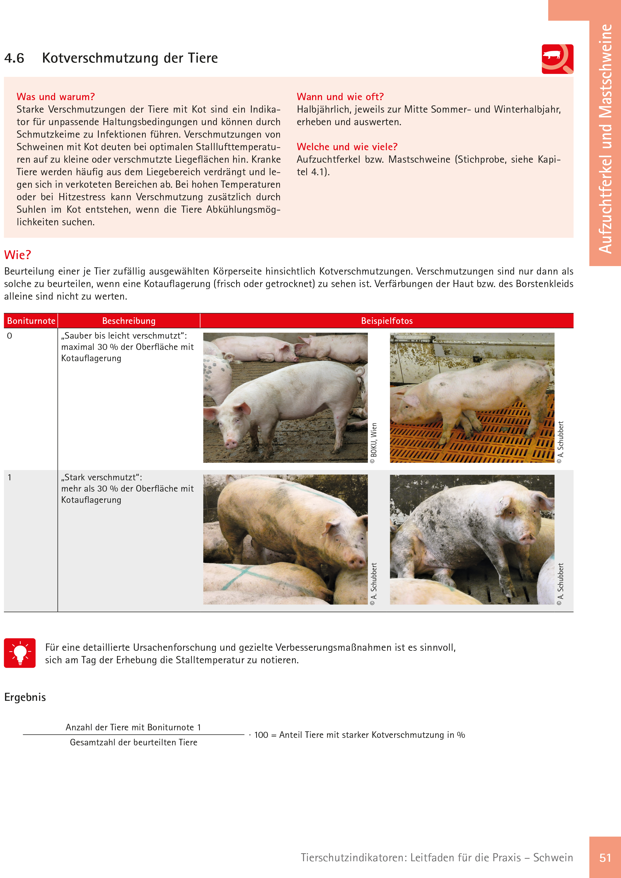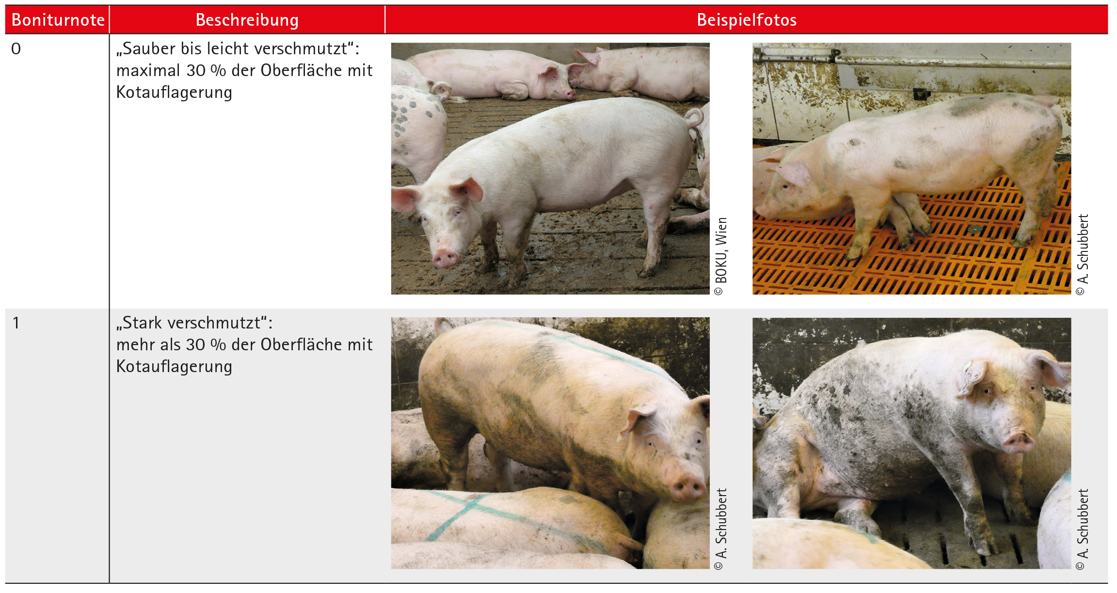 Kotverschmutzungen werden mit Hilfe von zwei Boniturnoten erfasst. Welche Boniturnote das Schwein erhält, ist davon abhängig, wie viel Prozent seiner Körperoberfläche mit frischen oder getrockneten Kotauflagerungen bedeckt ist.