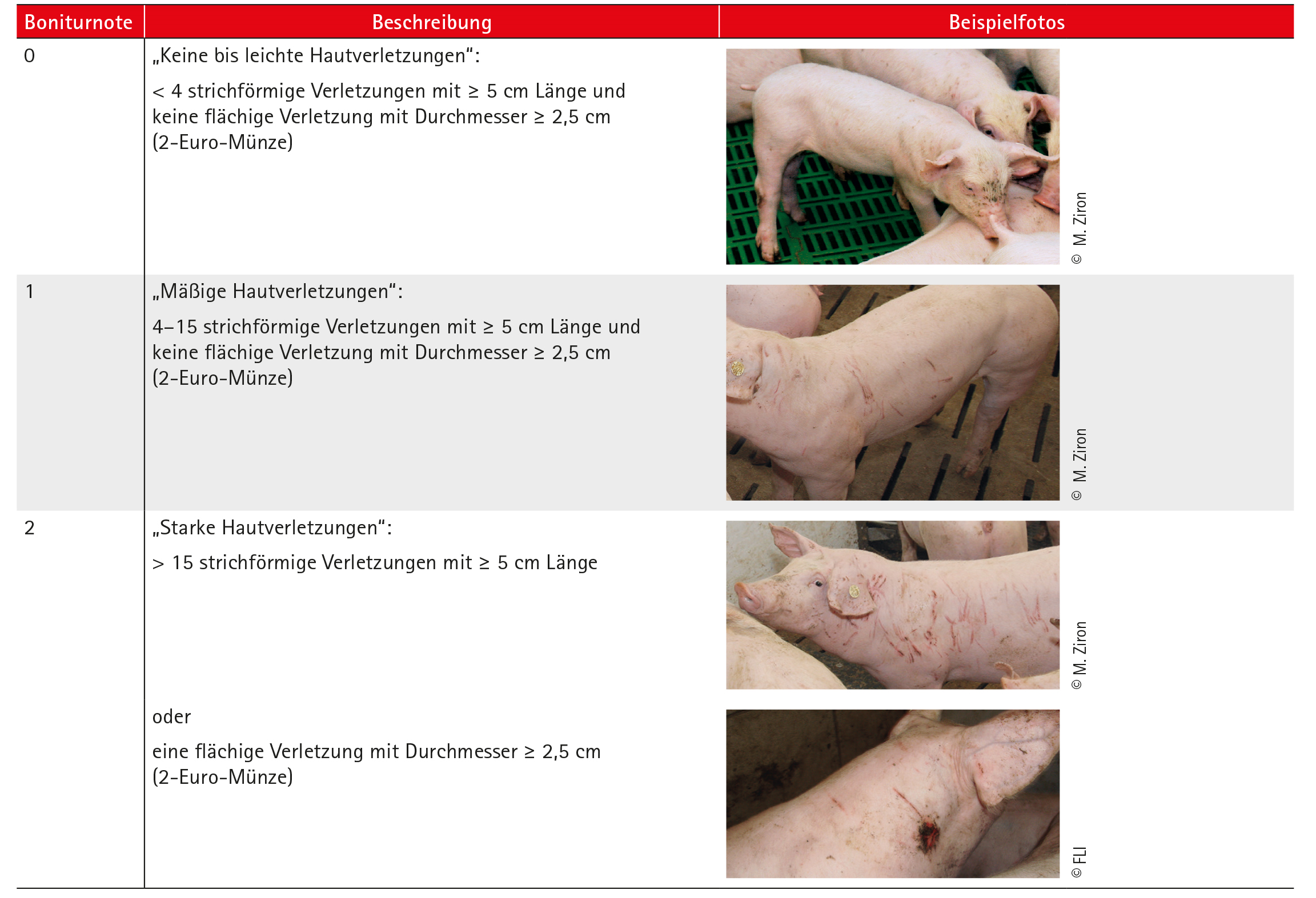 Hautverletzungen (ohne Schwanz und Ohren) werden mit drei Boniturnoten erfasst. Die Vergabe einer Boniturnote ist davon abhängig, wie viele strichförmige Verletzungen mit einer Länge ≥ 5 cm vorhanden sind. Flächige Verletzungen mit einem Durchmesser von ≥ 2,5 cm (2-Euro-Münze) bekommen immer die Boniturnote 2.