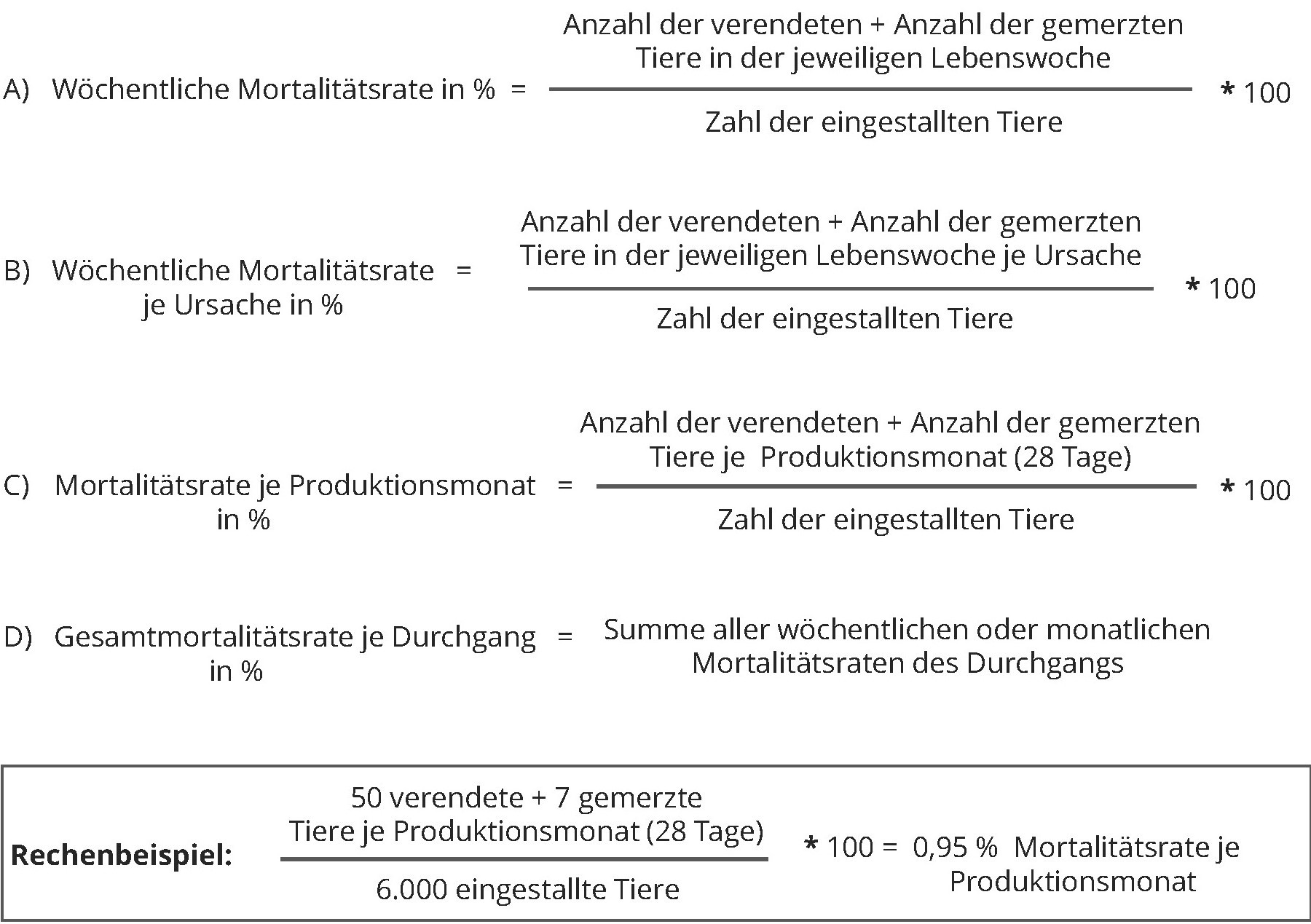 Die Gesamtzahl verendeter und gemerzter Tiere wird täglich erhoben und einmal in der Woche mit Hilfe der Berechnungsformeln aus dem KTBL-Leitfaden (S. 25) ausgewertet. Zählen Sie alle in der jeweiligen Woche verendeten und gemerzten Tiere zusammen. Dividieren Sie die Gesamtsumme durch die Zahl der ursprünglich eingestallten Tiere. Multiplizieren Sie das Ergebnis mit der Zahl 100, um die wöchentliche Mortalitätsrate in Prozent zu erhalten (A). Führen Sie die genannten Rechenschritte jeweils für alle Tierverluste je Ursache durch (B). Darüber hinaus werden die Mortalitätsraten je Produktionsmonat (C) und die Gesamtmortalitätsrate je Durchgang (D) in Prozent berechnet.