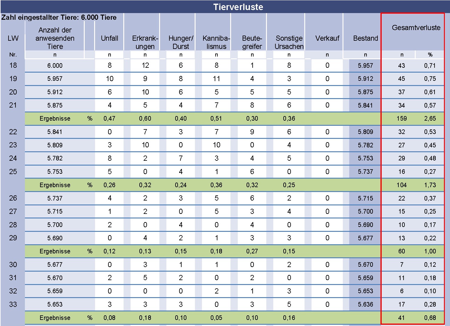 Tierverluste setzen sich aus im Stall verendeten und gemerzten Tieren zusammen. Zur effektiven Planung von Managementmaßnahmen bei erhöhten Tierverlusten ist es sinnvoll, neben der Anzahl toter Tiere auch die jeweilige Todesursache zu erfassen. Zusätzlich sollte auch die Mortalitätsrate je Durchgang zum innerbetrieblichen Vergleich über mehrere Durchgänge herangezogen werden. Tierverluste können z.B. durch Unfälle (Erdrücken, Verletzung), Erkrankungen (z.B. Infektionen), Verdursten/Verhungern, Kannibalismus oder Beutegreifer entstehen.