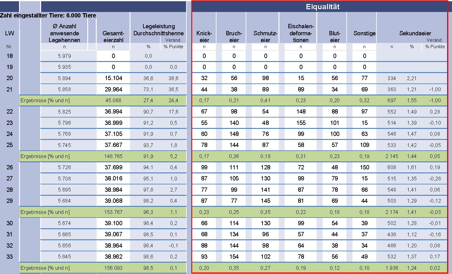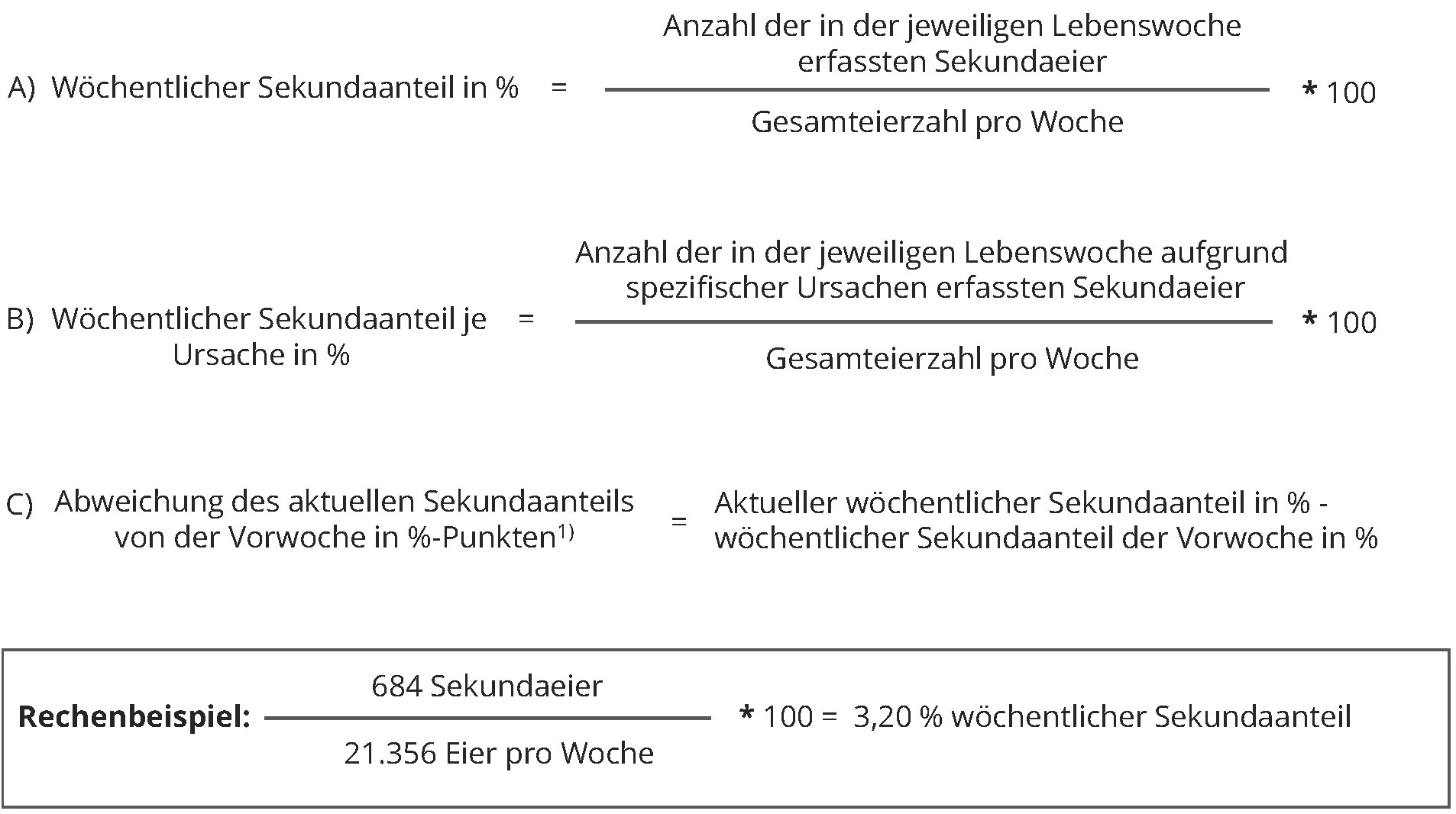 Die tägliche Anzahl von Sekundaeiern wird in den meisten Betrieben routinemäßig erfasst, da diese zu den wichtigsten Produktionskennzahlen gehört. Zu den Sekundaeiern zählen alle Eier, die nicht vermarktungsfähig sind oder nur mit Abschlägen an die Verarbeitungsindustrie verkauft werden können (z.B. Knickeier, Brucheier, Schmutzeier, Bluteier oder Eischalendeformationen). Für die betriebliche Eigenkontrolle wird der wöchentliche Sekundaanteil verwendet, da die täglich gelegten Sekundaeier stark schwanken können und somit nicht aussagekräftig genug sind. Darüber hinaus wird die Abweichung des aktuellen Sekundaanteils von der Vorwoche in Prozentpunkten berechnet, um einen plötzlichen Anstieg der Sekundaeier erkennen zu können.