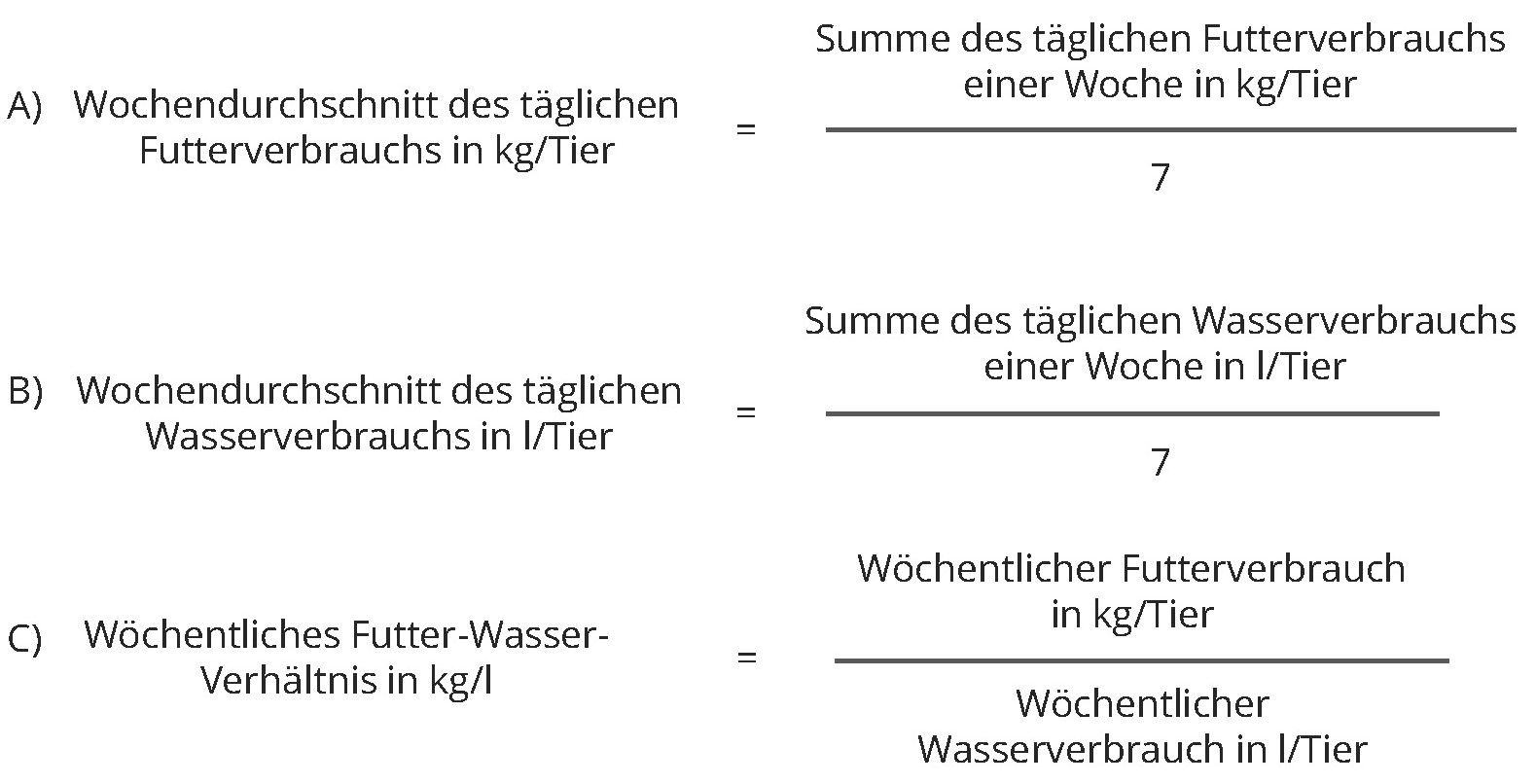 Der Futter- und Wasserverbrauch wird täglich erhoben und einmal in der Woche mit Hilfe der Berechnungsformeln aus dem KTBL-Leitfaden (S. 28) ausgewertet. Zur Berechnung des Wochendurchschnitts des täglichen Futterverbrauchs werden die täglichen Futterverbräuche einer Woche in Kilogramm pro Tier addiert und durch 7 Wochentage dividiert (A). Führen Sie diese Rechenschritte analog zur Berechnung des Wochendurchschnitts des täglichen Wasserverbrauchs in Liter pro Tier durch (B). Zusätzlich wird der wöchentliche Futterverbrauch in Kilogramm pro Tier durch den wöchentlichen Wasserverbrauch in Liter pro Tier dividiert, um das wöchentliche Futter-Wasser-Verhältnis in Kilogramm pro Liter zu erhalten (C).