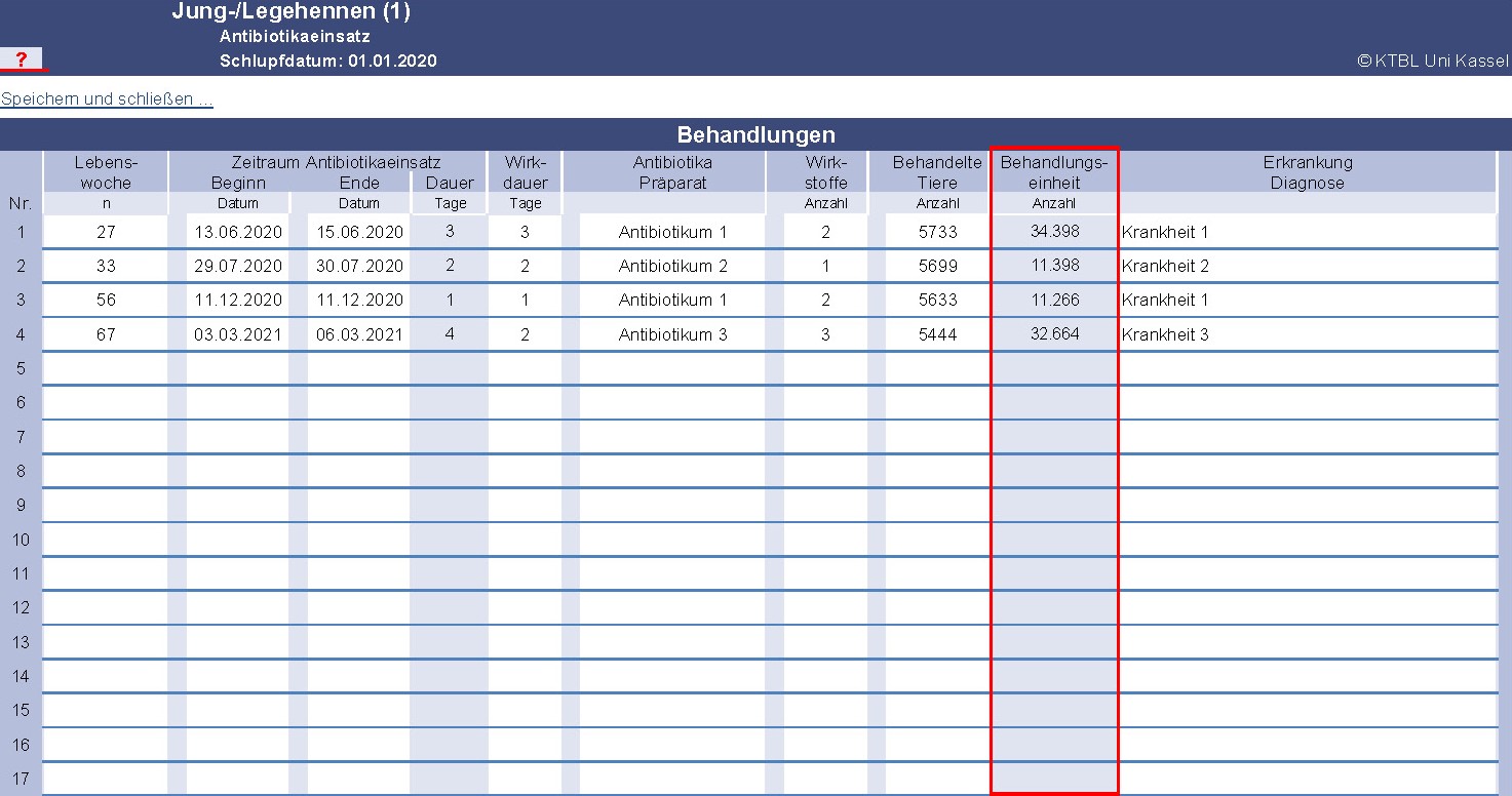 Die im Laufe des Durchgangs verabreichten Antibiotikamengen werden in allen Betrieben standardmäßig erfasst. Zur effektiven Planung von Managementmaßnahmen bei erhöhtem Antibiotikaeinsatz ist es sinnvoll, zusätzlich die Krankheitsdiagnose zu notieren. Relevant für die Berechnung des Antibiotikaeinsatzes pro Durchgang sind die Behandlungsdauer, die Anzahl