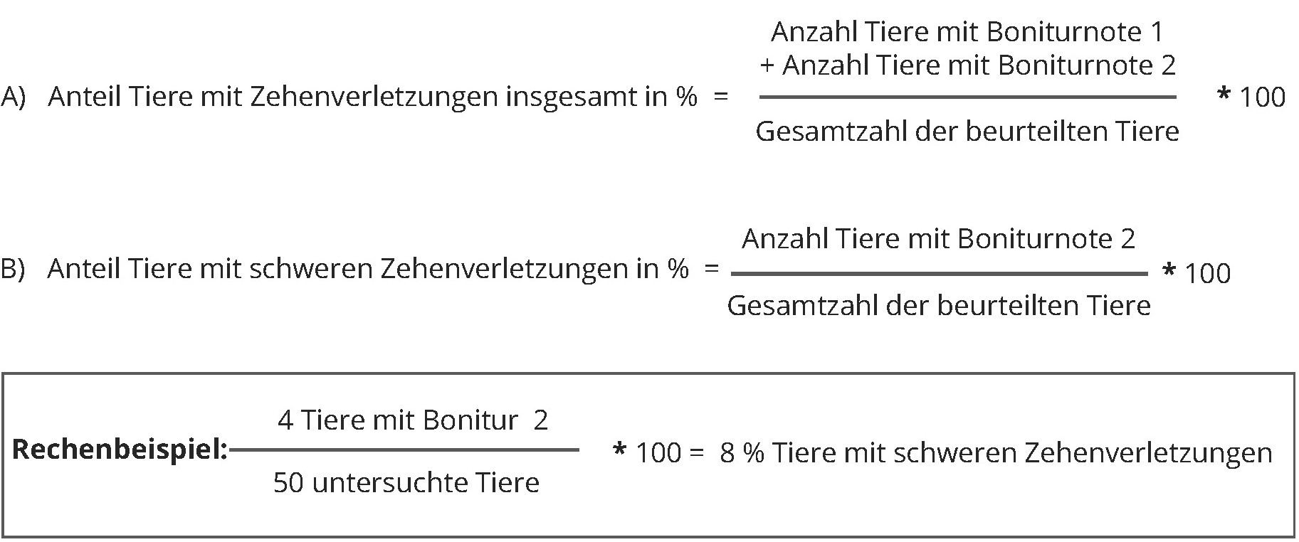Die Beurteilung der Zehenverletzungen erfolgt durch die Vergabe von 3 Boniturnoten (0, 1, 2). Wenn Zehenverletzungen vorhanden sind, entscheidet sich anhand der Anzahl (Schwellenwert 3 Verletzungen) oder der Größe (Schwellenwert 1 cm), ob Boniturnote 1