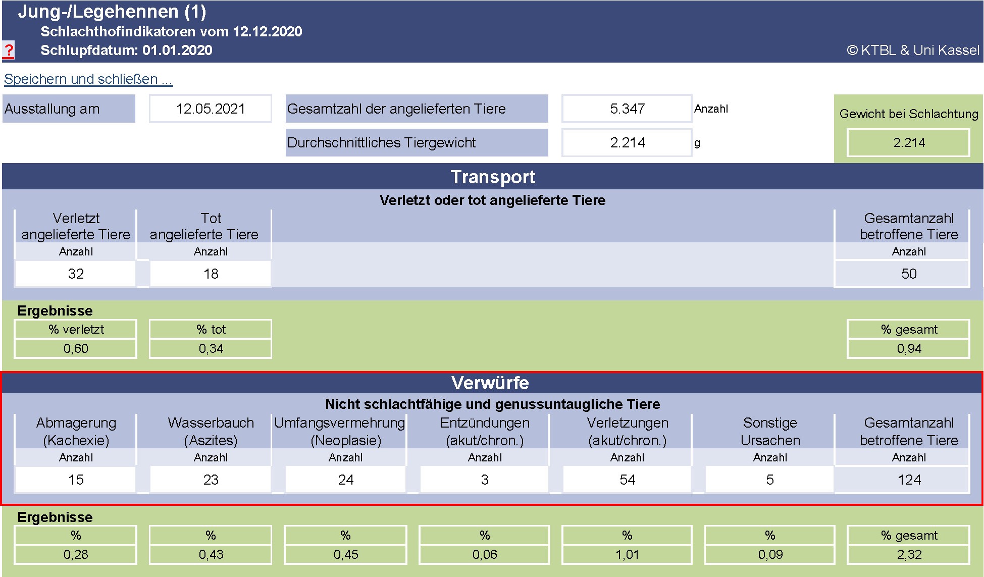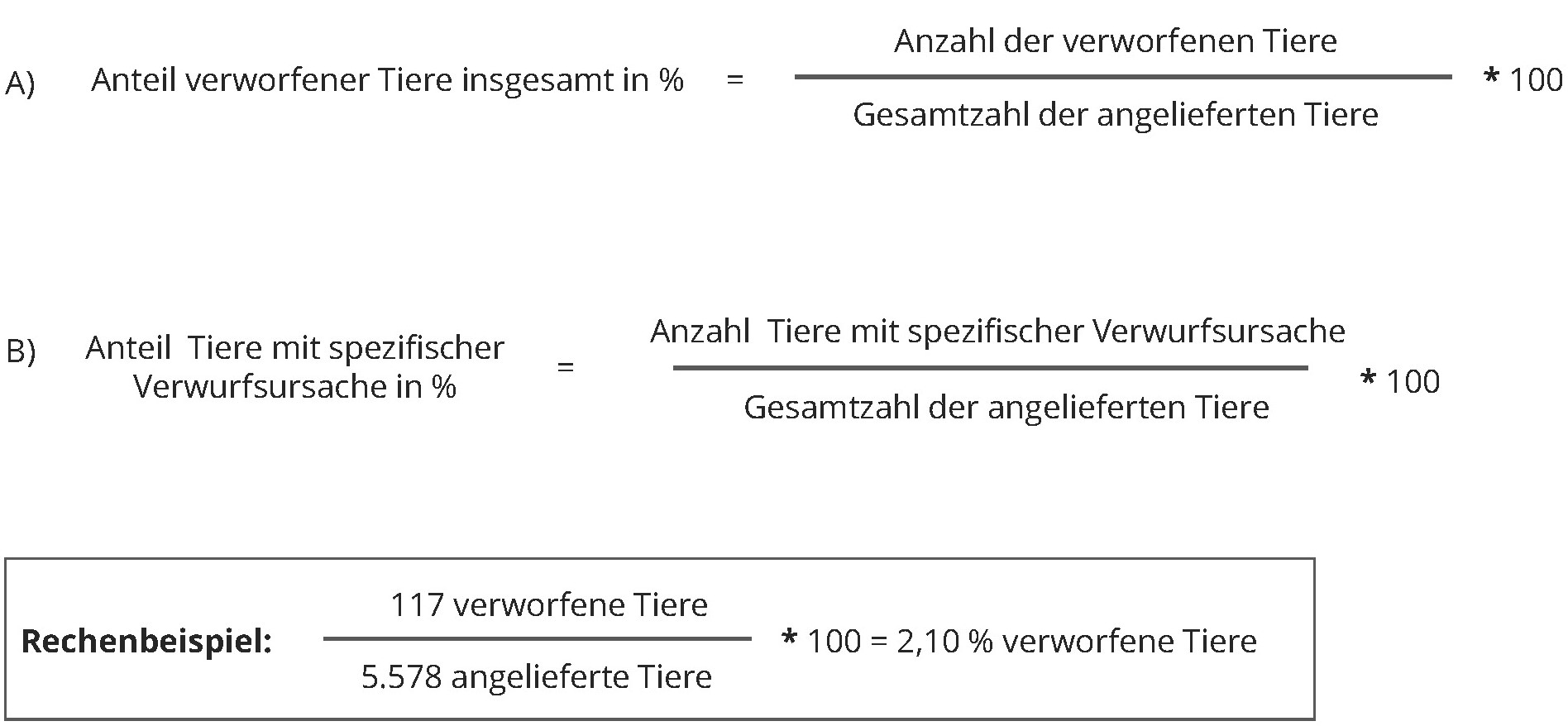 Die Gesamtzahl verworfener Tiere wird aus der Schlachthofauswertung entnommen und im Anschluss mit Hilfe der Berechnungsformeln aus dem KTBL-Leitfaden (S. 33) ausgewertet: Zählen Sie alle im jeweiligen Durchgang verworfenen Tiere zusammen. Dividieren Sie die Gesamtsumme durch die Gesamtzahl der angelieferten Tiere. Multiplizieren Sie das Ergebnis mit der Zahl 100, um den Anteil insgesamt verworfener Tiere