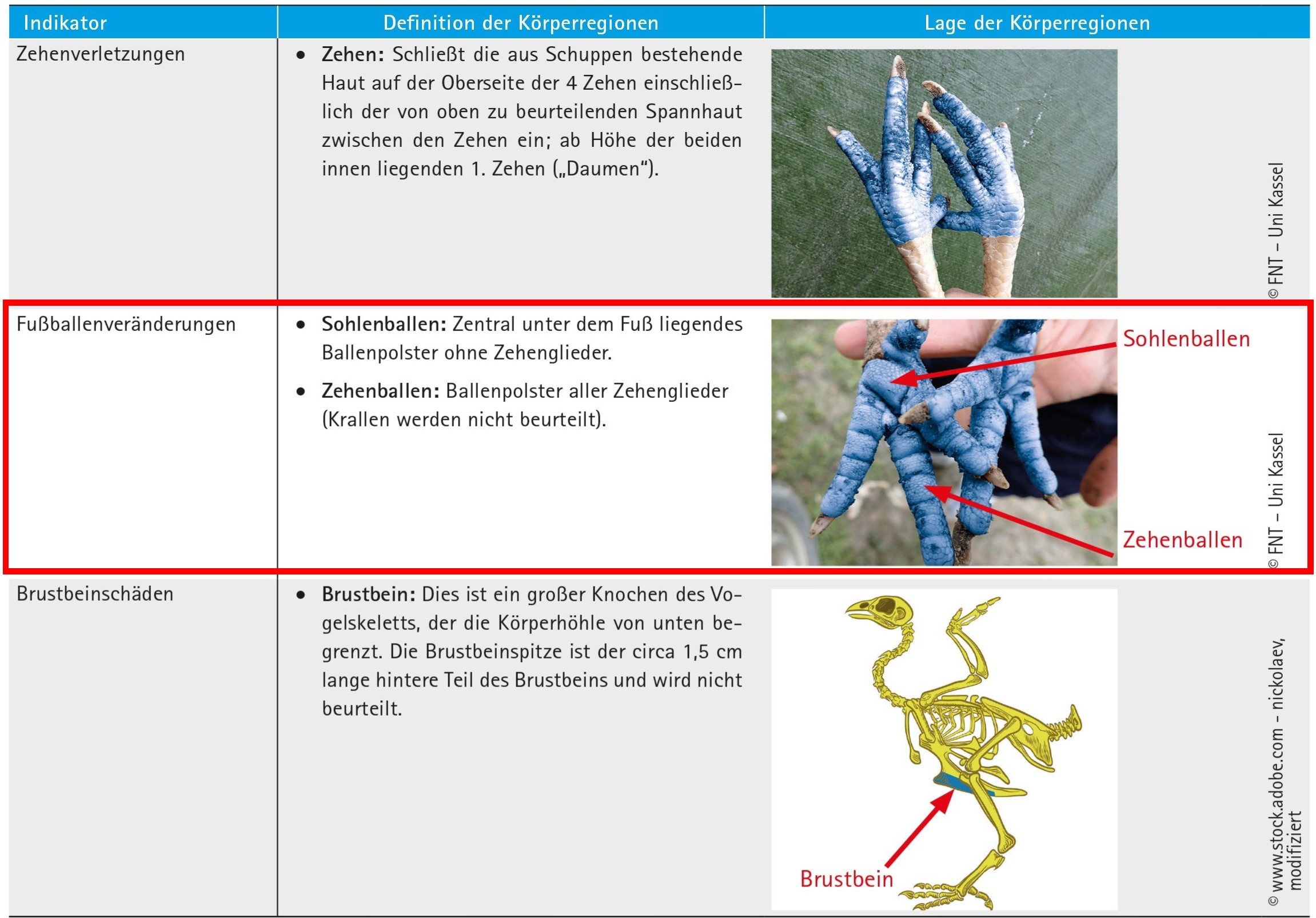 In diesem Bereich stellen wir Ihnen die für die Erhebung des Indikators "Fußballenveränderungen" relevante Körperregion vor. Die bläulich eingefärbten Bereiche entsprechen dabei den fachlich begründeten Vorgaben des KTBL-Leitfadens. In den Erklärtexten neben den Bildern erhalten Sie nähere Informationen zur Definition der jeweiligen Körperregionen bei Legehennen. Falls Sie sich eine Vergrößerung der Bilder ansehen möchten, klicken Sie bitte auf die Grafik.