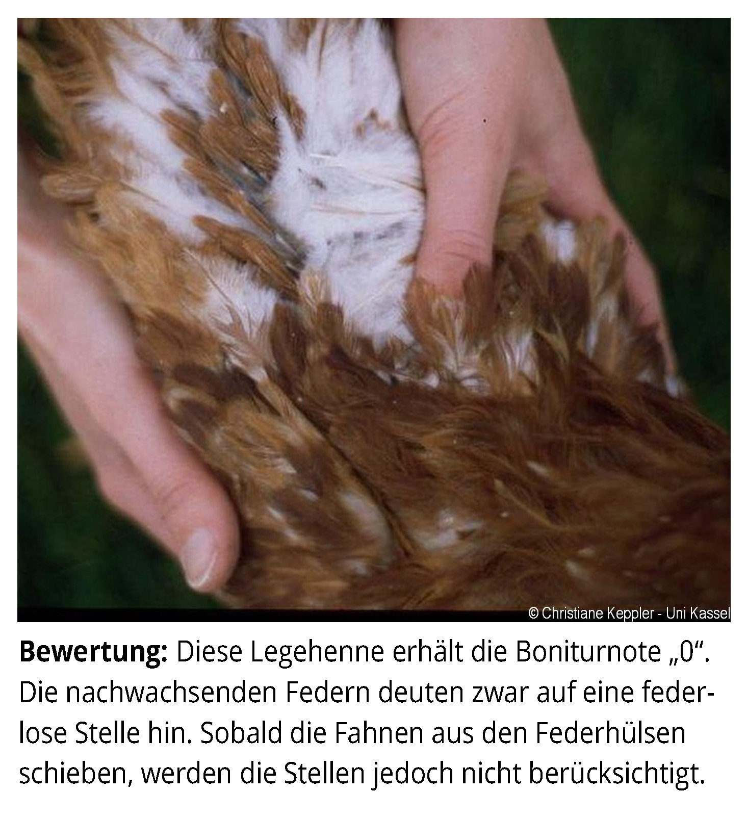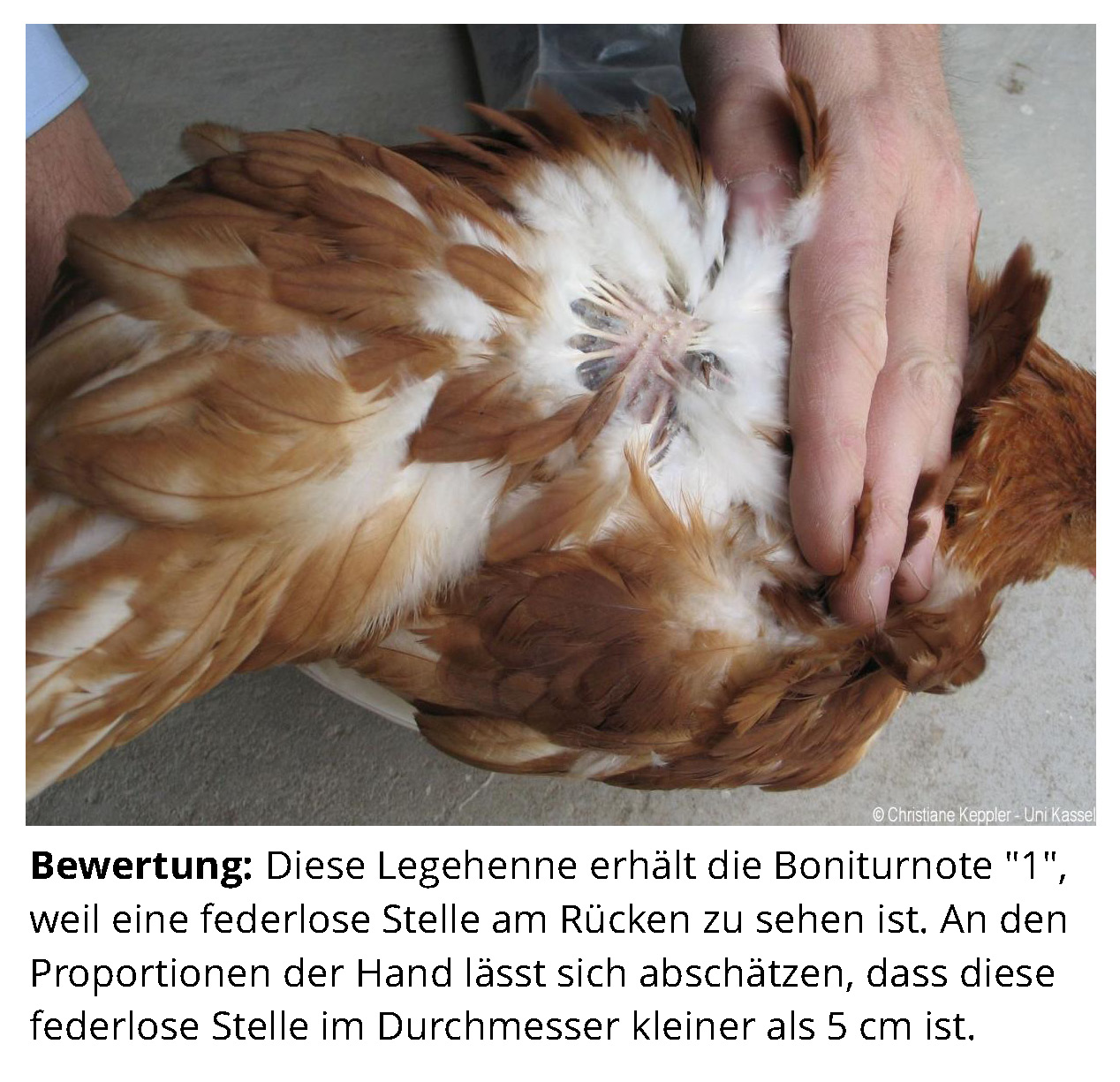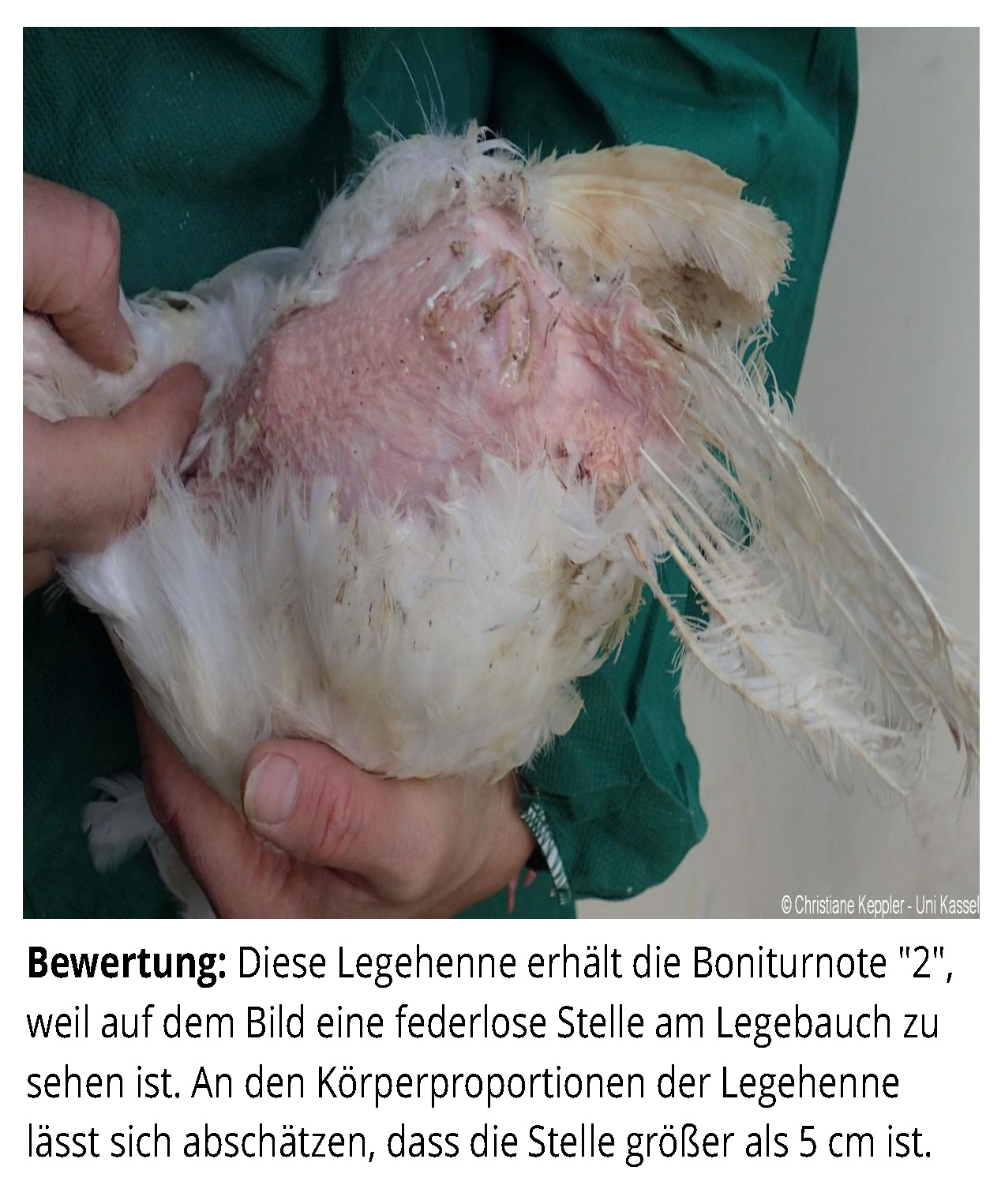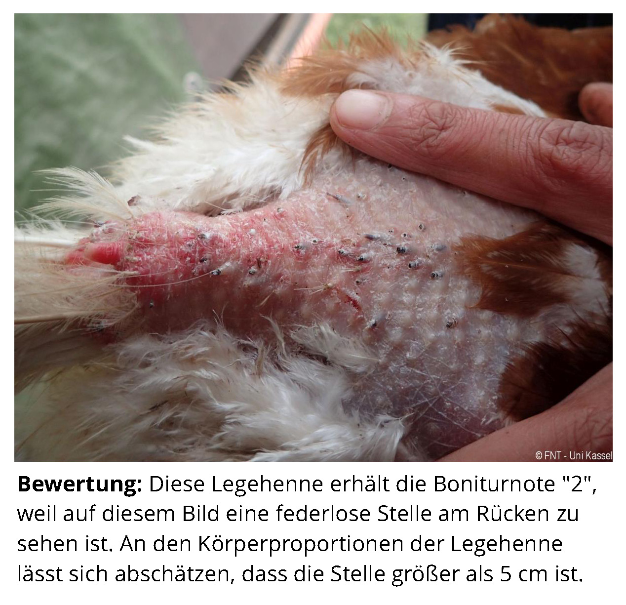Das Zusatzmaterial für den Indikator "Gefiederschäden" soll dazu dienen, die erworbenen Kenntnisse anhand von Praxisbeispielen zu vertiefen. Zu diesem Zweck werden zu jeder Boniturstufe des Tierschutzindikators Praxisbilder gezeigt und weiterführende Informationen zum Hintergrund der jeweiligen Bewertung gegeben. Darüber hinaus werden Grenzfälle zwischen zwei Boniturnoten und Besonderheiten bei der Tierbeurteilung vorgestellt. Klicken Sie auf den blauen Link oberhalb der Abbildungen, um eine vergrößerte Ansicht inkl. der Bewertung zu erhalten.