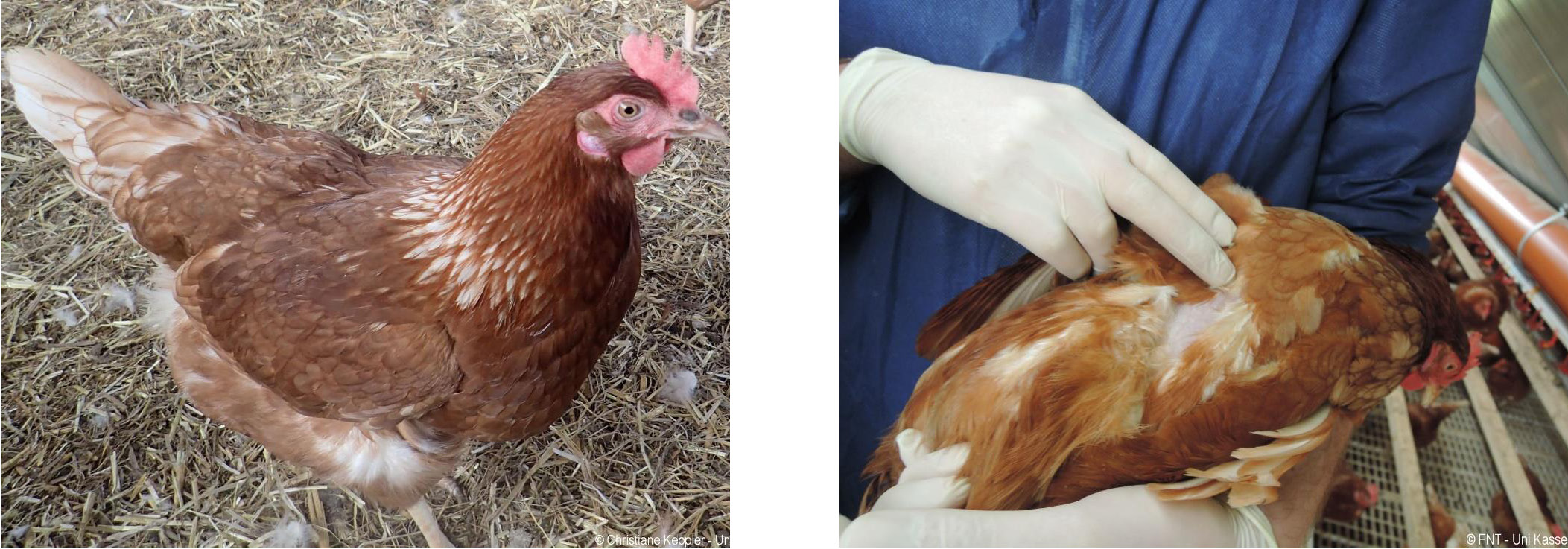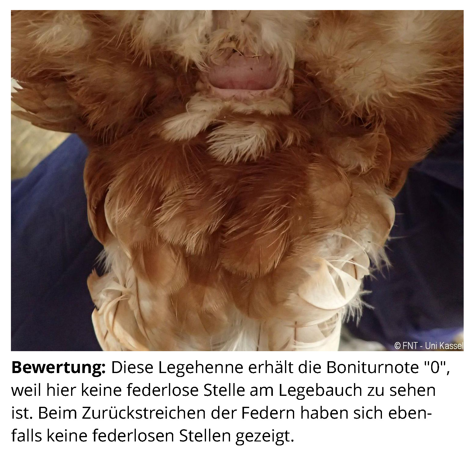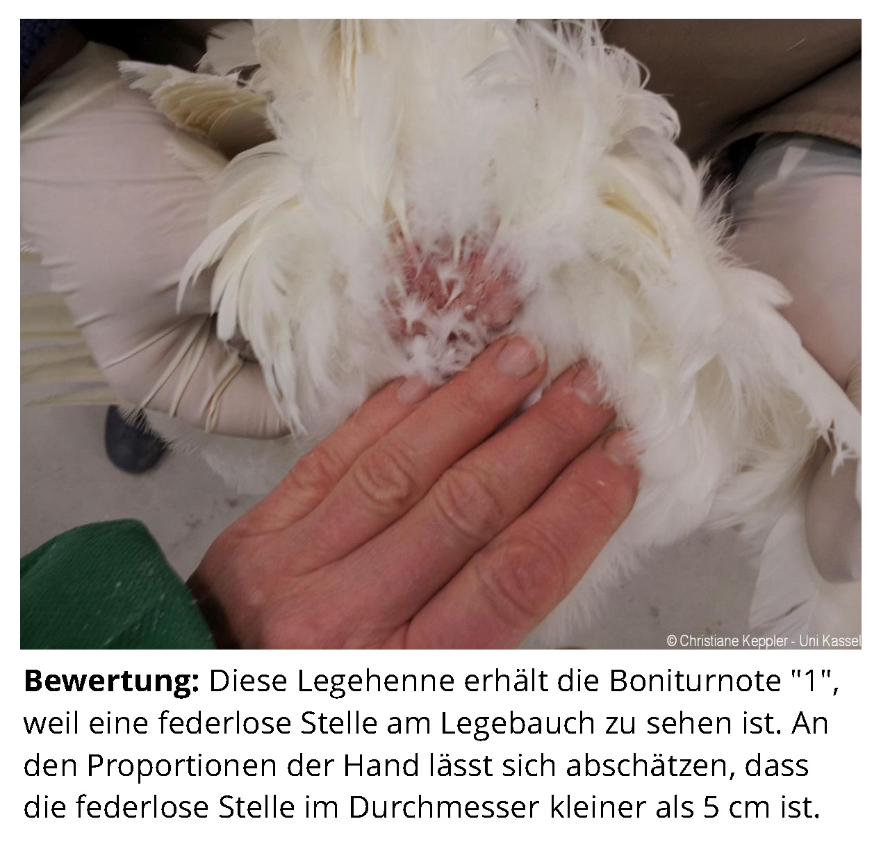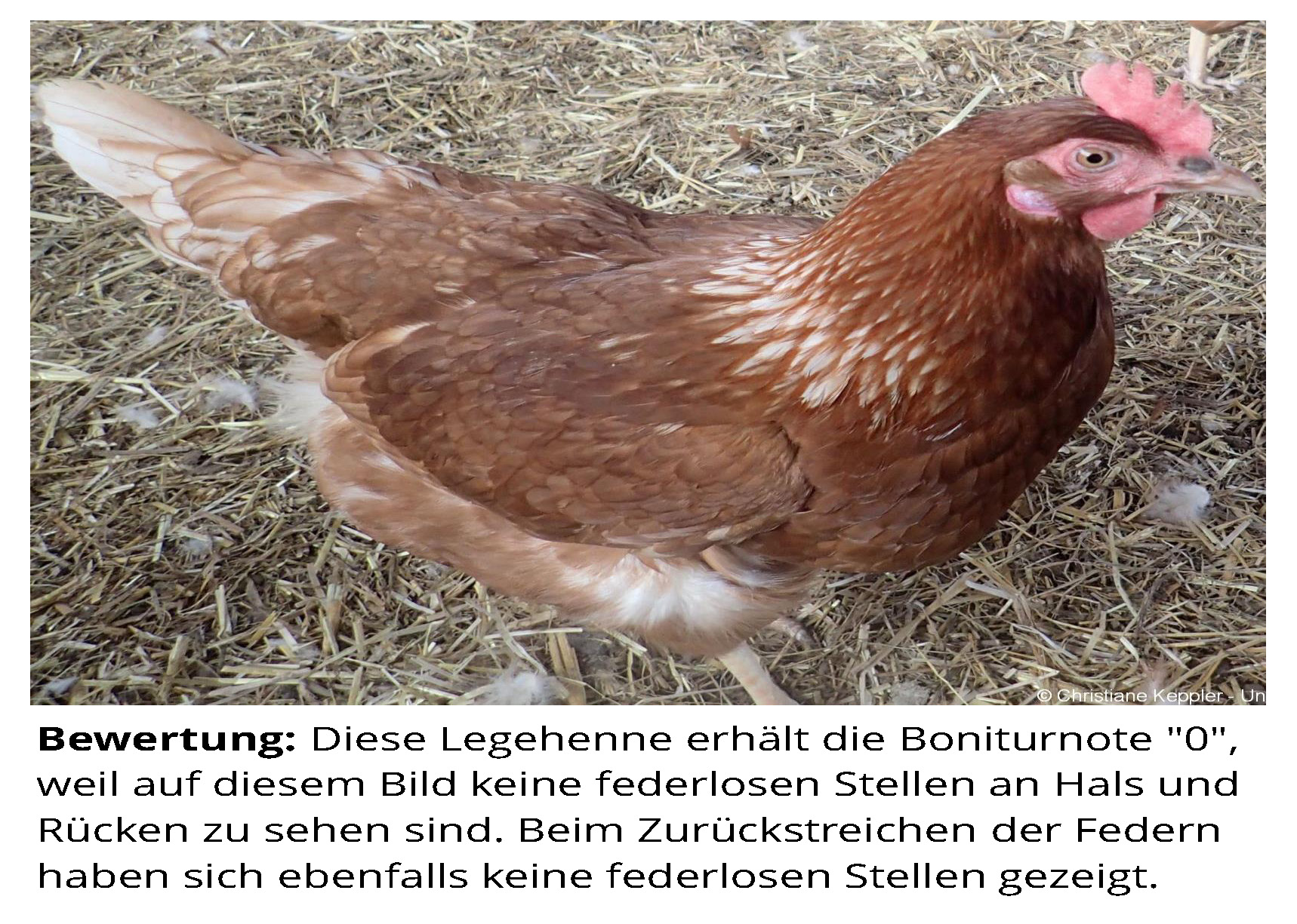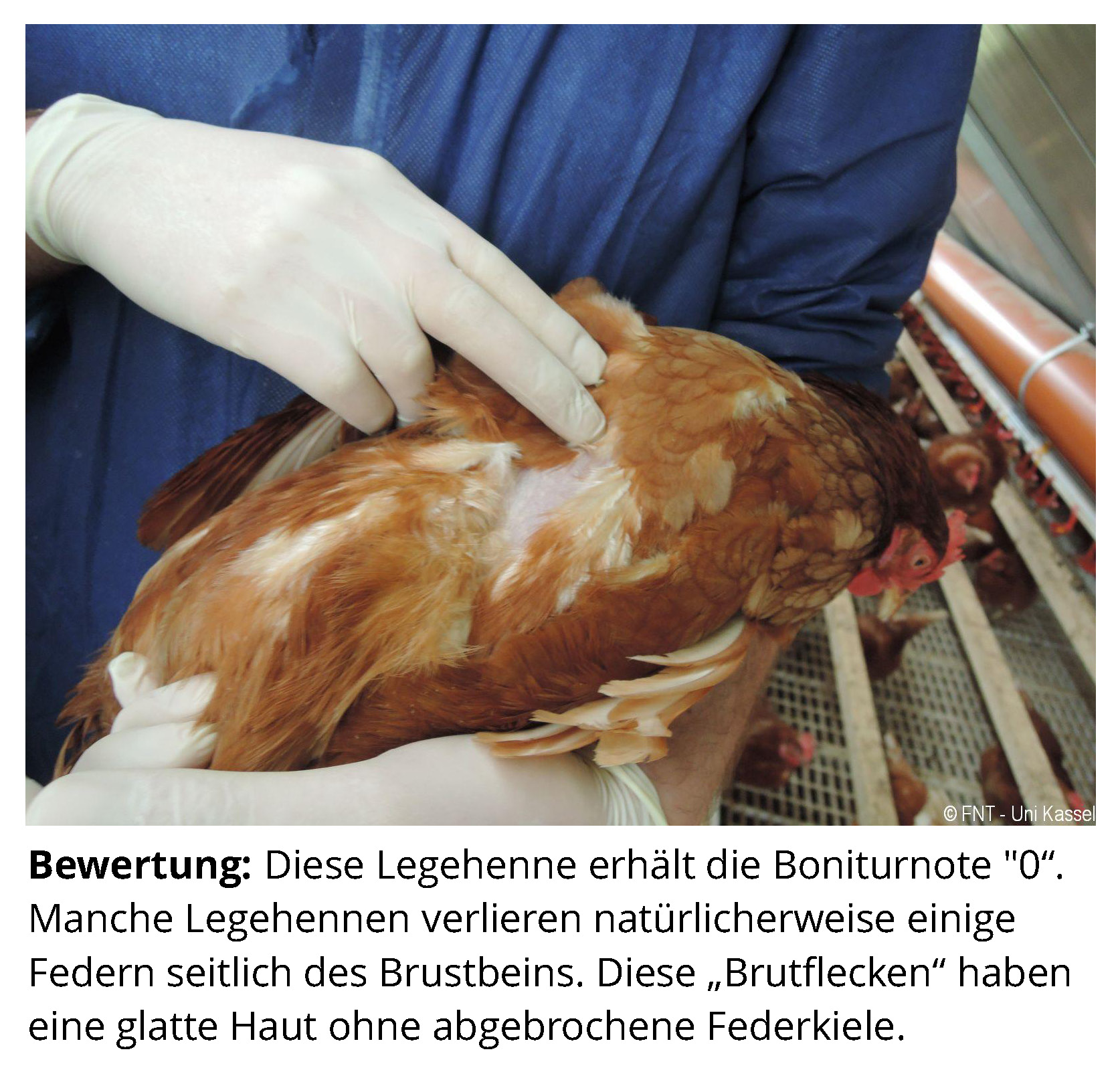 Das Zusatzmaterial für den Indikator "Gefiederschäden" soll dazu dienen, die erworbenen Kenntnisse anhand von Praxisbeispielen zu vertiefen. Zu diesem Zweck werden zu jeder Boniturstufe des Tierschutzindikators Praxisbilder gezeigt und weiterführende Informationen zum Hintergrund der jeweiligen Bewertung gegeben. Darüber hinaus werden Grenzfälle zwischen zwei Boniturnoten und Besonderheiten bei der Tierbeurteilung vorgestellt. Klicken Sie auf den blauen Link oberhalb der Abbildungen, um eine vergrößerte Ansicht inkl. der Bewertung zu erhalten.