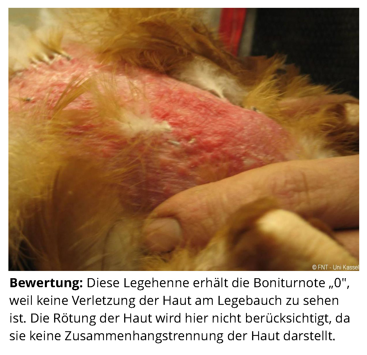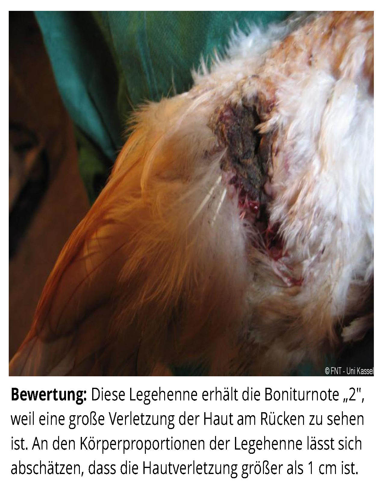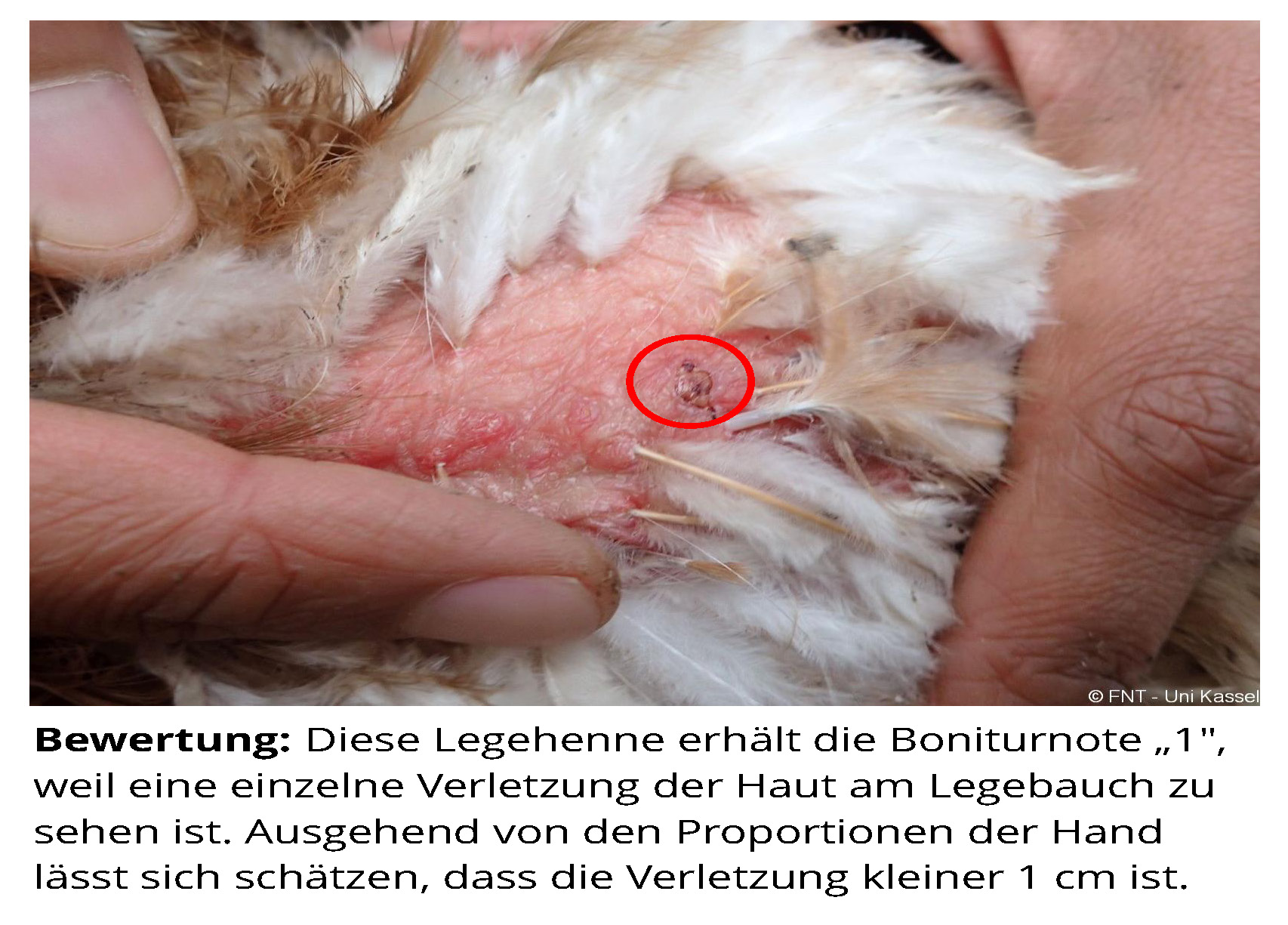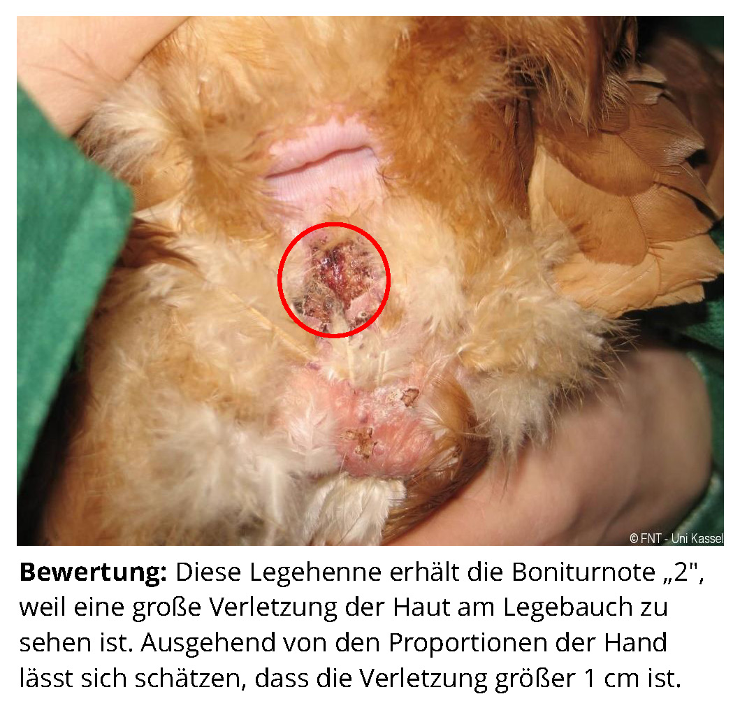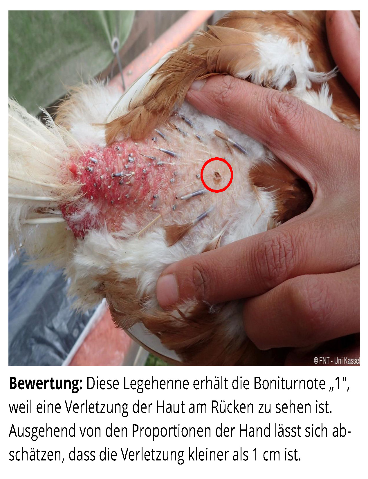 Das Zusatzmaterial für den Indikator "Hautverletzungen" soll dazu dienen, die erworbenen Kenntnisse anhand von Praxisbeispielen zu vertiefen. Zu diesem Zweck werden zu jeder Boniturstufe des Tierschutzindikators Praxisbilder gezeigt und weiterführende Informationen zum Hintergrund der jeweiligen Bewertung gegeben. Darüber hinaus werden Grenzfälle zwischen zwei Boniturnoten und Besonderheiten bei der Tierbeurteilung vorgestellt. Klicken Sie auf den blauen Link oberhalb der Abbildungen, um eine vergrößerte Ansicht inkl. der Bewertung zu erhalten.