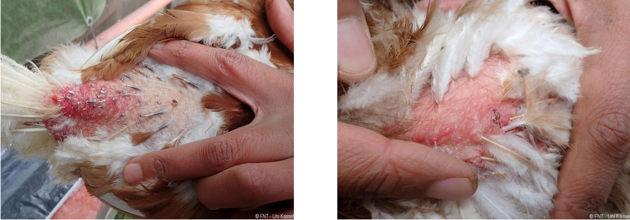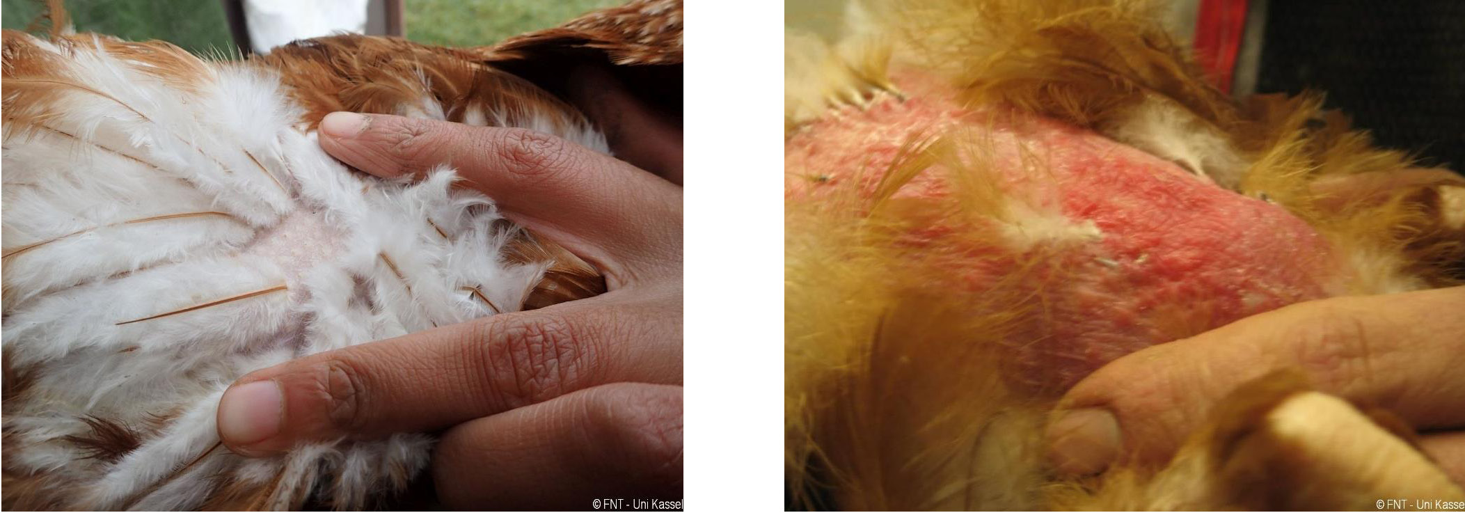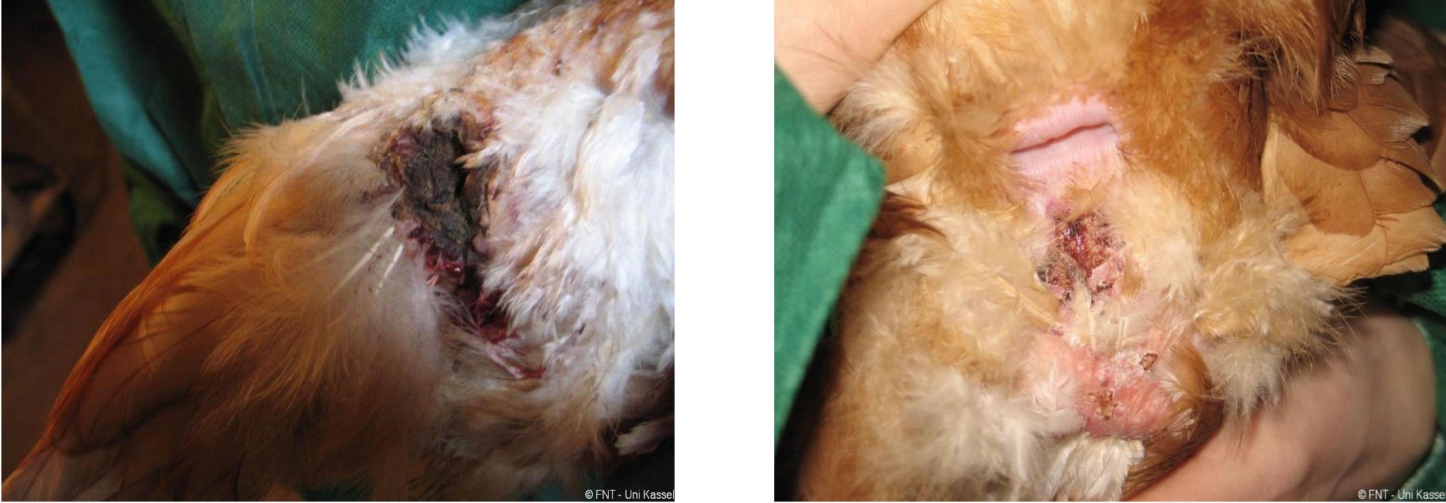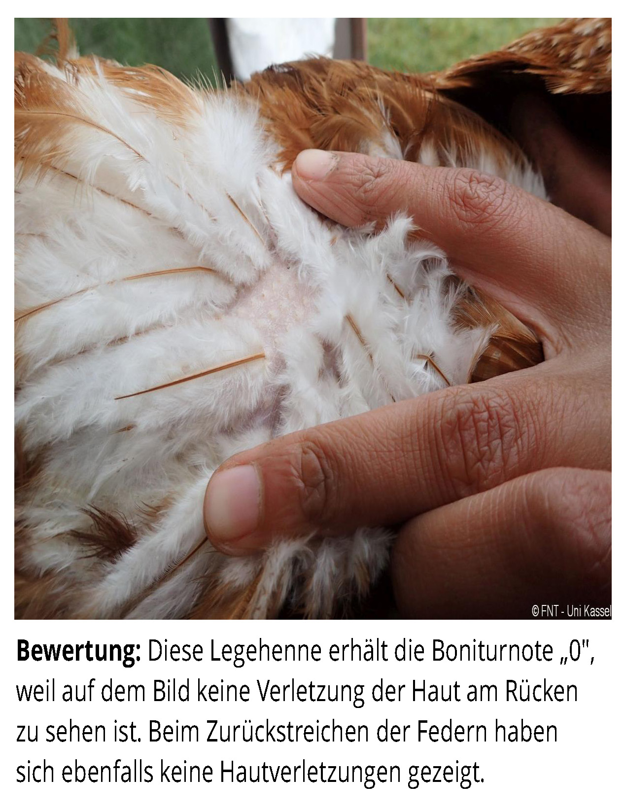 Das Zusatzmaterial für den Indikator "Hautverletzungen" soll dazu dienen, die erworbenen Kenntnisse anhand von Praxisbeispielen zu vertiefen. Zu diesem Zweck werden zu jeder Boniturstufe des Tierschutzindikators Praxisbilder gezeigt und weiterführende Informationen zum Hintergrund der jeweiligen Bewertung gegeben. Darüber hinaus werden Grenzfälle zwischen zwei Boniturnoten und Besonderheiten bei der Tierbeurteilung vorgestellt. Klicken Sie auf den blauen Link oberhalb der Abbildungen, um eine vergrößerte Ansicht inkl. der Bewertung zu erhalten.