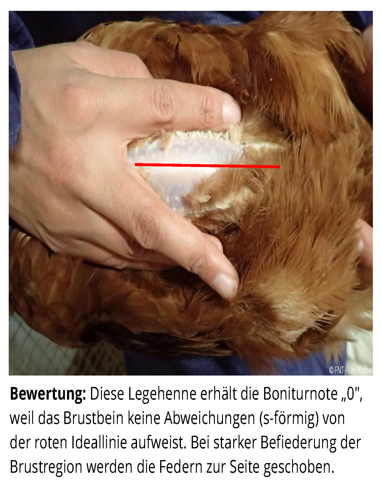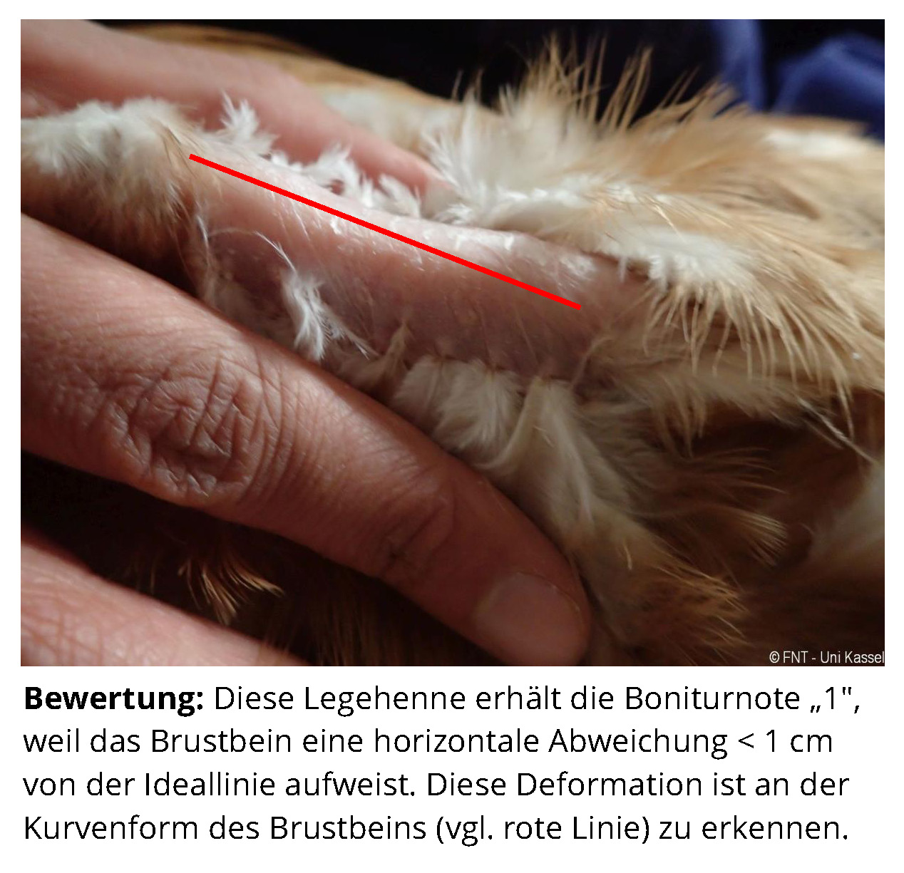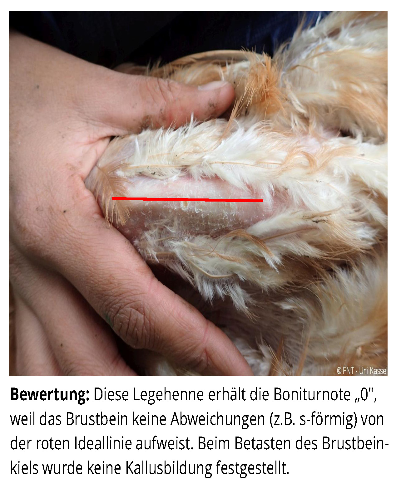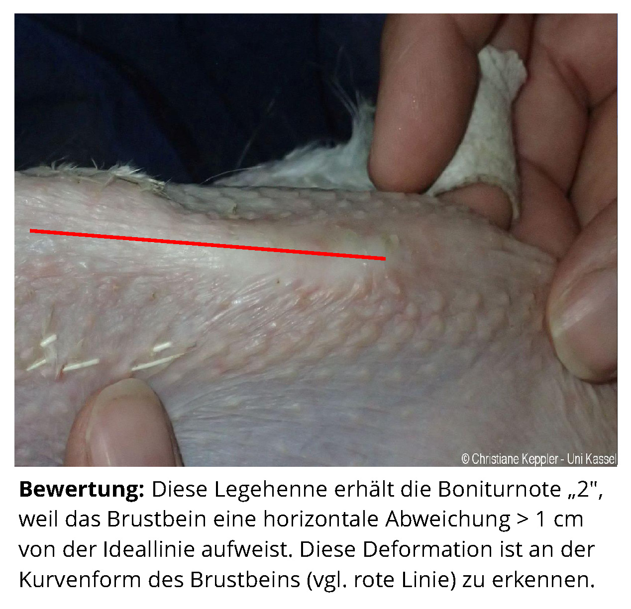 Das Zusatzmaterial für den Indikator "Brustbeinschäden" soll dazu dienen, die erworbenen Kenntnisse anhand von Praxisbeispielen zu vertiefen. Zu diesem Zweck werden zu jeder Boniturstufe des Tierschutzindikators Praxisbilder gezeigt und weiterführende Informationen zum Hintergrund der jeweiligen Bewertung gegeben. Darüber hinaus werden Grenzfälle zwischen zwei Boniturnoten und Besonderheiten bei der Tierbeurteilung vorgestellt. Klicken Sie auf den blauen Link oberhalb der Abbildungen, um eine vergrößerte Ansicht inkl. der Bewertung zu erhalten.