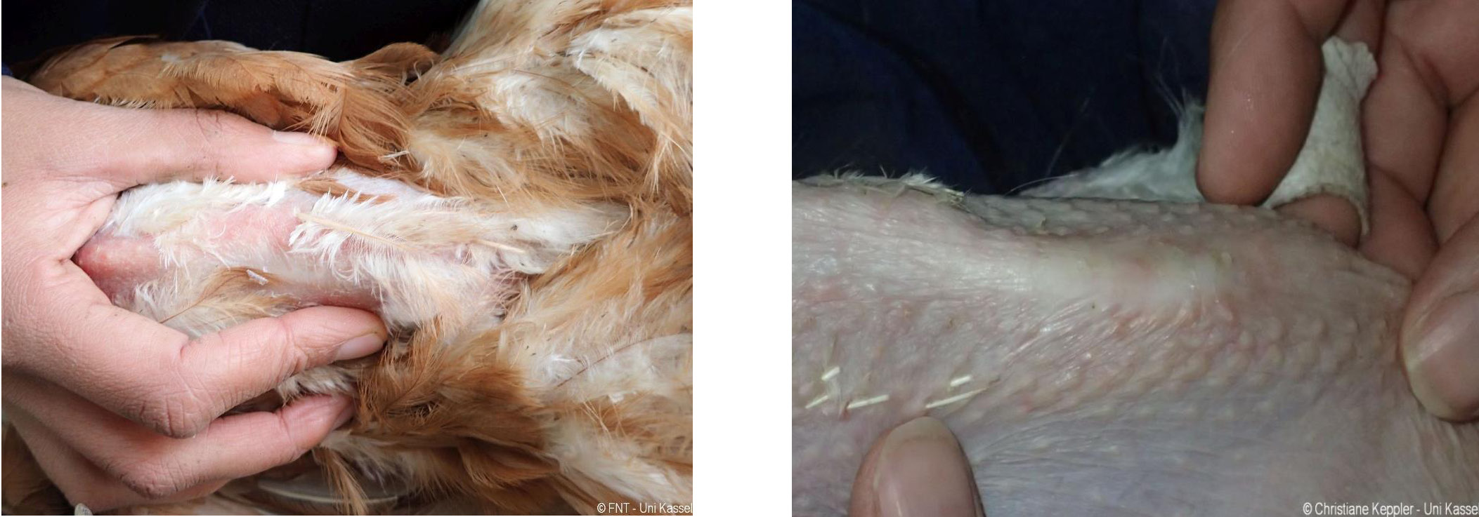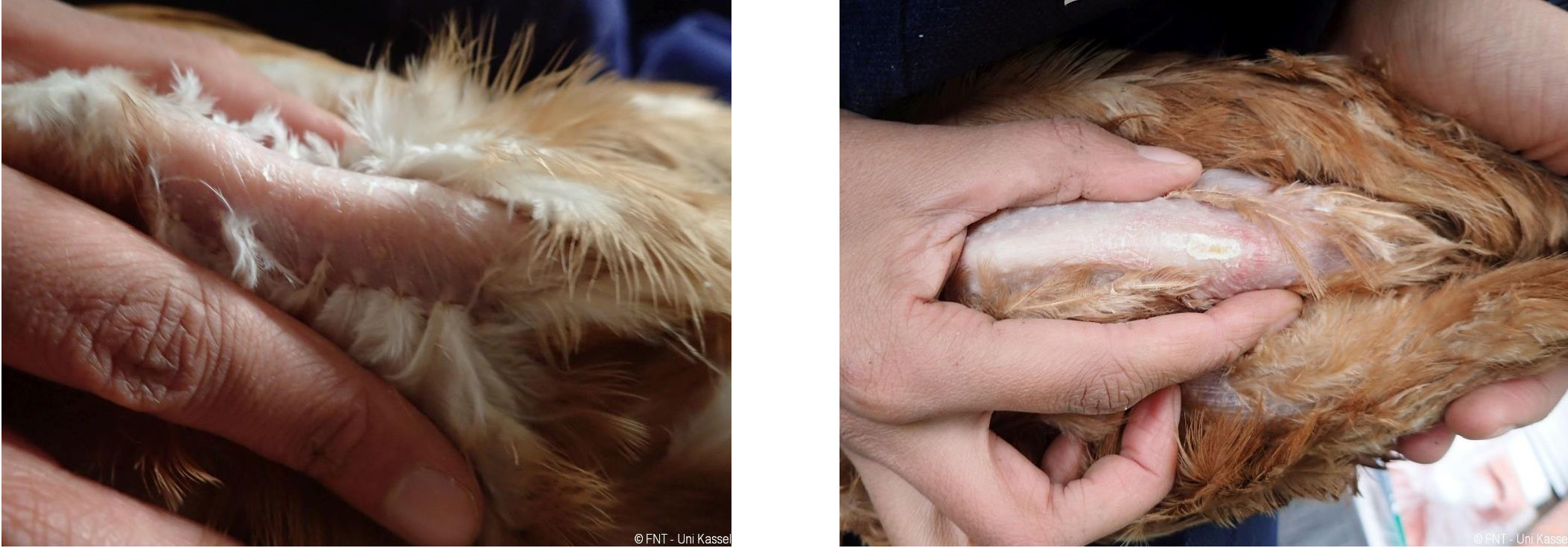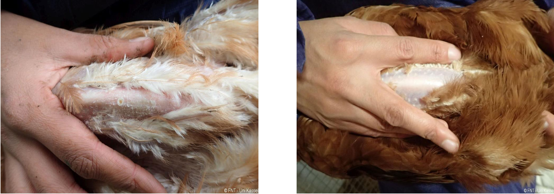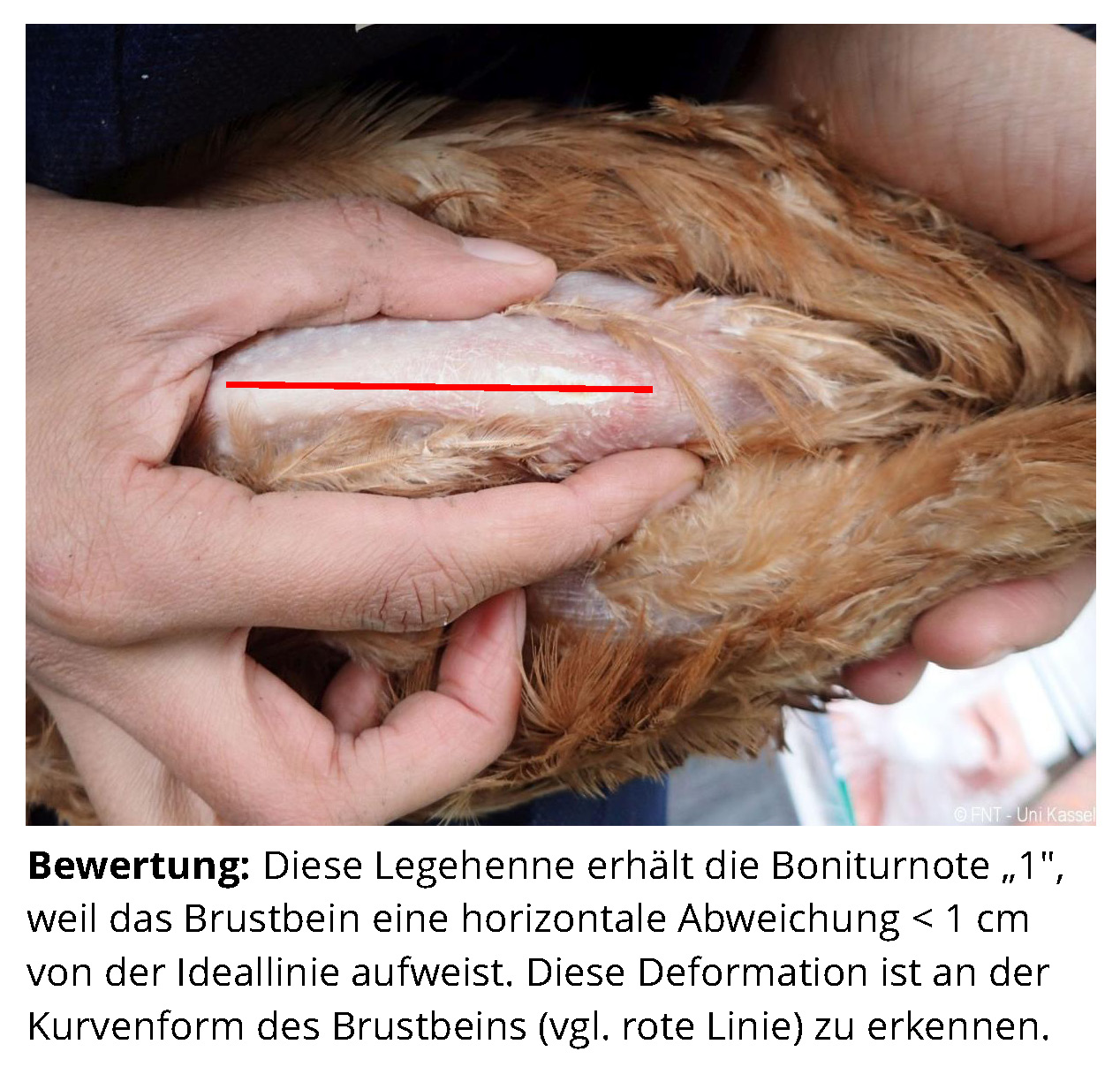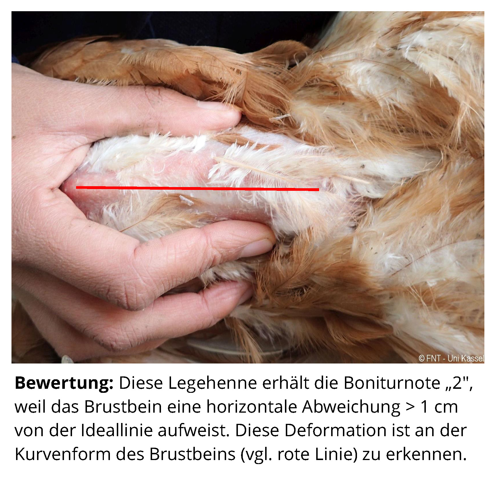 Das Zusatzmaterial für den Indikator "Brustbeinschäden" soll dazu dienen, die erworbenen Kenntnisse anhand von Praxisbeispielen zu vertiefen. Zu diesem Zweck werden zu jeder Boniturstufe des Tierschutzindikators Praxisbilder gezeigt und weiterführende Informationen zum Hintergrund der jeweiligen Bewertung gegeben. Darüber hinaus werden Grenzfälle zwischen zwei Boniturnoten und Besonderheiten bei der Tierbeurteilung vorgestellt. Klicken Sie auf den blauen Link oberhalb der Abbildungen, um eine vergrößerte Ansicht inkl. der Bewertung zu erhalten.