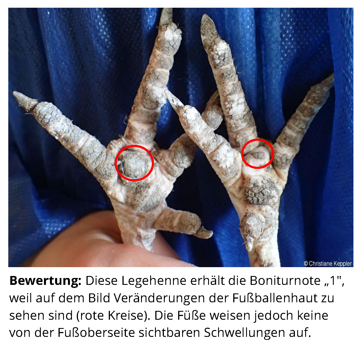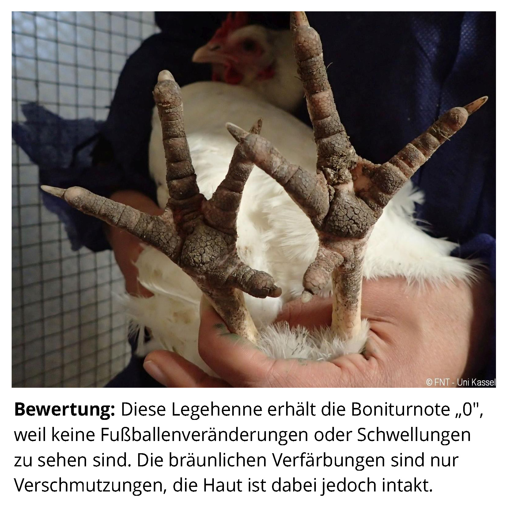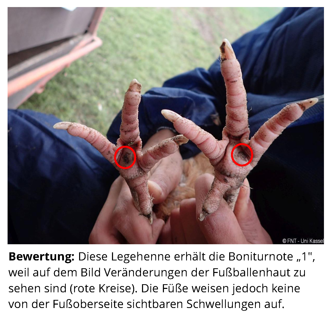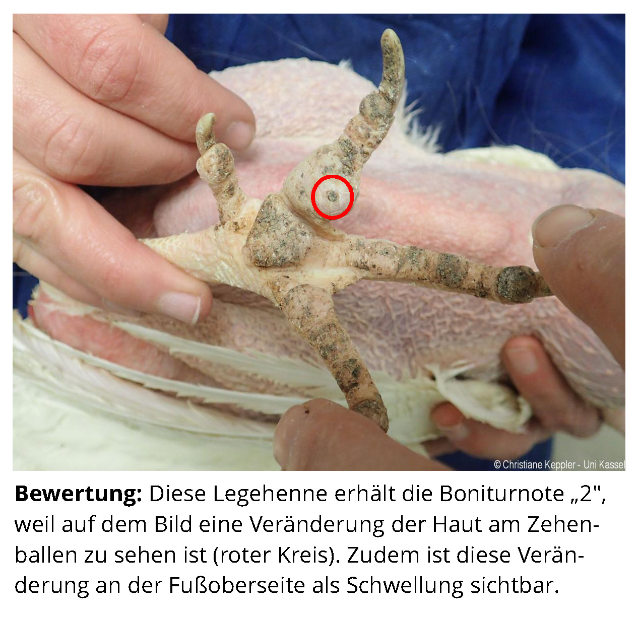 Das Zusatzmaterial für den Indikator "Fußballenveränderungen" soll dazu dienen, die erworbenen Kenntnisse anhand von Praxisbeispielen zu vertiefen. Zu diesem Zweck werden zu jeder Boniturstufe des Tierschutzindikators Praxisbilder gezeigt und weiterführende Informationen zum Hintergrund der jeweiligen Bewertung gegeben. Darüber hinaus werden Grenzfälle zwischen zwei Boniturnoten und Besonderheiten bei der Tierbeurteilung vorgestellt. Klicken Sie auf den blauen Link oberhalb der Abbildungen, um eine vergrößerte Ansicht inkl. der Bewertung zu erhalten.