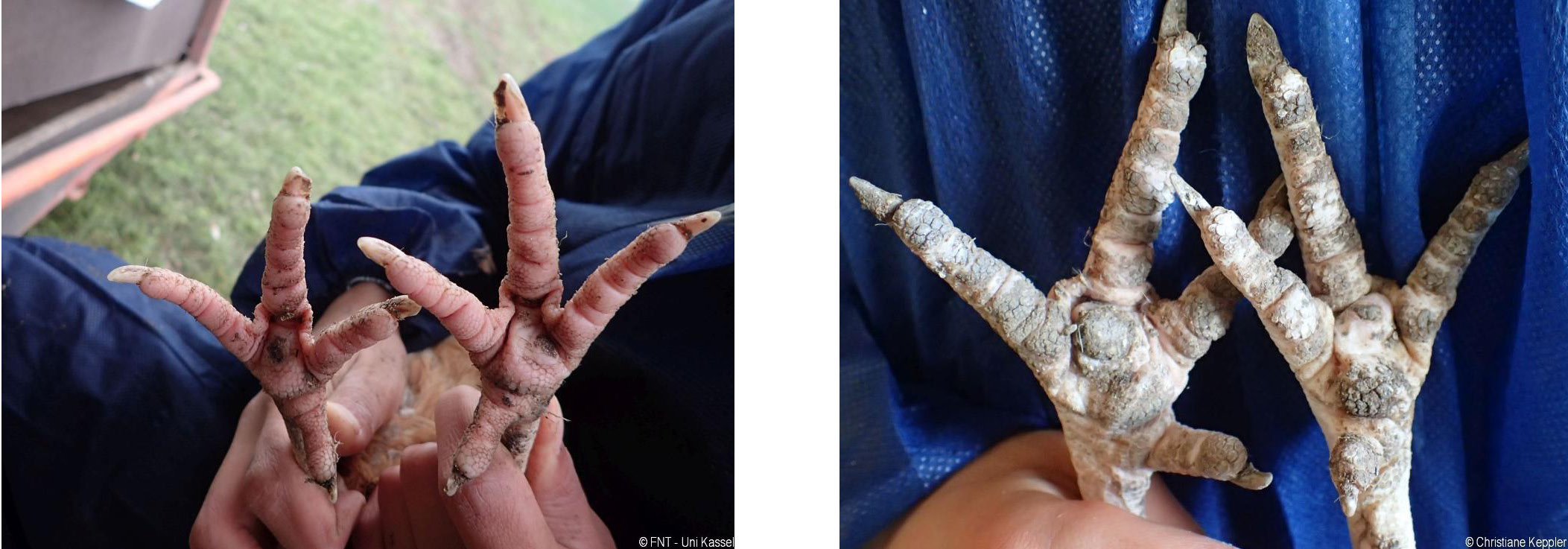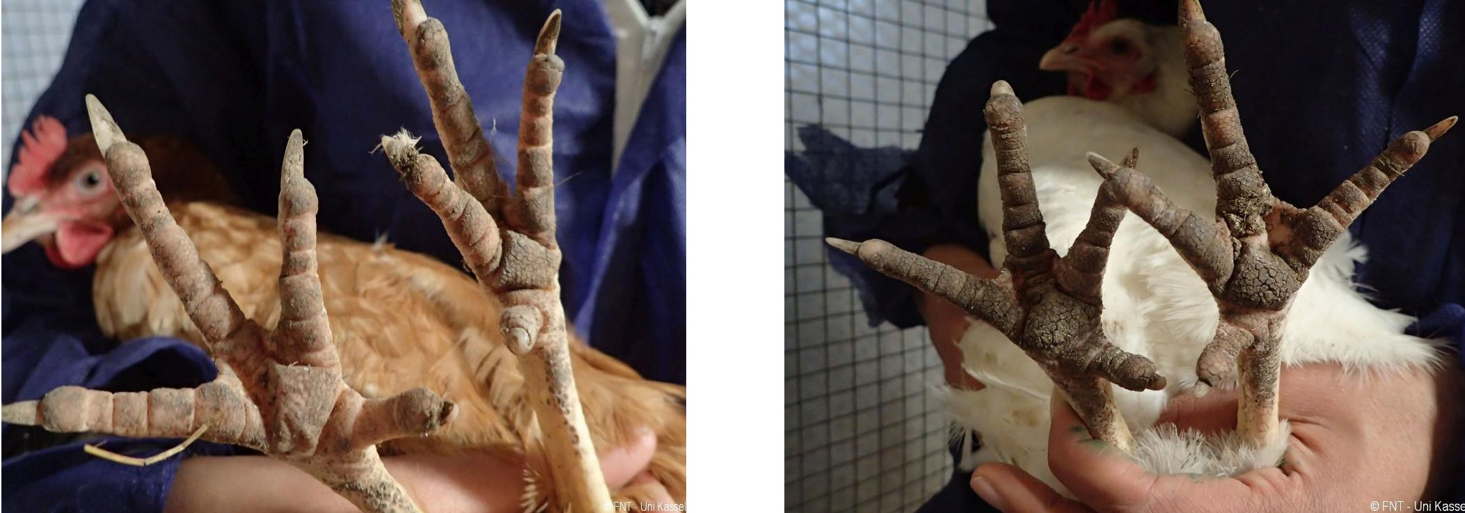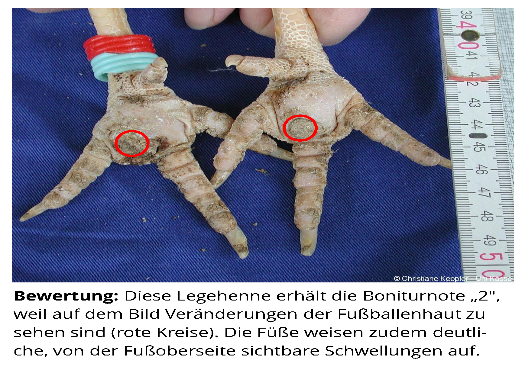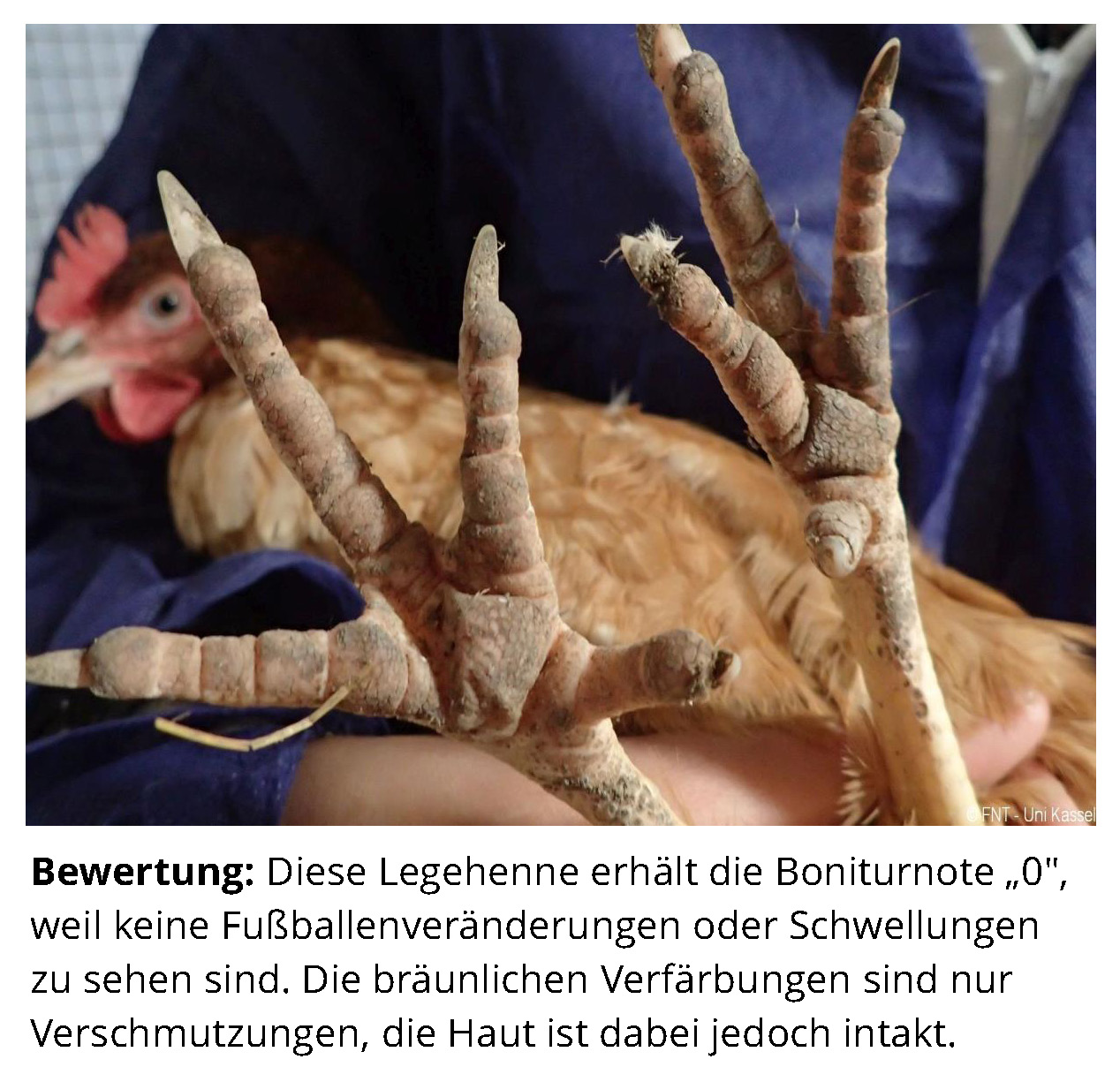 Das Zusatzmaterial für den Indikator "Fußballenveränderungen" soll dazu dienen, die erworbenen Kenntnisse anhand von Praxisbeispielen zu vertiefen. Zu diesem Zweck werden zu jeder Boniturstufe des Tierschutzindikators Praxisbilder gezeigt und weiterführende Informationen zum Hintergrund der jeweiligen Bewertung gegeben. Darüber hinaus werden Grenzfälle zwischen zwei Boniturnoten und Besonderheiten bei der Tierbeurteilung vorgestellt. Klicken Sie auf den blauen Link oberhalb der Abbildungen, um eine vergrößerte Ansicht inkl. der Bewertung zu erhalten.
