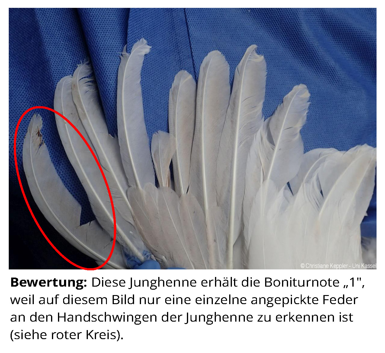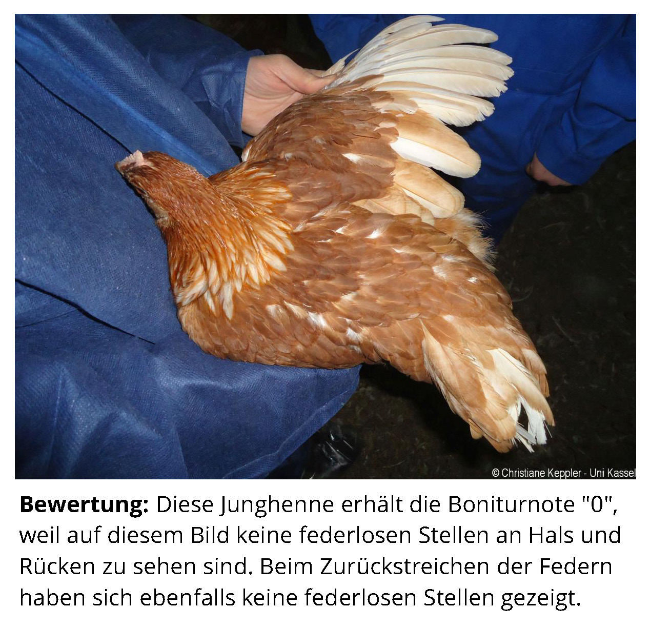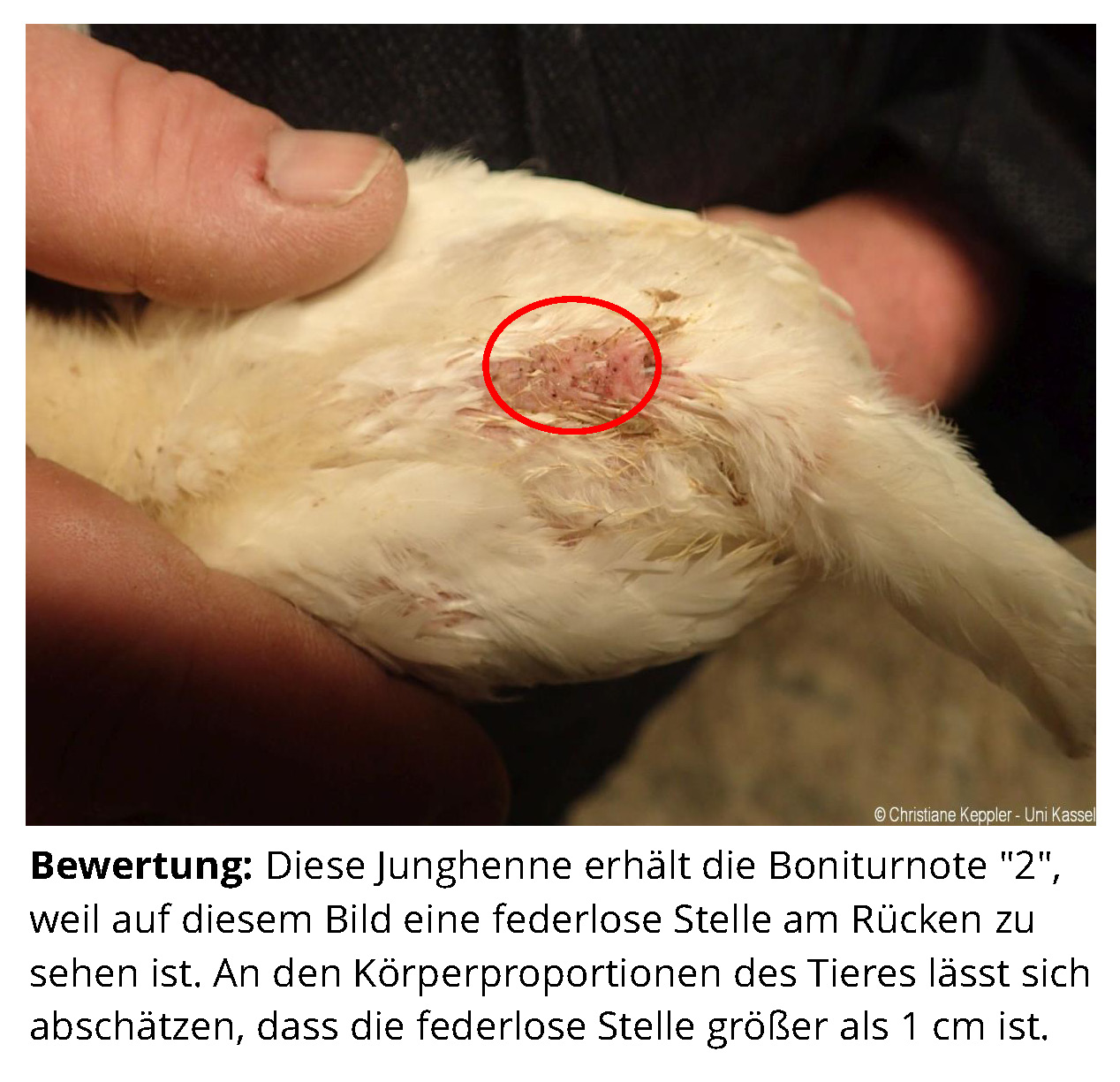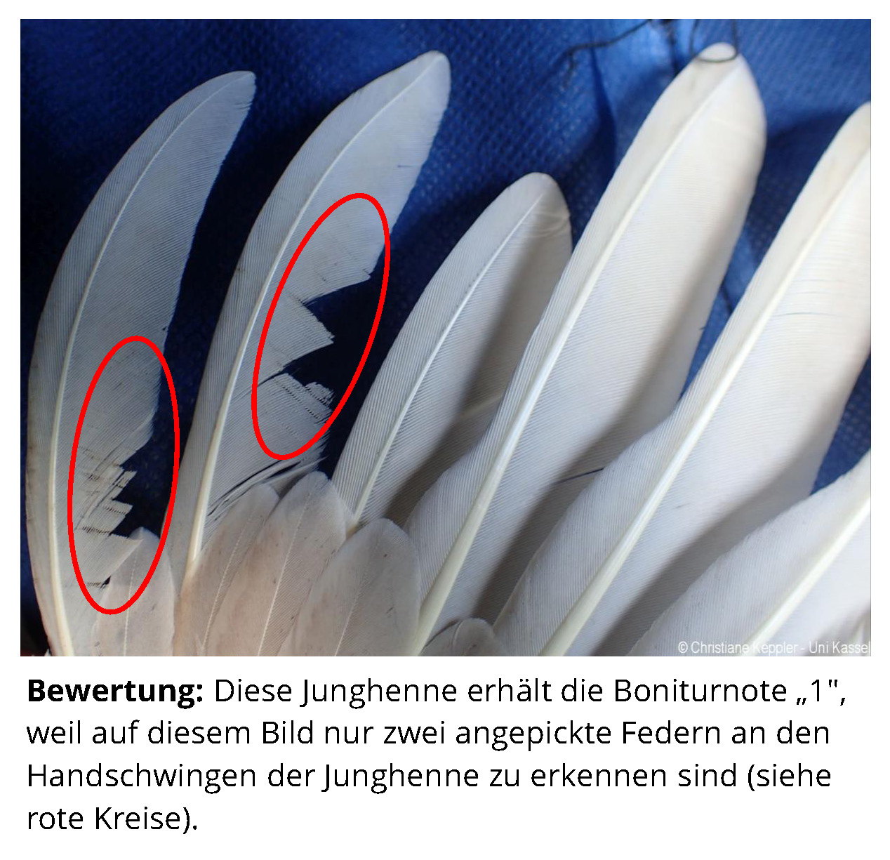 Das Zusatzmaterial für den Indikator "Gefiederschäden" soll dazu dienen, die erworbenen Kenntnisse anhand von Praxisbeispielen zu vertiefen. Zu diesem Zweck werden zu jeder Boniturstufe des Tierschutzindikators Praxisbilder gezeigt und weiterführende Informationen zum Hintergrund der jeweiligen Bewertung gegeben. Darüber hinaus werden Grenzfälle zwischen zwei Boniturnoten und Besonderheiten bei der Tierbeurteilung vorgestellt. Klicken Sie auf den blauen Link oberhalb der Abbildungen, um eine vergrößerte Ansicht inkl. der Bewertung zu erhalten.