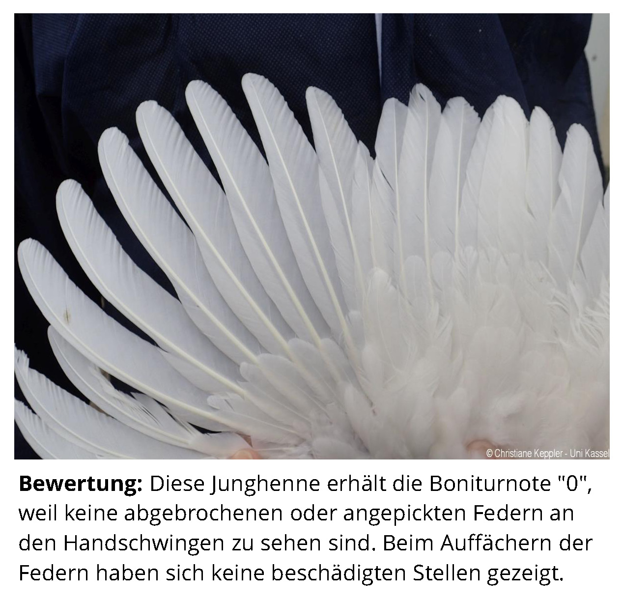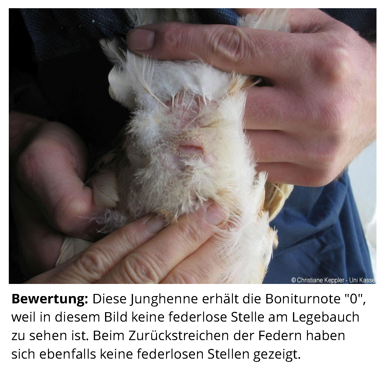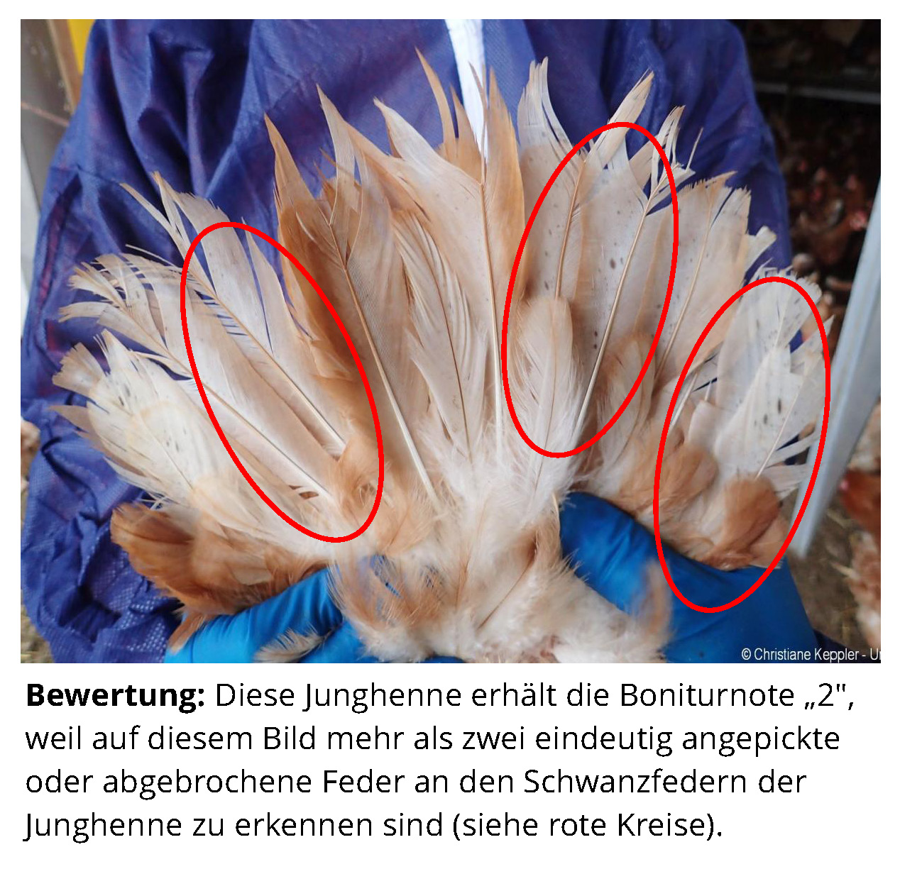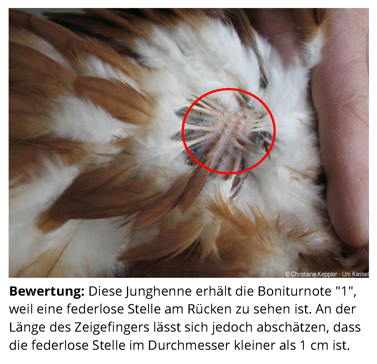 Das Zusatzmaterial für den Indikator "Gefiederschäden" soll dazu dienen, die erworbenen Kenntnisse anhand von Praxisbeispielen zu vertiefen. Zu diesem Zweck werden zu jeder Boniturstufe des Tierschutzindikators Praxisbilder gezeigt und weiterführende Informationen zum Hintergrund der jeweiligen Bewertung gegeben. Darüber hinaus werden Grenzfälle zwischen zwei Boniturnoten und Besonderheiten bei der Tierbeurteilung vorgestellt. Klicken Sie auf den blauen Link oberhalb der Abbildungen, um eine vergrößerte Ansicht inkl. der Bewertung zu erhalten.