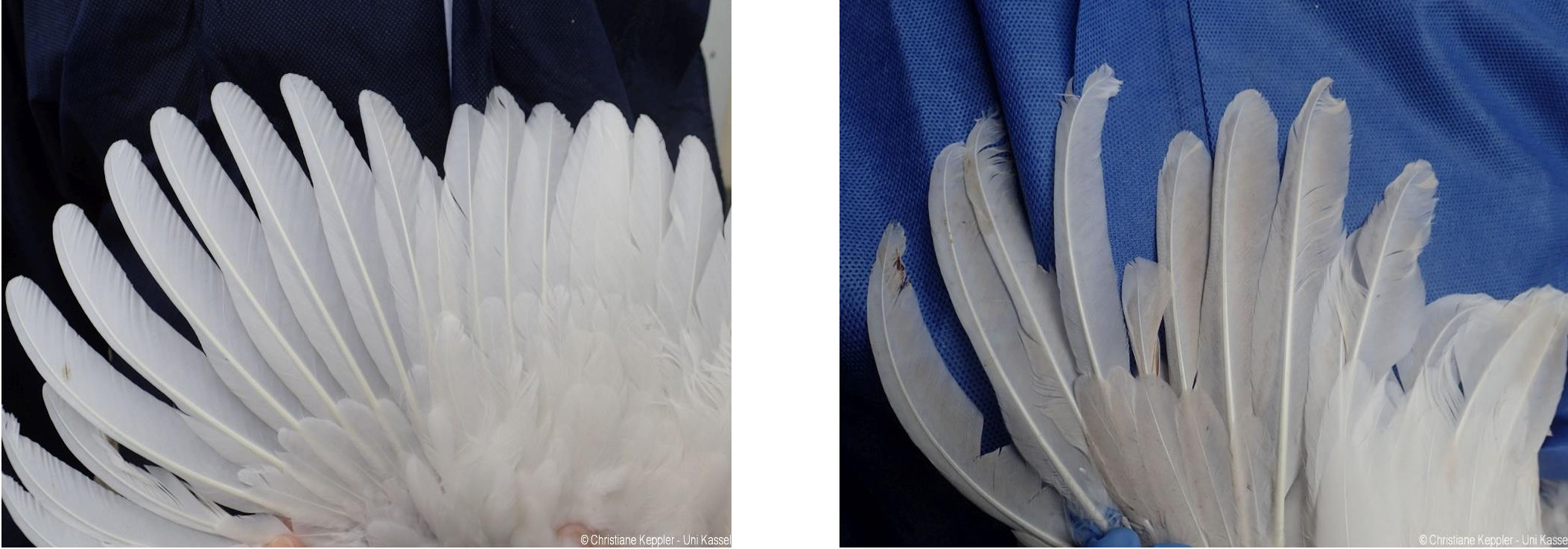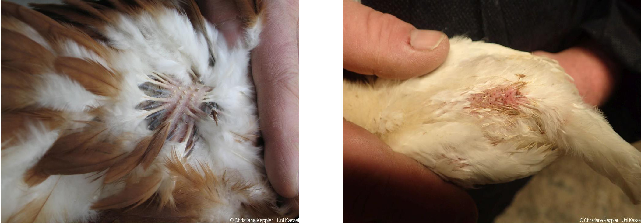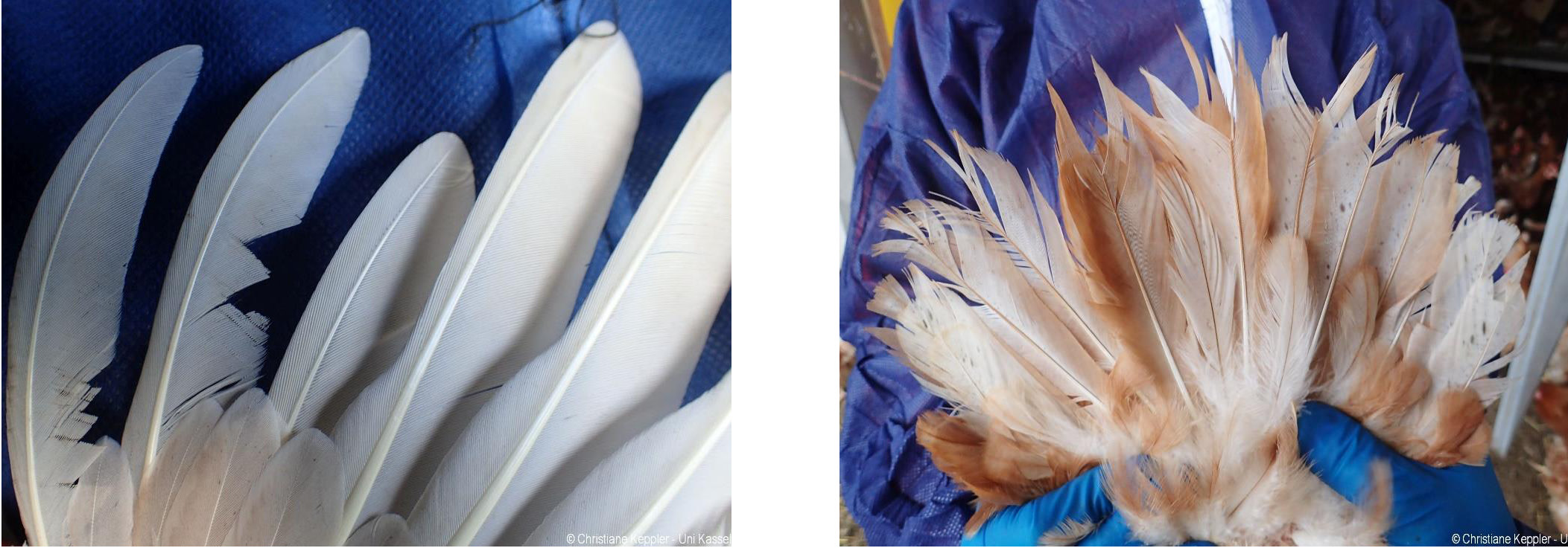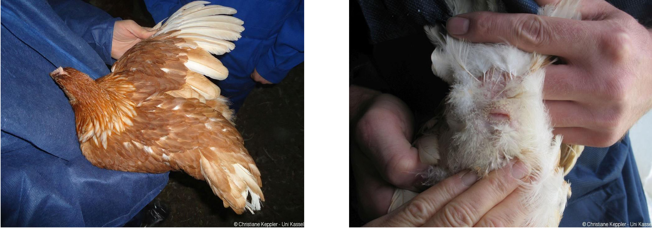 Das Zusatzmaterial für den Indikator "Gefiederschäden" soll dazu dienen, die erworbenen Kenntnisse anhand von Praxisbeispielen zu vertiefen. Zu diesem Zweck werden zu jeder Boniturstufe des Tierschutzindikators Praxisbilder gezeigt und weiterführende Informationen zum Hintergrund der jeweiligen Bewertung gegeben. Darüber hinaus werden Grenzfälle zwischen zwei Boniturnoten und Besonderheiten bei der Tierbeurteilung vorgestellt. Klicken Sie auf den blauen Link oberhalb der Abbildungen, um eine vergrößerte Ansicht inkl. der Bewertung zu erhalten.