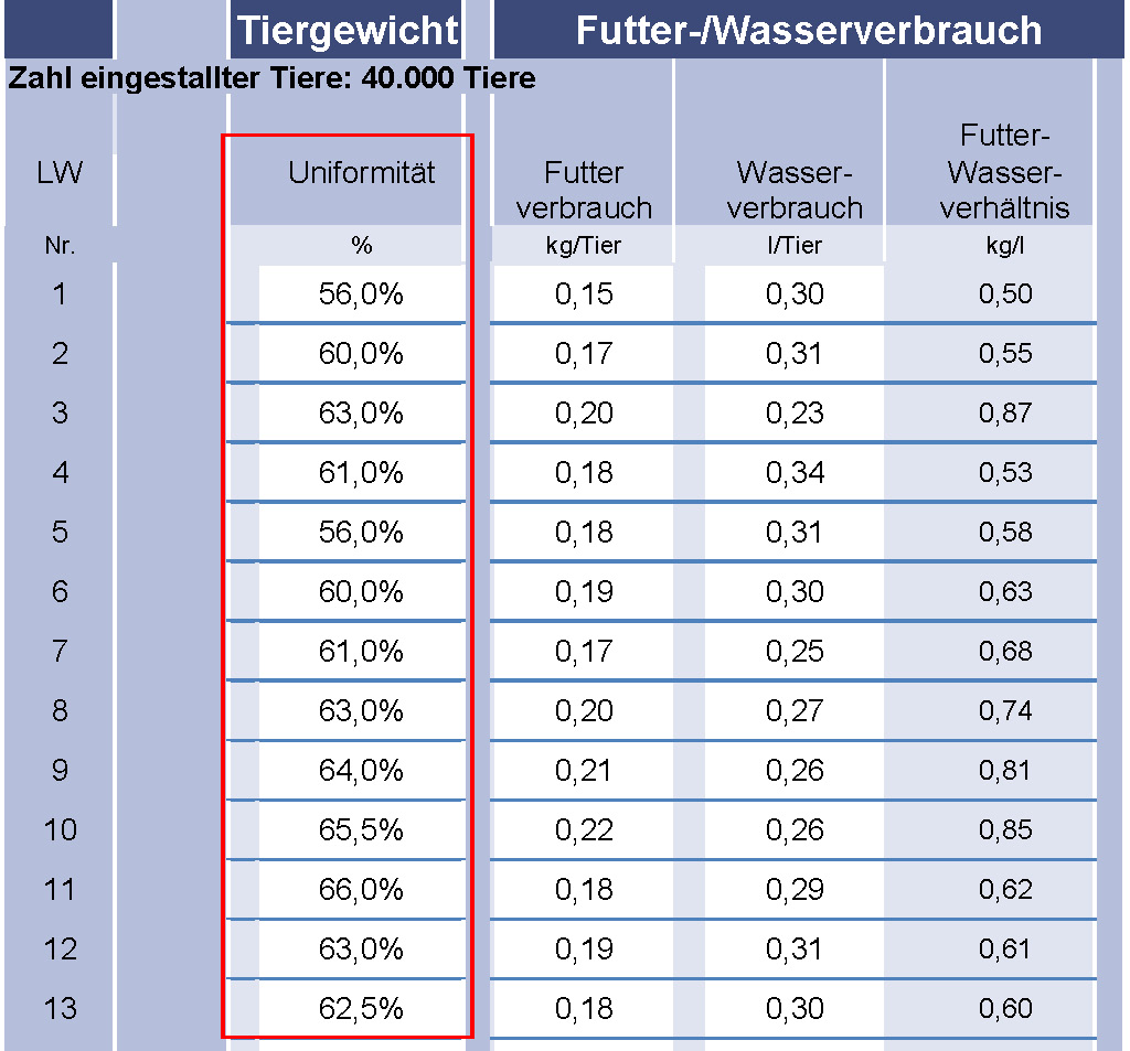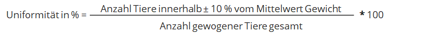 Die automatischen Wiegungen werden täglich notiert und mindestens einmal wöchentlich mit Hilfe der Berechnungsformeln aus dem KTBL-Leitfaden (S. 48) ausgewertet. Berechnen Sie die Anzahl Tiere in einem Korridor von ± 10% vom durchschnittlichen Gewicht der Masthühner. Dividieren Sie die Gesamtsumme durch die Zahl der insgesamt gewogenen Tiere. Multiplizieren Sie das Ergebnis mit der Zahl 100, um die Uniformität