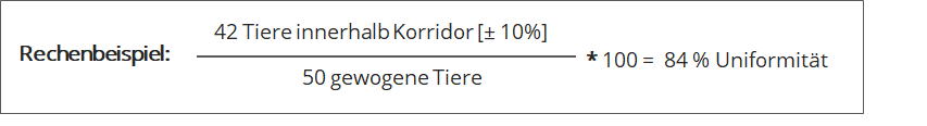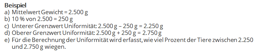 Ermittlung der Gewichtsentwicklung durch automatisches Wiegen mit im Stall installierten Wiegeeinheiten. Die Berechnung der Uniformität ist nur möglich, wenn die Waage Einzeltiergewichte erfassen kann. Falls die automatischen Wiegeeinheiten über keine Einzeltiererfassung verfügen, empfiehlt es sich, eine manuelle Wiegung im Rahmen der Tierbonitur durchzuführen. In jedem Durchgang sollte eine Kontrollwiegung durch das Wiegen eines bekannten Gewichts durchgeführt werden, um die korrekte Gewichtserfassung zu überprüfen.