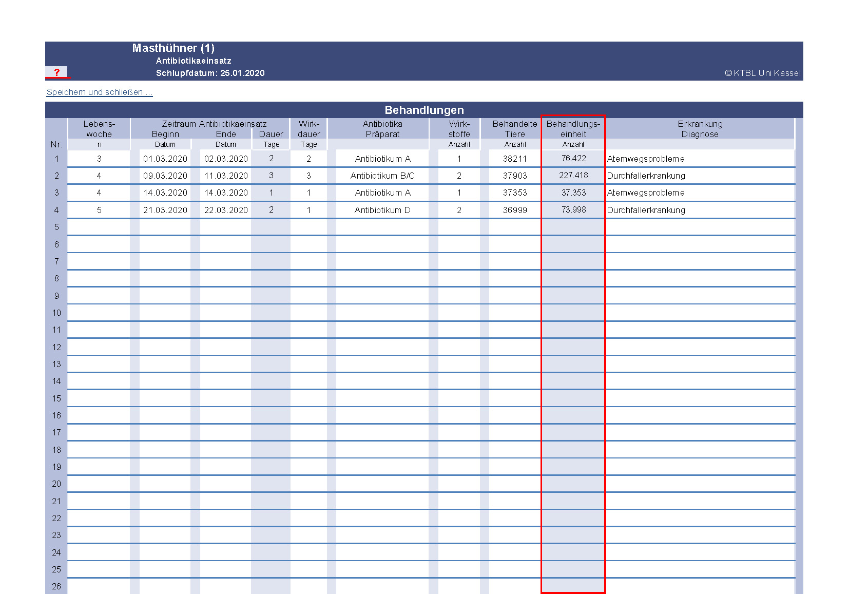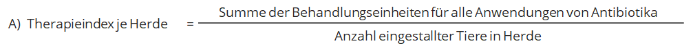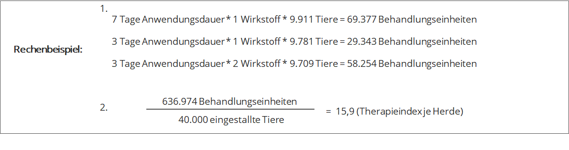 Die Verabreichung von Arzneimitteln zur Behandlung von Krankheiten ist im Bedarfsfall aus Tierschutzsicht geboten. Ein hoher Antibiotikaeinsatz weist jedoch auf eine hohe Erkrankungsrate und damit möglicherweise auf Probleme in Haltung oder Management hin. Der Antibiotikaeinsatz muss stets in Zusammenhang mit anderen Indikatoren, wie z.B. den Tierverlusten, bewertet werden. Der berechnete Therapieindex wird zum innerbetrieblichen Vergleich über mehrere Durchgänge herangezogen.