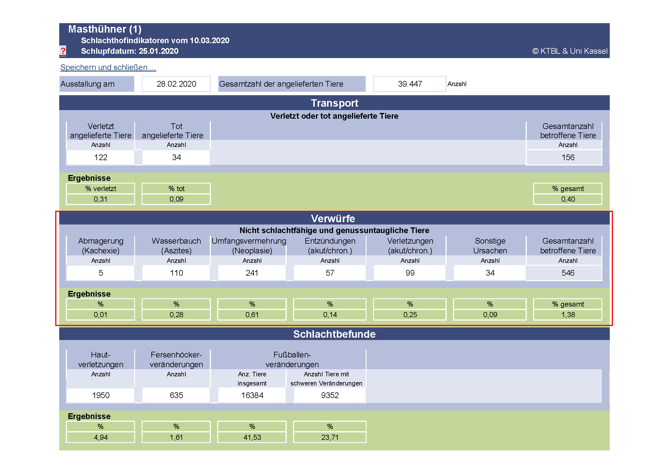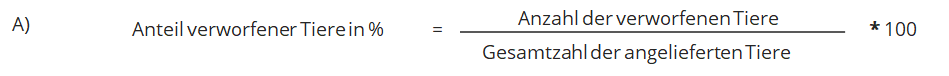 Die Gesamtzahl verworfener Tiere wird aus der Schlachthofauswertung entnommen und im Anschluss mit Hilfe der Berechnungsformeln aus dem KTBL-Leitfaden (S. 51) ausgewertet: Zählen Sie alle im jeweiligen Durchgang verworfenen Tiere zusammen. Dividieren Sie die Gesamtsumme durch die Gesamtzahl der angelieferten Tiere. Multiplizieren Sie das Ergebnis mit der Zahl 100, um den Anteil insgesamt verworfener Tiere in Prozent zu erhalten (A). Führen Sie die genannten Rechenschritte ebenfalls für die spezifischen Verwurfsursachen durch (B).