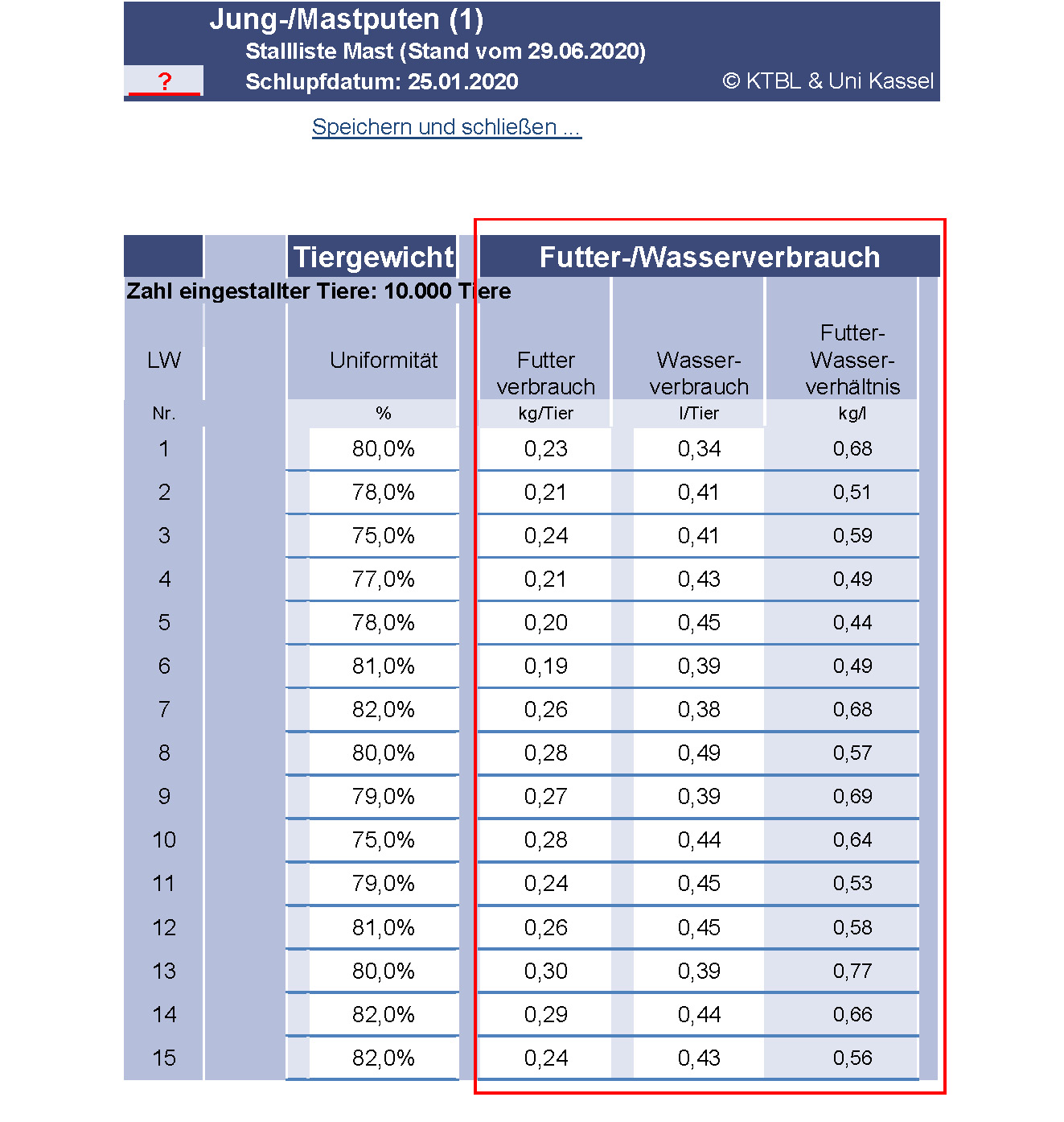 Eine unzureichende Futter- und Wasserversorgung oder mangelhafte Qualität beeinflussen die Immunabwehr und das Wohlbefinden der Mastputen. Erkrankungen und Leistungseinbußen können die Folge sein. Zudem führen tropfende Tränken und feuchter Kot zu schlechter Einstreuqualität mit entsprechend negativen Auswirkungen für verschiedene Verhaltensweisen für die Tiere. Im Rahmen der Eigenkontrolle werden die Futter- und Wassermengen pro Lebenswoche ausgewertet, um die Entwicklung des jeweiligen Verbrauchs über die Zeit beurteilen zu können. Dies erlaubt einen innerbetrieblichen Vergleich zwischen verschiedenen Durchgängen.
