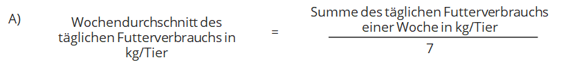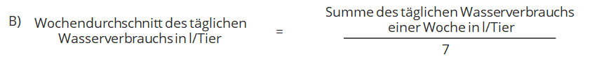 Der Futter- und Wasserverbrauch wird täglich erhoben und einmal in der Woche mit Hilfe der Berechnungsformeln aus dem KTBL-Leitfaden (S. 65) ausgewertet. Zur Berechnung des Wochendurchschnitts des täglichen Wasserverbrauchs werden die täglichen Wasserverbräuche einer Woche in Liter pro Tier addiert und durch 7 Wochentage dividiert (A). Führen Sie diese Rechenschritte analog zur Berechnung des Wochendurchschnitts des täglichen Futterverbrauchs in Kilogramm pro Tier durch (B). Zusätzlich wird der wöchentliche Futterverbrauch in Kilogramm pro Tier durch den wöchentlichen Wasserverbrauch in Liter pro Tier berechnet, um das wöchentliche Futter-Wasser-Verhältnis in Kilogramm pro Liter zu erhalten (C).