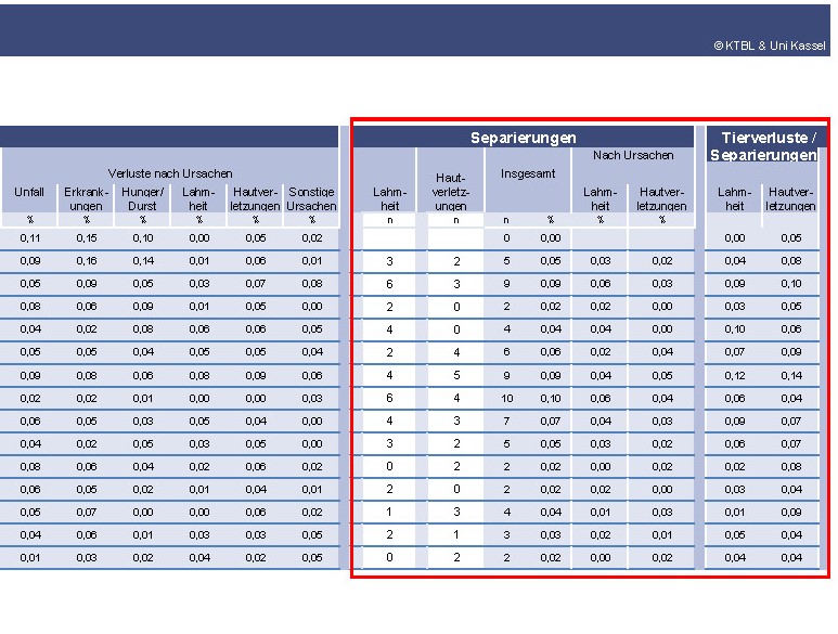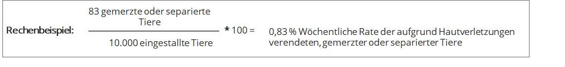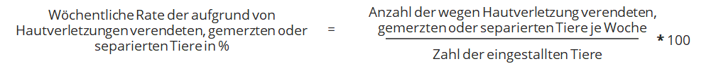 Die Gesamtzahl der aufgrund von Hautverletzungen verendeten, separierten und gemerzten Tiere wird täglich erhoben und wöchentlich mit Hilfe der Berechnungsformeln aus dem KTBL-Leitfaden (S. 57) ausgewertet. Zählen Sie alle in der jeweiligen Woche aufgrund von Hautverletzungen verendeten, separierten und gemerzten Tiere zusammen. Dividieren Sie die Gesamtsumme durch die Zahl der ursprünglich eingestallten Tiere. Multiplizieren Sie das Ergebnis mit der Zahl 100, um die wöchentliche Rate der aufgrund von Hautverletzungen verendeten, gemerzten und separierten Mastputen in Prozent zu erhalten.