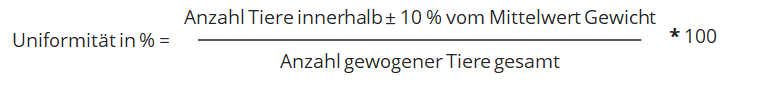 Eine unzureichende Gewichtsentwicklung der Herde, aber auch untergewichtige Einzeltiere, können Hinweise auf verschiedene Probleme in Haltung, Versorgung und im Management liefern. Zu niedrige Körpergewichte können auf eine eingeschränkte Bewegungsfähigkeit, Fehler in der Fütterung oder ein (unterschwelliges) Krankheitsgeschehen hindeuten. Eine sehr schnelle Gewichtszunahme kann andererseits gesundheitliche Störungen im Bereich des Selettsystems und des Herz-Kreislauf-Systems mit sich bringen. Die Uniformität wird berechnet, um ein potenzielles Auseinanderwachsen der Herde zu erfassen. Dies ist aus Tierschutzsicht besonders relevant, da die Fütterungs- und Tränkelinien auch für kleine Tiere erreichbar sein müssen.