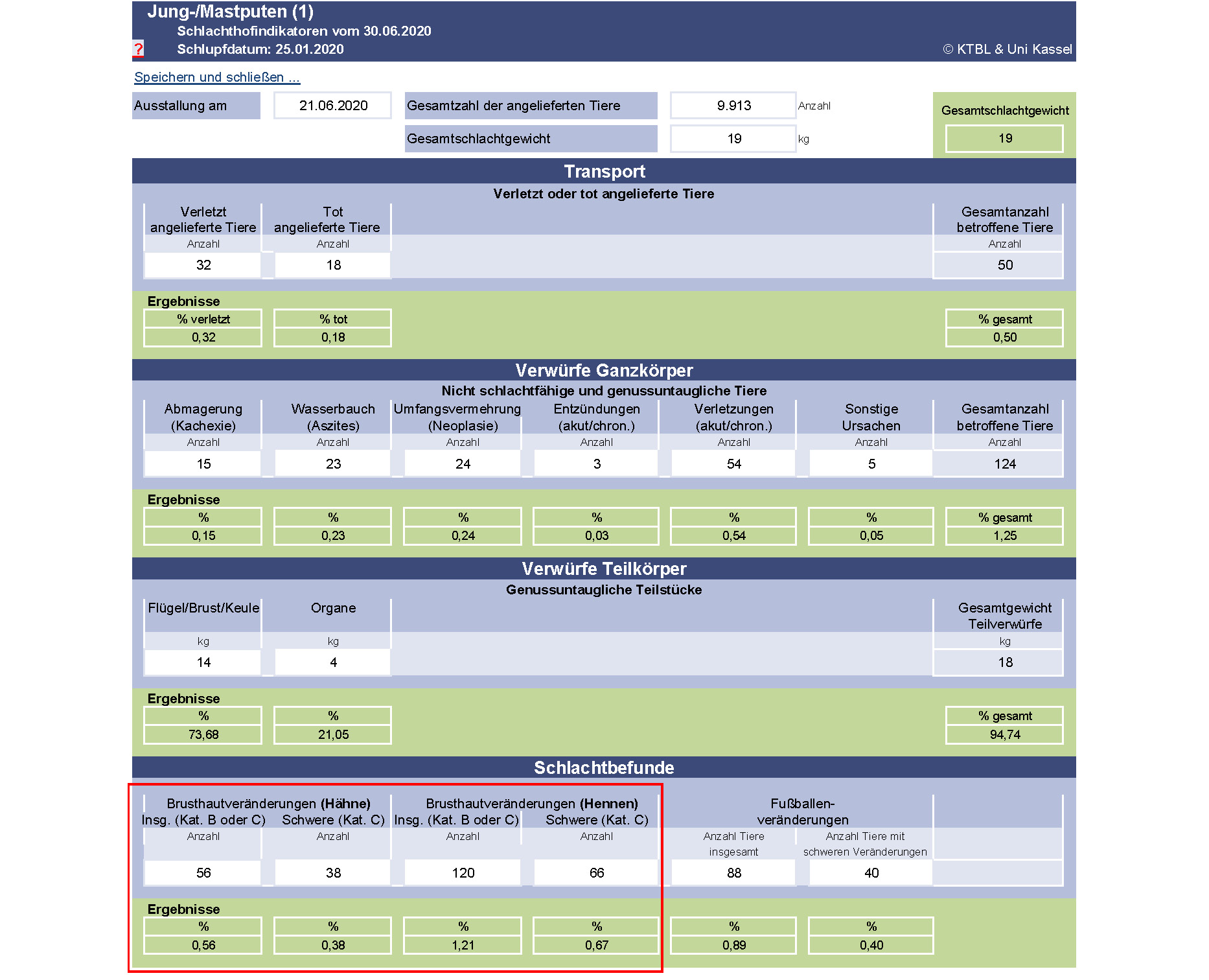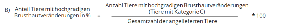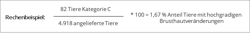 Die Gesamtzahl Tiere mit Brusthautveränderungen wird aus der Schlachthofrückmeldung entnommen und im Anschluss mit Hilfe der Berechnungsformeln aus dem KTBL-Leitfaden (S. 70) ausgewertet. Zählen Sie alle im jeweiligen Durchgang aufgrund von Brusthautveränderungen auffällig gewordenen Tiere zusammen. Dividieren Sie die Gesamtsumme durch die Gesamtzahl der angelieferten Tiere. Multiplizieren Sie das Ergebnis mit der Zahl 100, um den Anteil Tiere mit Brusthautveränderungen in Prozent zu erhalten (A). Führen Sie die genannten Rechenschritte jeweils auch für die Anzahl Tiere mit hochgradigen Brusthautveränderungen durch (B).
