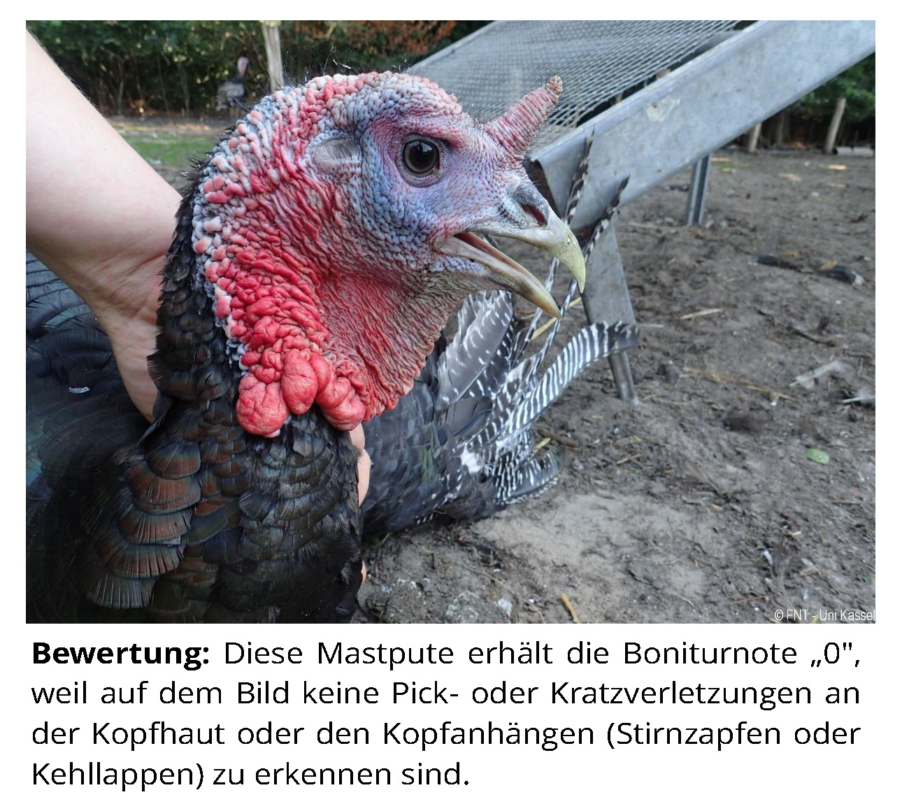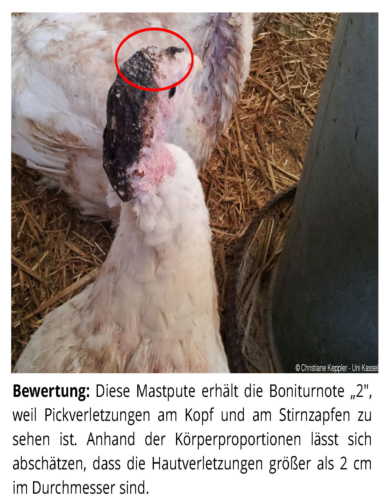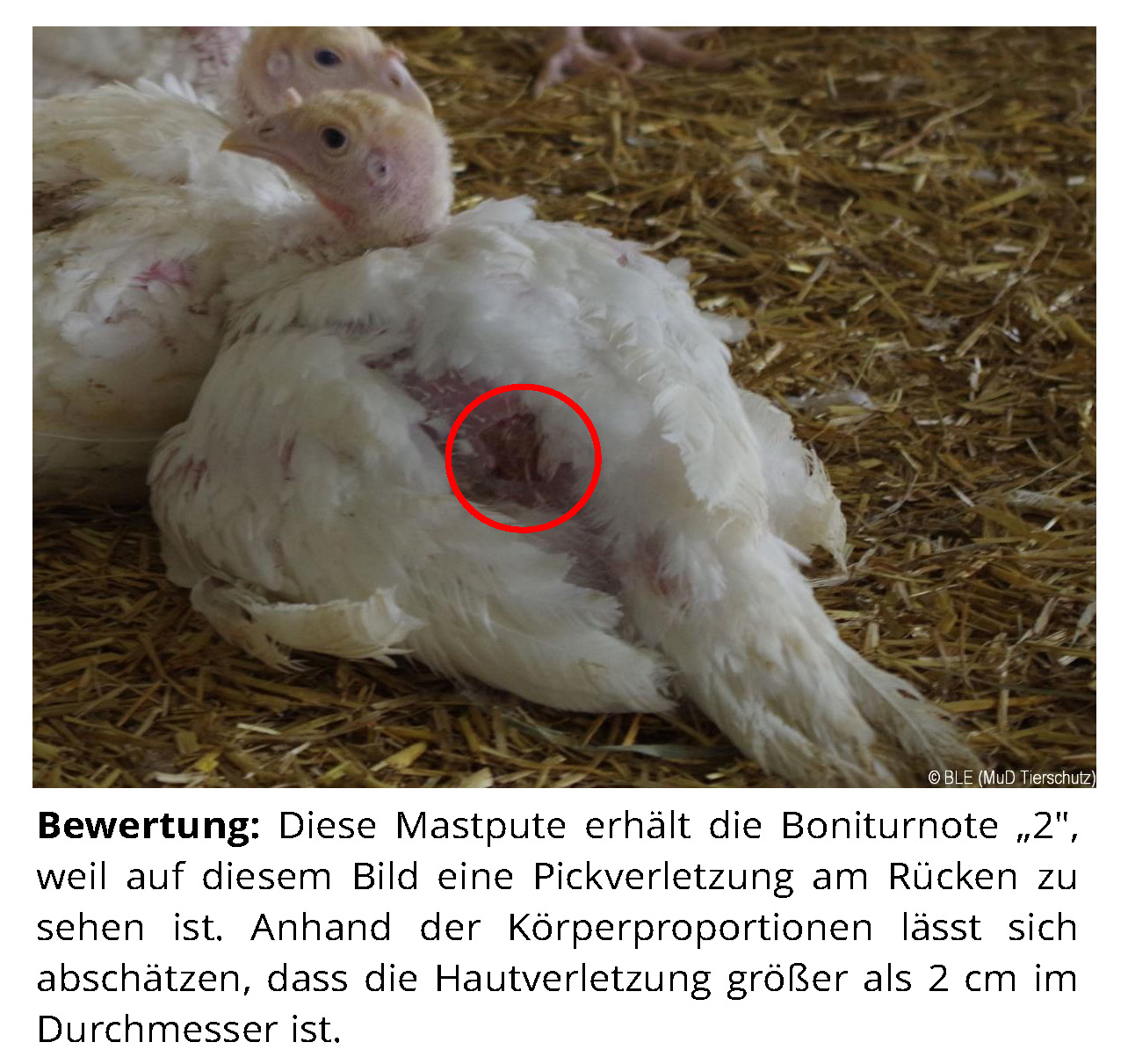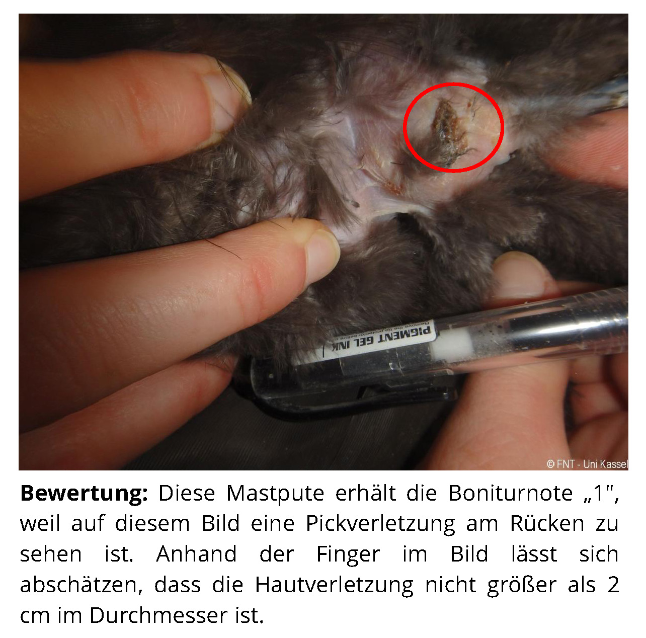 Das Zusatzmaterial für den Indikator "Hautverletzungen" soll dazu dienen, die erworbenen Kenntnisse anhand von Praxisbeispielen zu vertiefen. Zu diesem Zweck werden zu jeder Boniturstufe des Tierschutzindikators Praxisbilder gezeigt und weiterführende Informationen zum Hintergrund der jeweiligen Bewertung gegeben. Darüber hinaus werden Grenzfälle zwischen zwei Boniturnoten und Besonderheiten bei der Tierbeurteilung vorgestellt. Klicken Sie auf den blauen Link oberhalb der Abbildungen, um eine vergrößerte Ansicht inkl. der Bewertung zu erhalten.