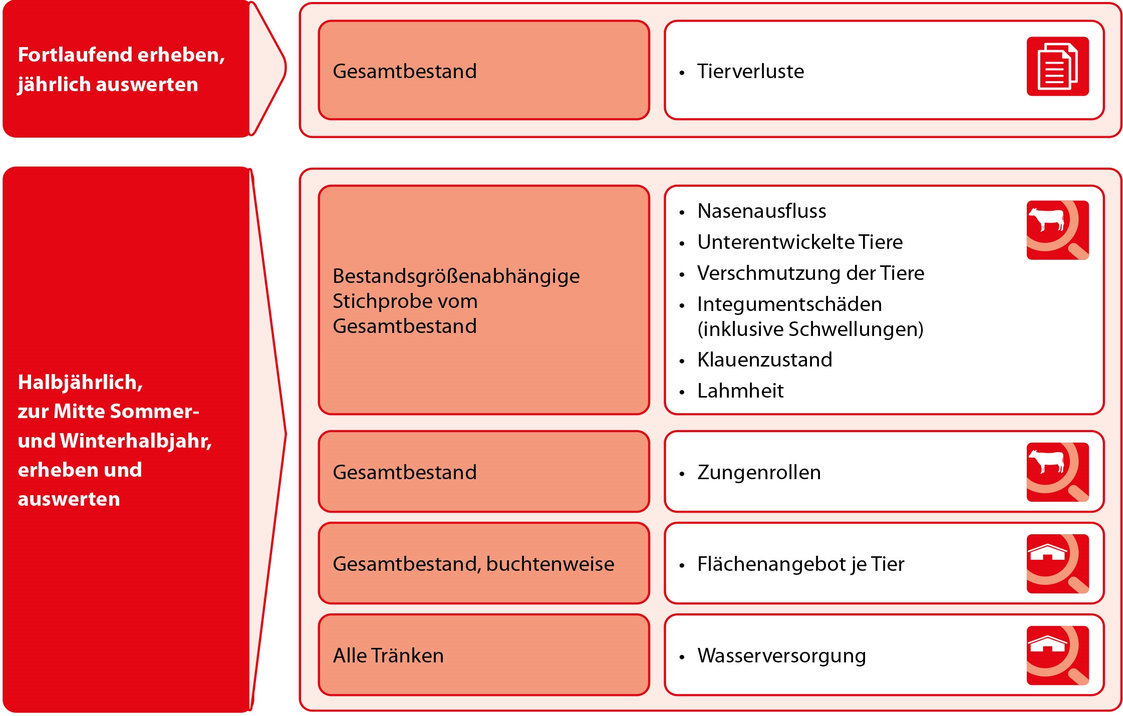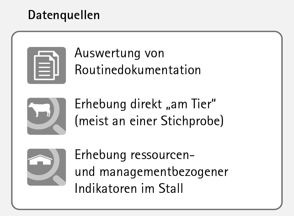 Sie können das Konzept auch für andere Produktionsrichtungen und Haltungssysteme, wie z.B. Mutterkuhhaltung, Freilandhaltung, Fresseraufzucht etc. verwenden. In diesem Fall wird empfohlen, eine Kombination verschiedener Indikatoren aus dem gesamten Leitfaden "Tierschutzindikatoren für die Praxis - Rind" zu verwenden (beispielsweise für Mutterkühe passende Indikatoren aus dem Kapitel 2 „Milchkühe“, für die Kälber oder Fresser analog Indikatoren aus dem Kapitel 3 „Aufzuchtkälber“) und diese um relevante Themenbereiche wie etwa Thermoregulierung (Unterstände bei Freilandhaltung, Sonnenschutz) oder Para-sitenmanagement zu ergänzen.