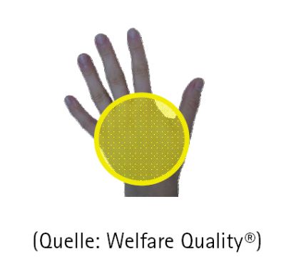Sobald das Tier Kotauflagerungen/-anhaftungen aufweist, die (egal ob frisch oder getrocknet) in der Summe eine mindestens handtellergroße Fläche ausmachen, vergeben Sie die Boniturnote 1 ("verschmutzt") für die entsprechende Region.