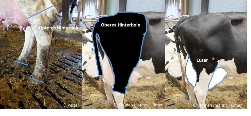 Inklusive des halben Euterspiegels der zu beurteilenden Seite von hinten.Beispiele für die Beurteilung der entsprechenden Regionen: