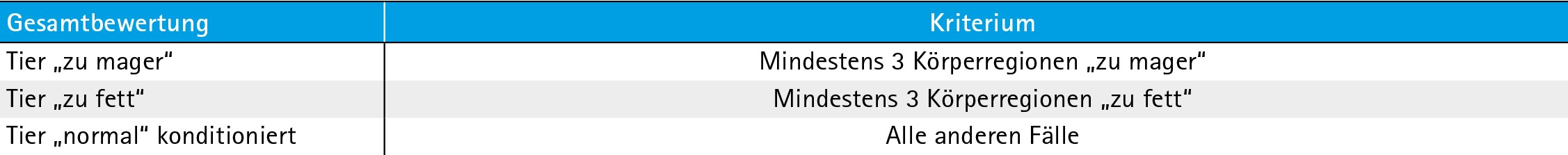 Hinweis: Die Excel®-Anwendung "Tierschutzindikatoren-Erhebung" übernimmt die Zuordnung der Gesamtbeurteilung automatisiert aus den Eingaben der vier Körperregionen.