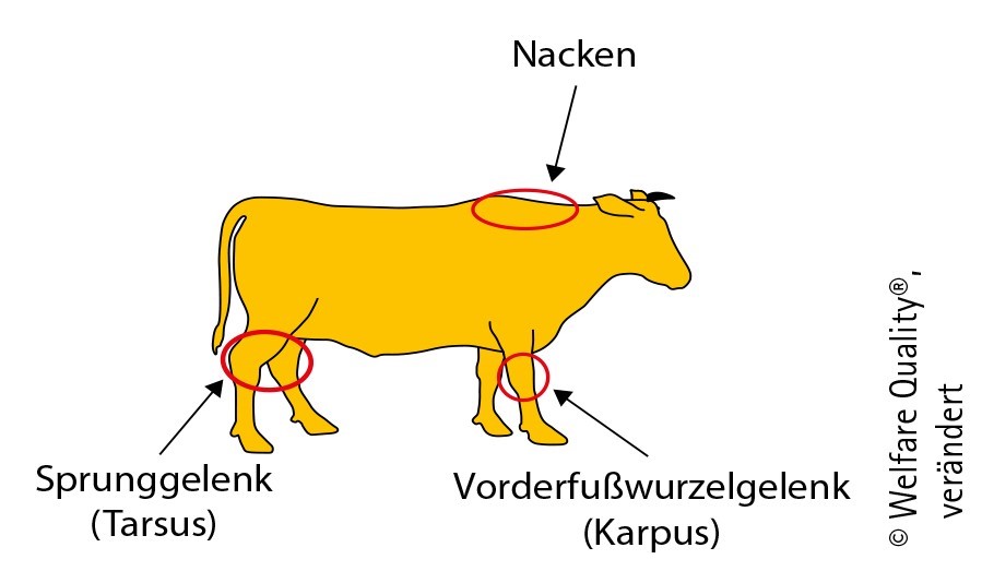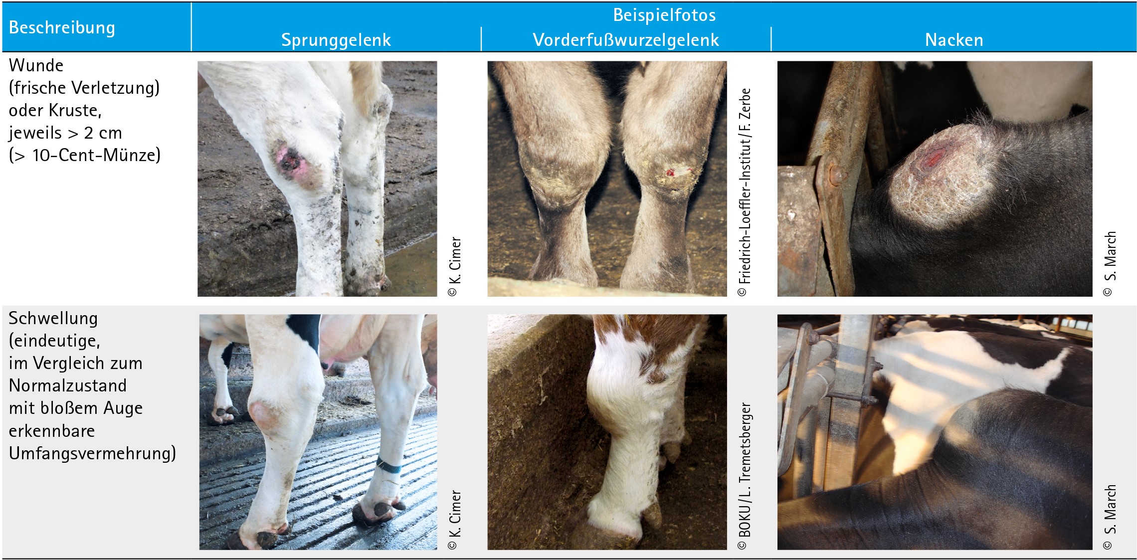 Sobald eine Wunde/Kruste oder eine deutlich erkennbare Umfangsvermehrung an den Gelenken oder am Nacken sichtbar ist, vergeben Sie die Boniturnote 1 für die jeweilige Körperregion und das jeweilige Tier.