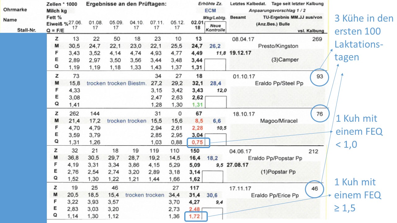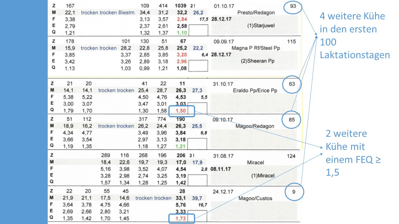 - die Anzahl Milchkühe mit einem Fett-Eiweiß-Quotient in der Milch von < 1,0 in den ersten 100 Laktationstagen.