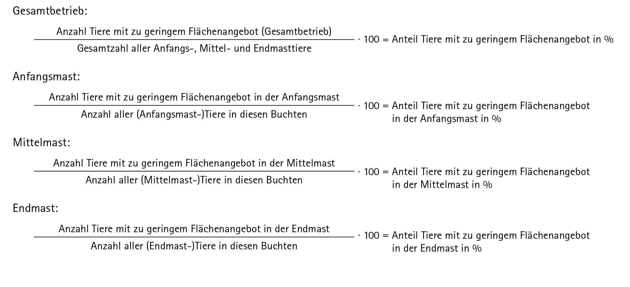 - Multiplizieren Sie mal 100 und erhalten Sie so den Anteil Tiere mit zu geringem Flächenangebot.