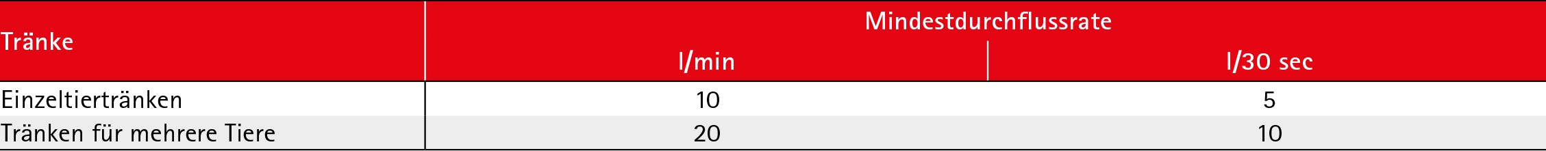 - Dabei sollten Einzeltiertränken (z.B. Schalentränken oder kleinere Trogtränken) eine erforderliche Mindestdurchflussmenge von 10 l/Minute aufweisen und Tränken, an denen gleichzeitig mehrere Tiere trinken können, eine Mindestdurchflussmenge von 20 l/Minute.