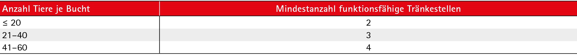 - Die Anzahl Tränkestellen ist unzureichend, wenn die in der Tabelle aufgeführten Mindestanforderungen nicht erfüllt werden. Für Gruppen ≤ 20 Mastrinder sollten 2 Tränkestellen vorhanden sein, die sowohl technisch als auch räumlich voneinander getrennt sind. Für je 20 weitere Mastrinder sollte eine zusätzliche Tränkestelle vorgehalten werden, die ebenfalls technisch und räumlich von den anderen getrennt sein muss.