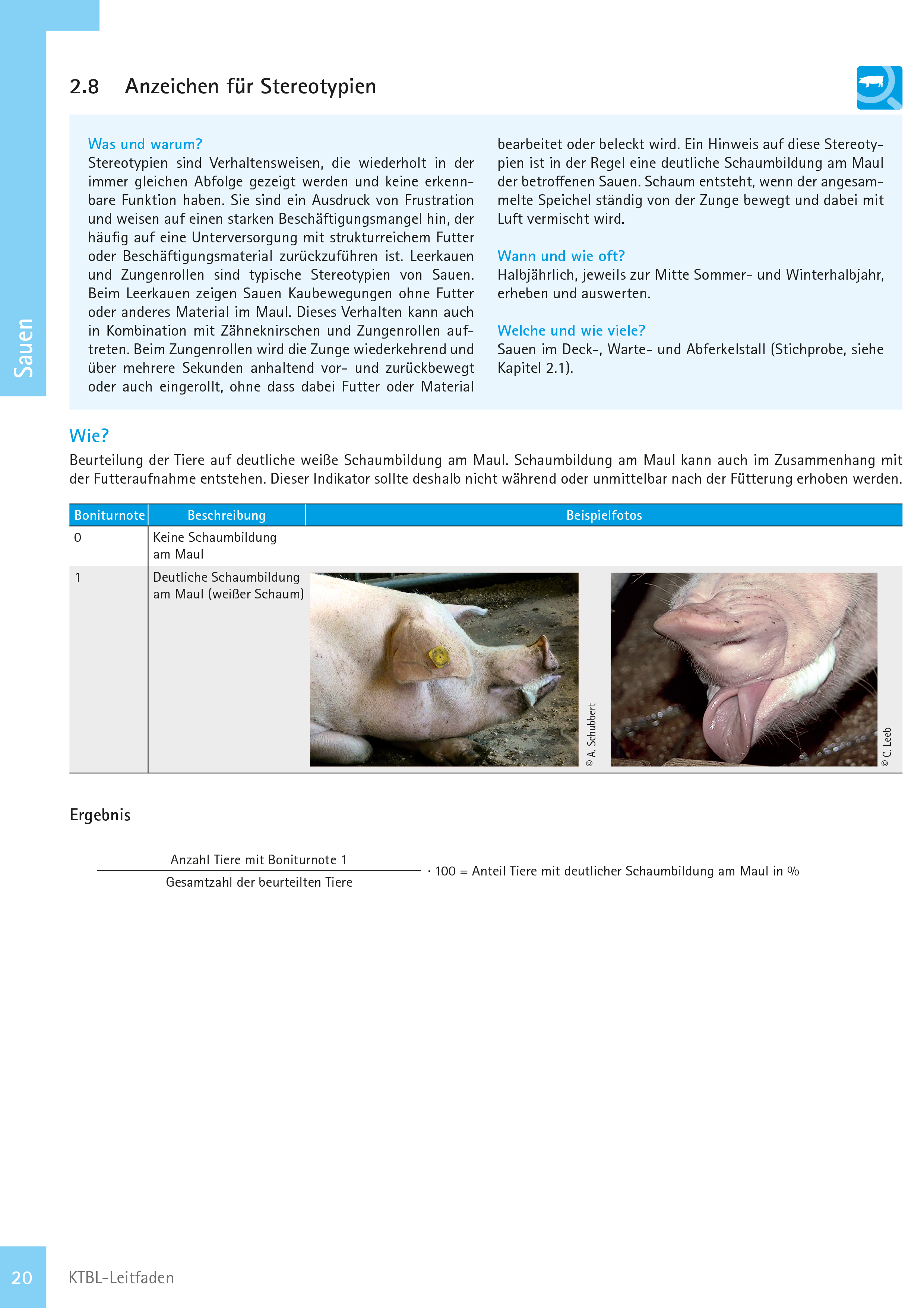 Stereotypien sind Verhaltensweisen, die wiederholt in der immer gleichen Abfolge gezeigt werden und keine erkennbare Funktion haben. Typische Stereotypien der Sauen sind Leerkauen und Zungenrollen. Ein Hinweis auf diese Stereotypien ist in der Regel eine deutliche Schaumbildung am Maul der betroffenen Sauen.